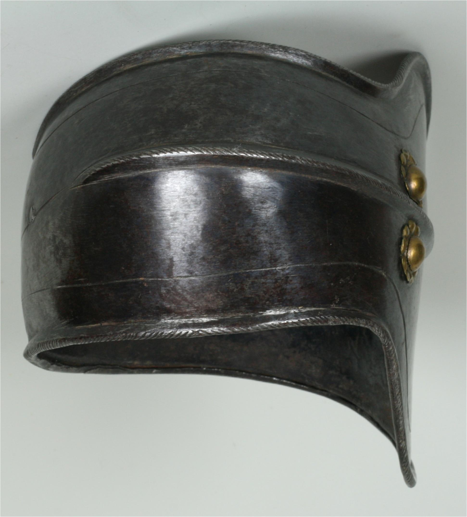 For the right elbow. Very finely formed with crisp detail and what is likely the remains of old blued finish over a partially ground rough from the hammer finish. This finish appears to be an original finish with very minimal wear. Outer edge and central band with extremely fine roping. Ex. Col. Stephen Granscay.