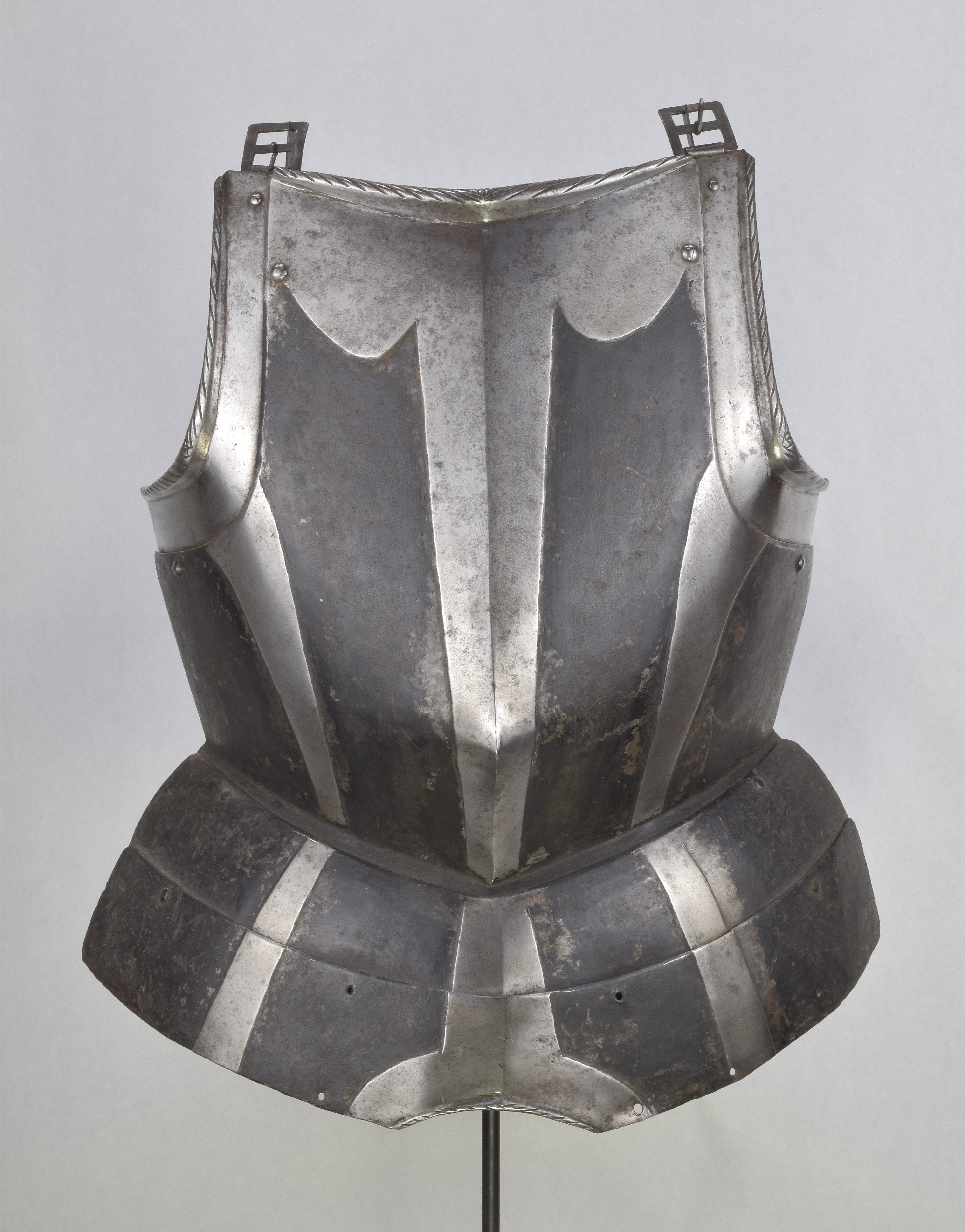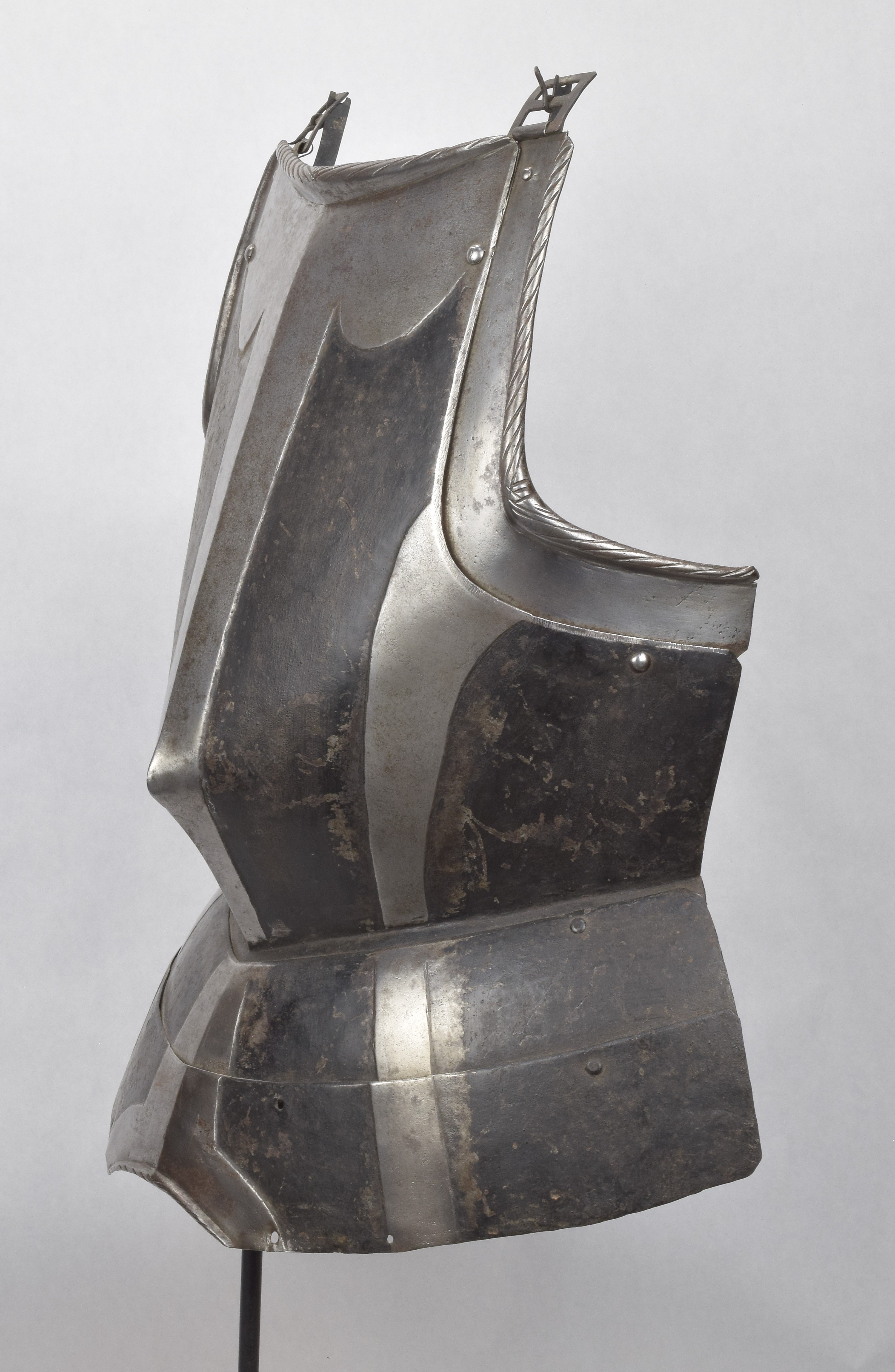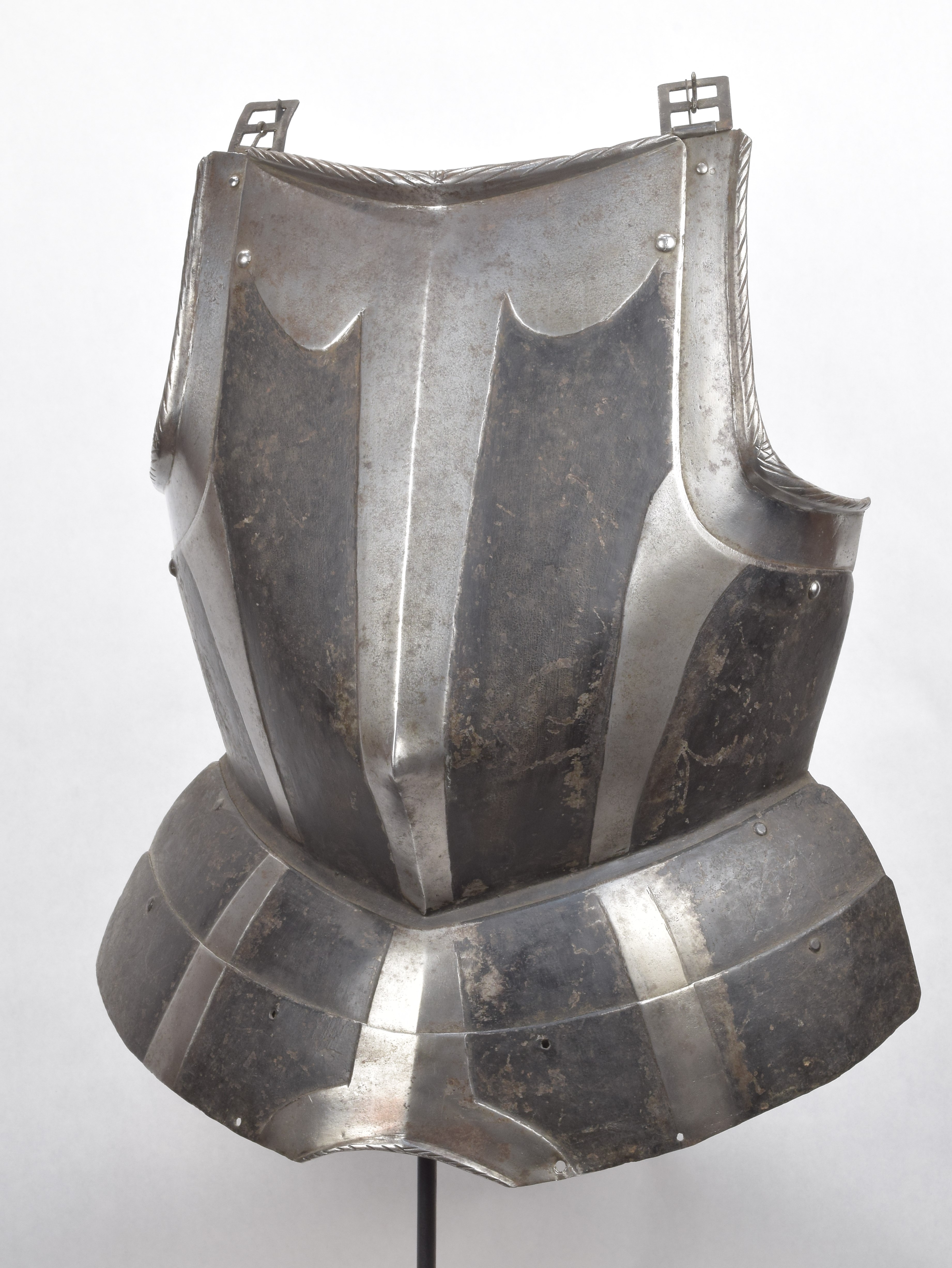 Breastplate. Black and white. Sliding gussets at the arm holes and 2 fauld lames. Drawn out to a blunted point somewhat below center. Rolls at the neck and arm holes tapering from the center and roped. Background rough from the hammer and painted black. Bands raised and polished. Central band tapering toward the waist on both the breast and fauld lames. One raised band on each side. Top of breastplate with wide scalloped raised area. Lower fauld lame with central arch cut out and rolled and roped edge. All parts originally part of the same piece. Buckles at the shoulder end of the arm gussets. Painted number 3946 in large numbers on the inside of the breast. A nice, basic, munition black and white breastplate from the mid 16th century.