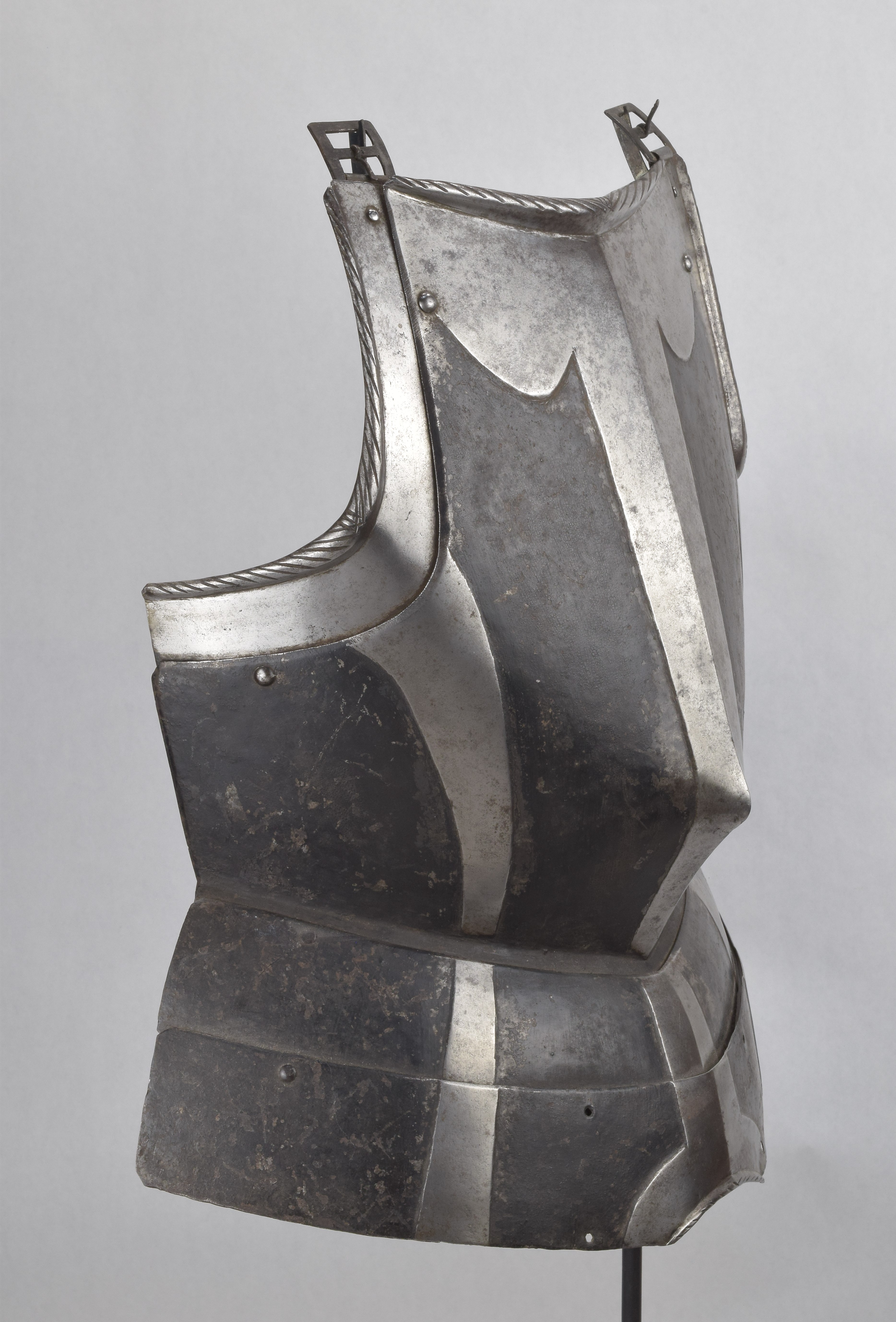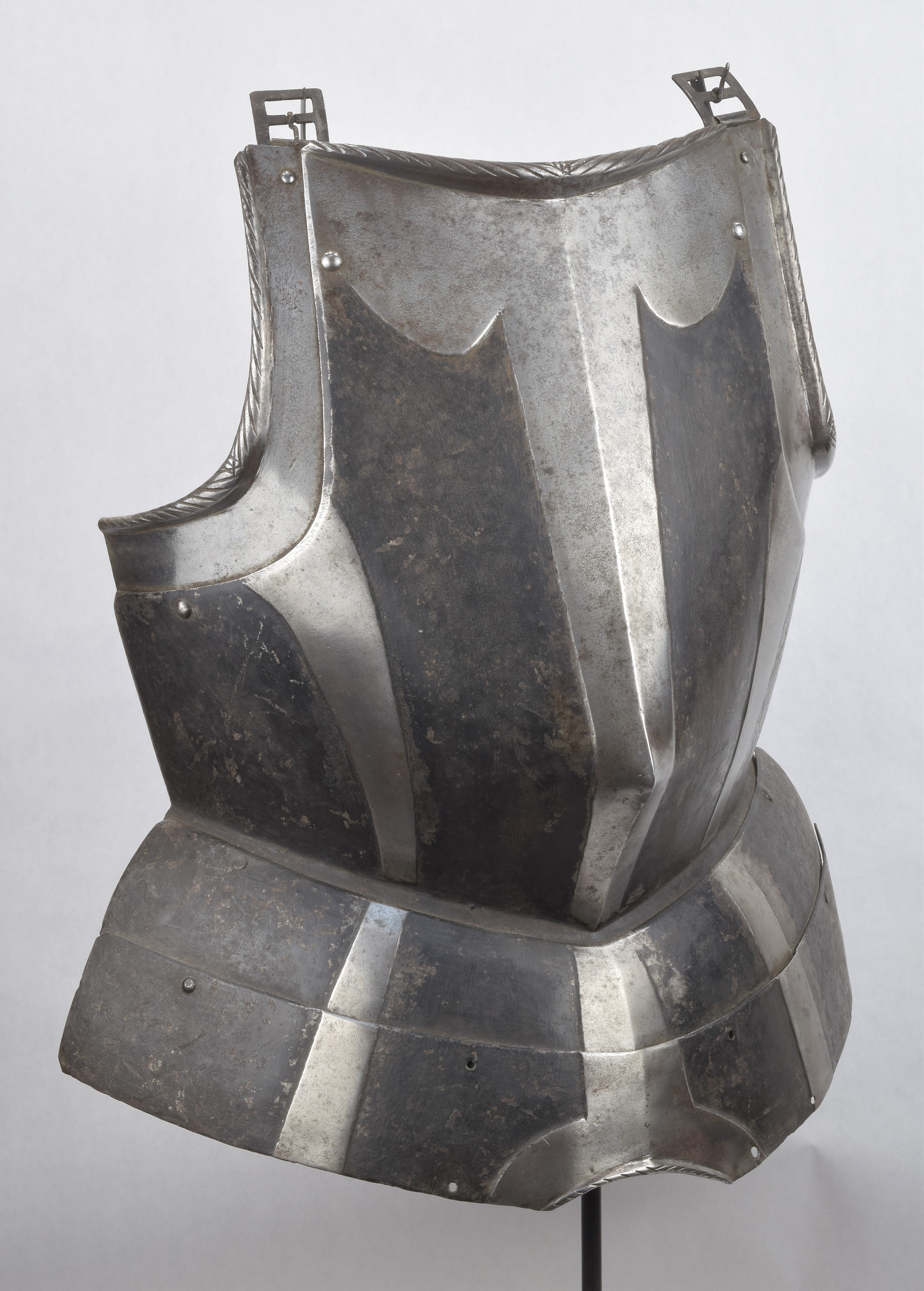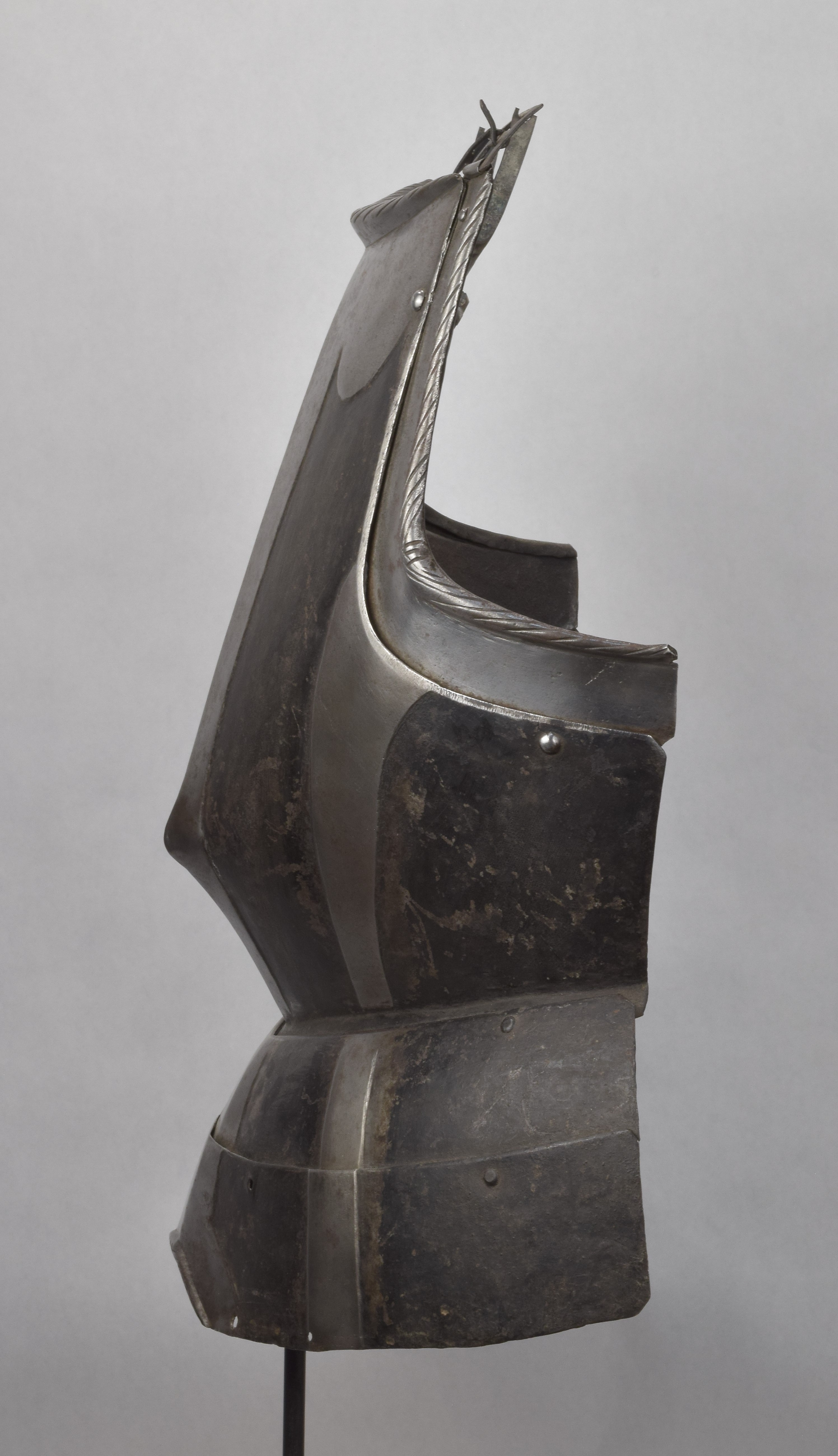 Breastplate. Black and white. Sliding gussets at the arm holes and 2 fauld lames. Drawn out to a blunted point somewhat below center. Rolls at the neck and arm holes tapering from the center and roped. Background rough from the hammer and painted black. Bands raised and polished. Central band tapering toward the waist on both the breast and fauld lames. One raised band on each side. Top of breastplate with wide scalloped raised area. Lower fauld lame with central arch cut out and rolled and roped edge. All parts originally part of the same piece. Buckles at the shoulder end of the arm gussets. Painted number 3946 in large numbers on the inside of the breast. A nice, basic, munition black and white breastplate from the mid 16th century.
