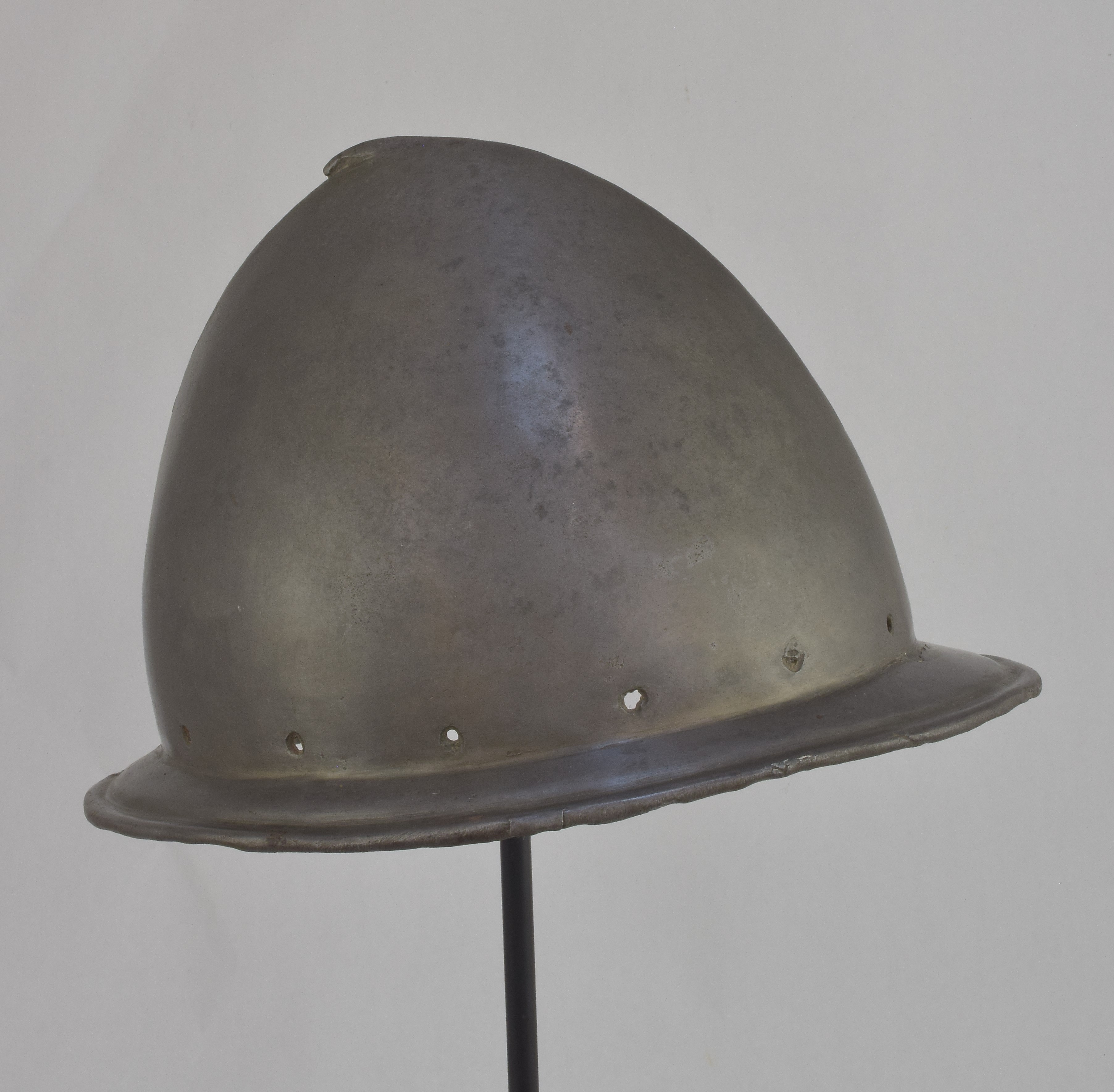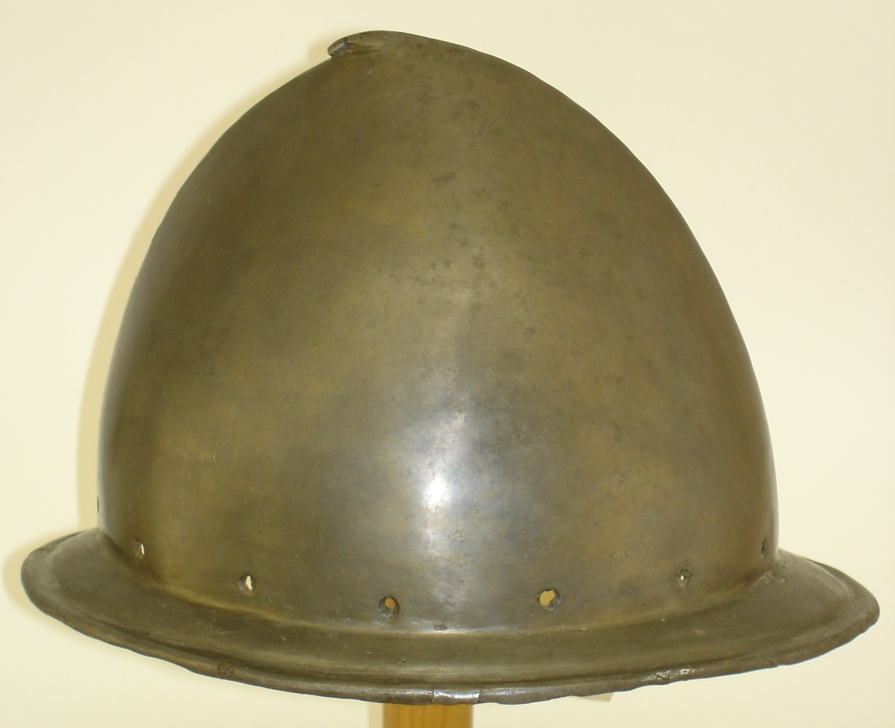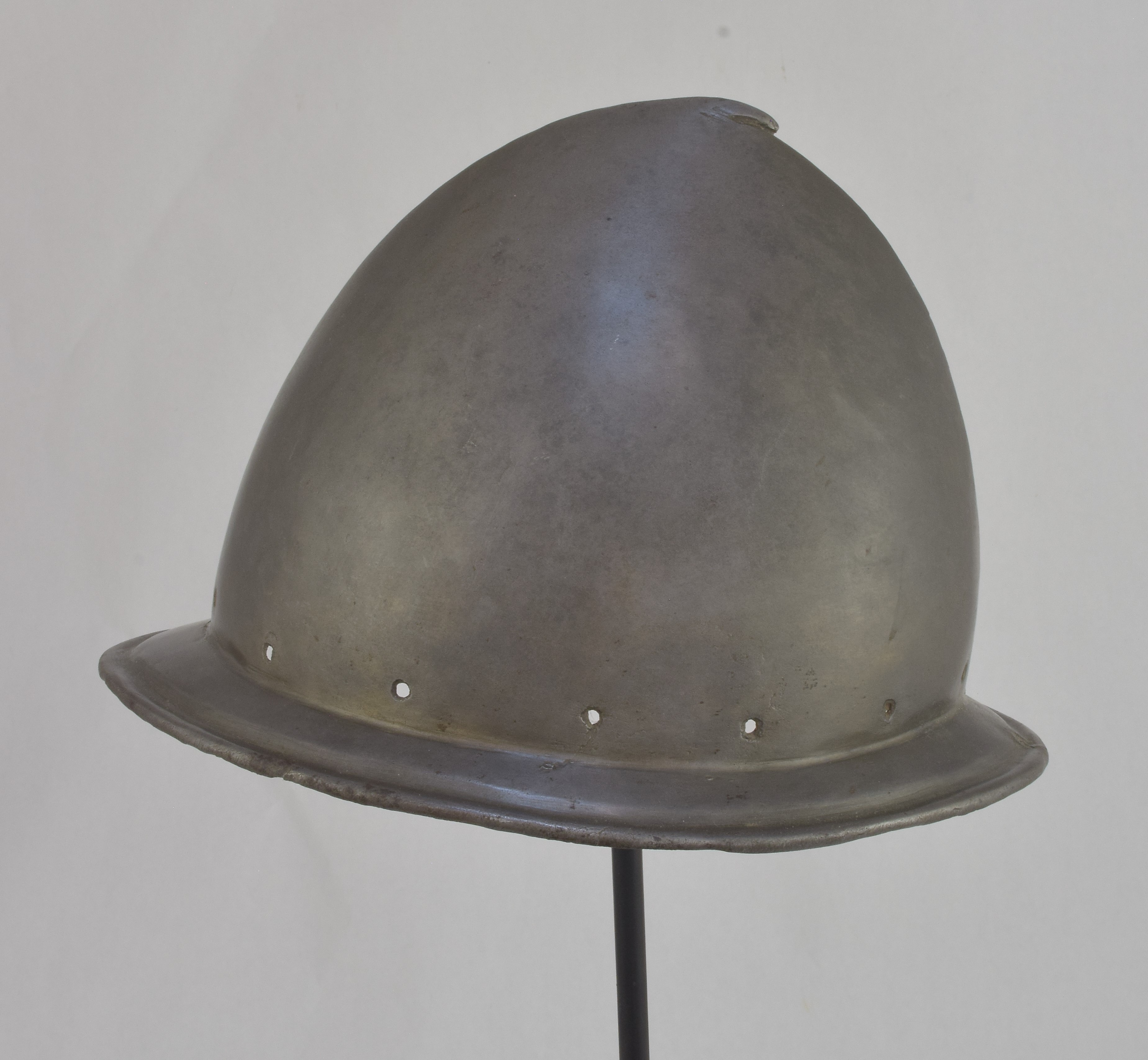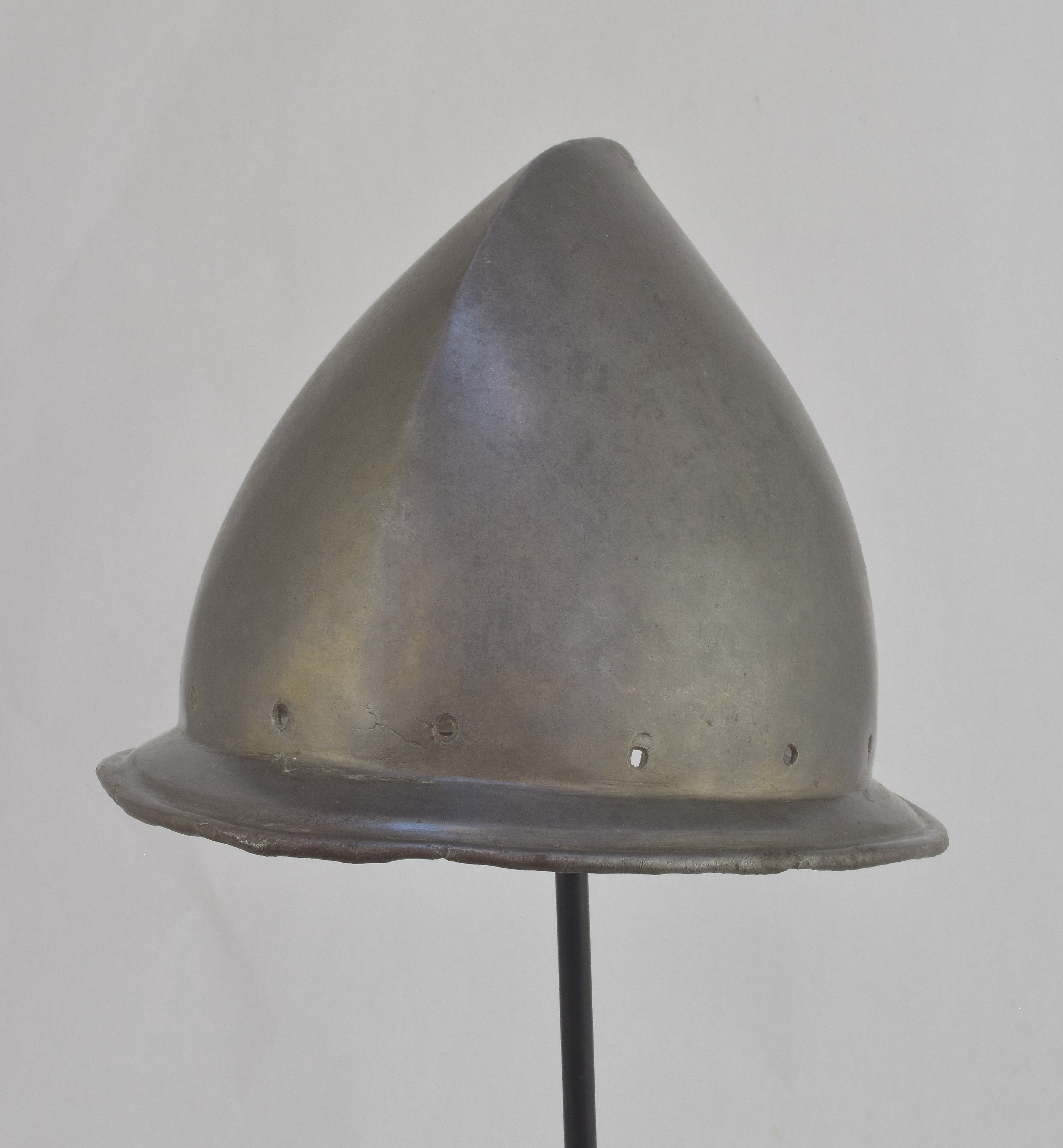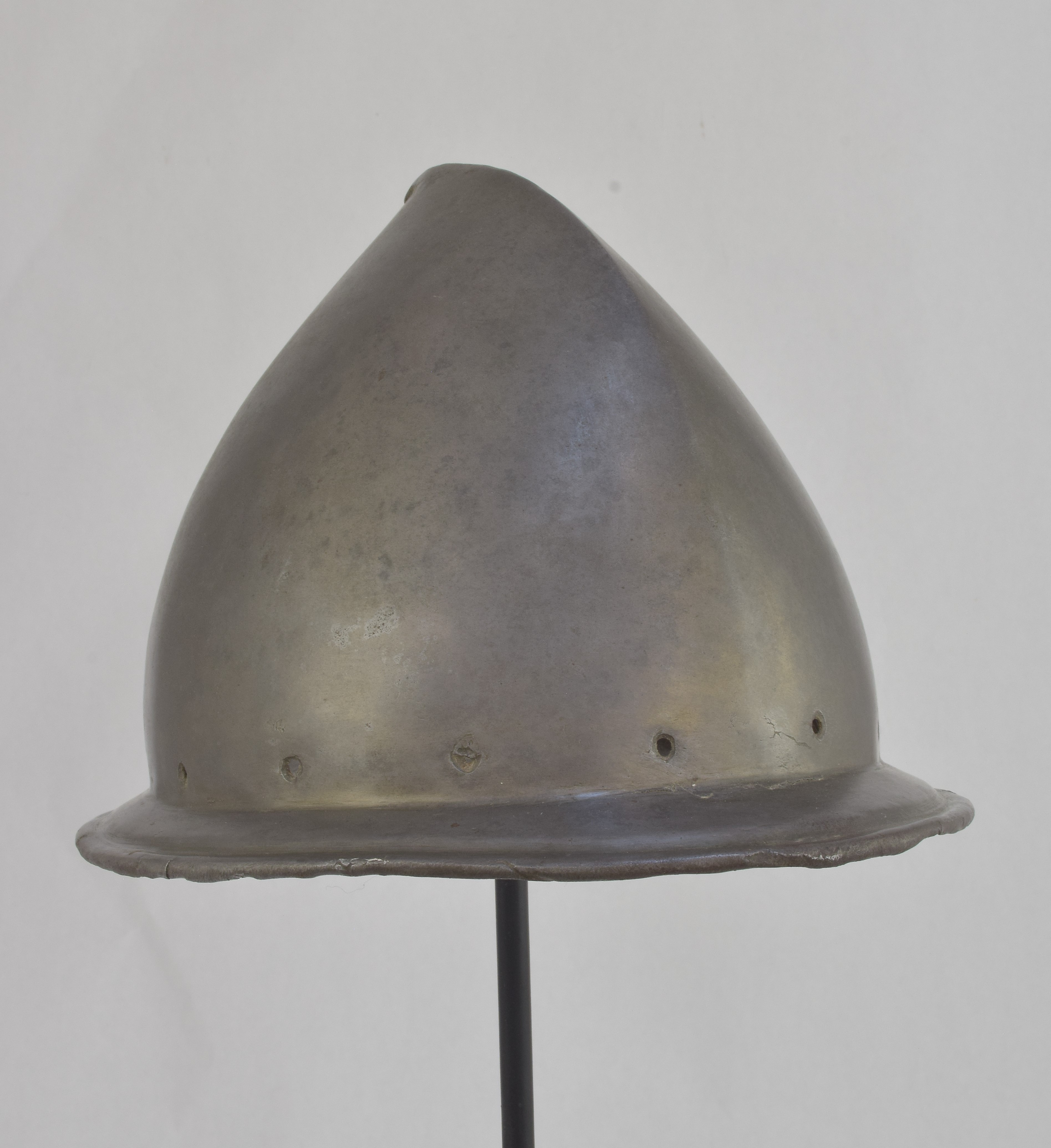 Rounded bowl formed in one piece rising to a slight point at the center of the top. Creased along the center and with a small stalk bent backwards at the point. Narrow brim slightly down turned. Brim with inward turn and narrow recess at the edge. Bottom of the helmet bowl with holes for lining rivets. 14 holes. Helmet 7 1/4 inches tall. Inside of bowl 7 inches wide and 8 1/4 inches long. Brim app. 1 inch wide at the sides and app. 1 1/4 inches wide at the front and back point. All lining rivets missing. Originally smooth finish retaining some old color - this may be the remains of a blued finish. The Royal Armouries bought one of this same series - IV.2018. It is marked with the purported Barberini mark, unlike this one which is unmarked. One of a very large series of morions from a hoard which were sold through Wallis and Wallis in small numbers from 1978 to 2003. The first such example appears to be 26-8 June 1978 lot 1354. This one sold 17 July 1996.