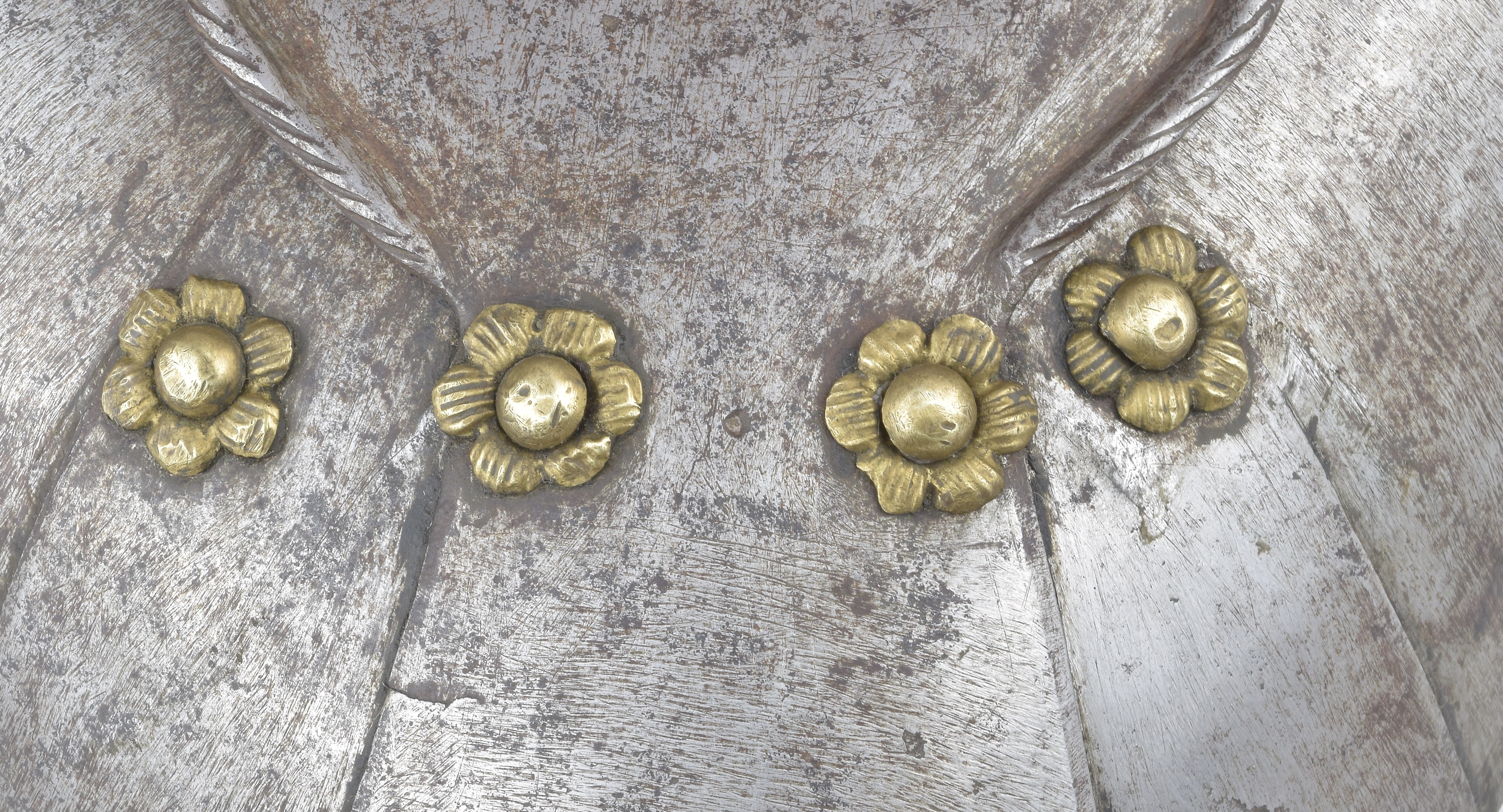 Right arm formed of a tubular upper cannon fitted with a turner of 2 lames. The upper and lower are secured by a raised, roped ridge in the upper that is engaged by a flare in the lower plate. The cop of bracelet form joined at the inside - the center of the flare - with a single lame above and below. The vambrace formed of an inner and outer plate secured by one inset hinge on the inside and two pins on the outside. The main edges with roped inward turns. Many of the rivets - primarily those on the visible side - are capped with dapped brass caps. The four outer (visible) articulation rivets have brass rosette washers. The arm has a typical Brunswick form with a crease along the outside. There is a small clip on the inside of the turner which would secure the pauldron strap. Ex. Royal House of Hanover.