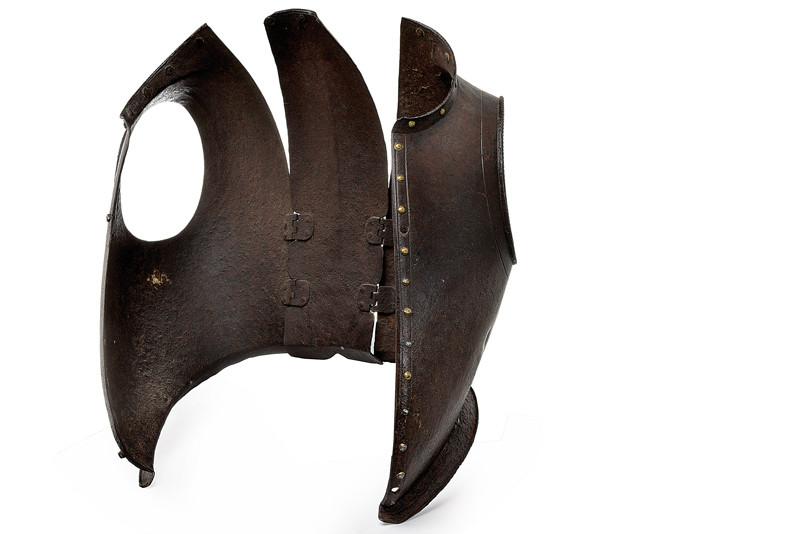 Italian. Full peasscod shape mimicing the doublet of the time. Formed in three pieces, one narrow one down the center of the back and two sides which join at the center of the front. The sections are secured by a pair of interior inset hinges in the lower portion of the back. Arm holes with outward turned roped rolls bordered by an engraved line. Neck and waist edges with inward turned finely roped rolls and bordered by single incised lines. The front is decorated with a series of false buttons formed of iron rivets with brass caps, a few of which have lost their caps. The cuirass is secured closed by means of two threaded studs on the interior plate that engage holes on the outer plate. Currently one of these holes is filled with a modern brass bolt. The top edge is formed into a low straight collar, the bottom edge is flared out below the waist. Shot proof thickness with what appears to be a proof mark on the left side. A nice example of a rare type of body armour. Several defenses of this type (etched) survive in the Wallace collection. There are a few plain ones in the Graz arsenal. These are normally thought of as light civilian armours or decorative, but there are several like this one that are definitely designed for protection against weapons used in warfare.