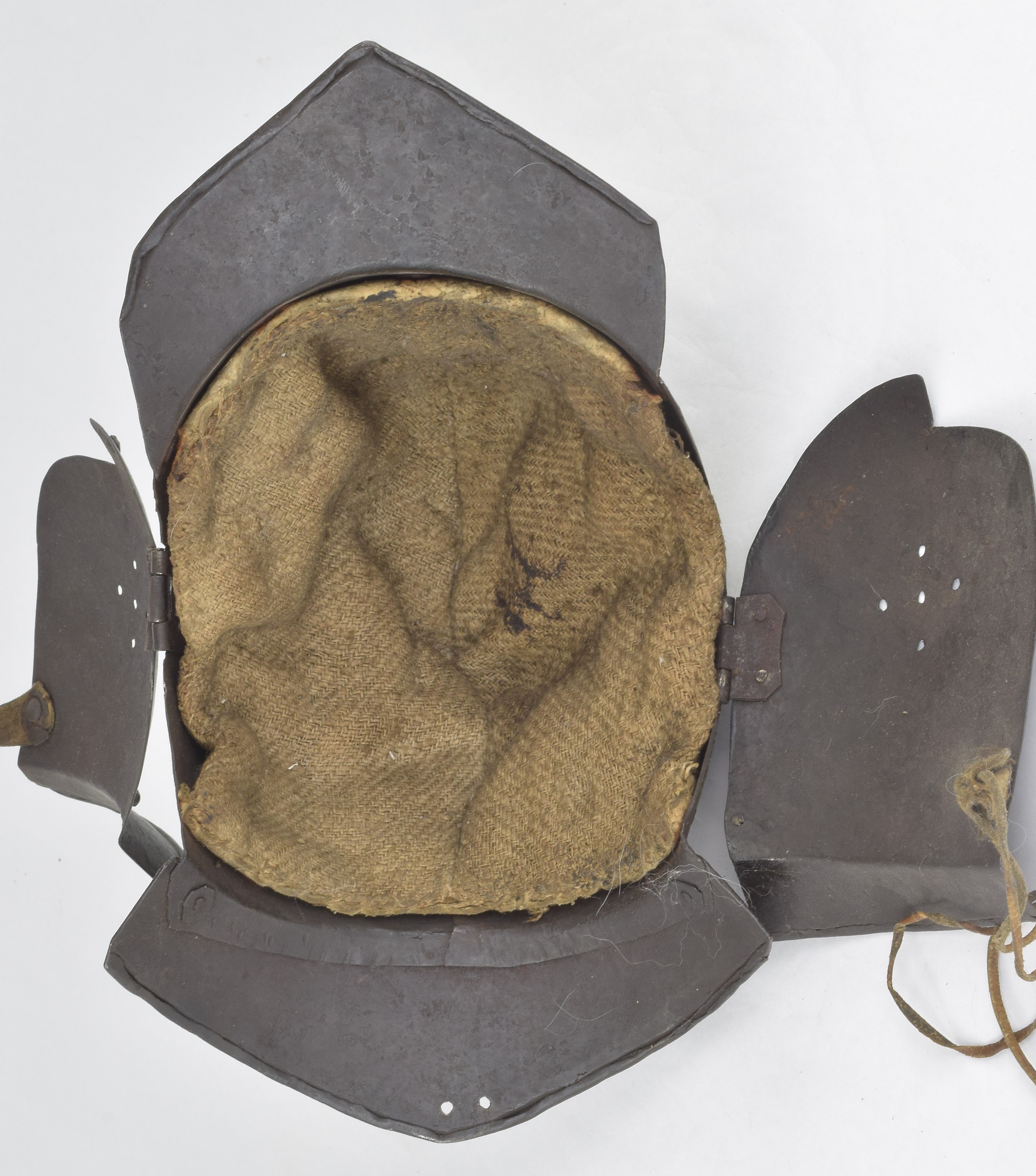 Two piece bowl joined at the center over a short, high central comb by a roll. The remainder joined by a flat riveted seam. The brim formed from a separate piece riveted to the inside of the front of the skull. The back of the skull with a neck guard formed of a single plate. Cheek plates with a flare continuing the line of the neck guard. Main edges with with plain inward turns. With old and probably working life lining quilted canvas lining stitched to leather strips at the forehead and neck. Cheek plates with loops at the lower corners used to secure a lace. The right cheek plate stamped with the number 197. Original black finish which has been refreshed with paint. Right cheek plate appears to have been reattached. Cheek plates secured at the chin in a common way - with a loop at the lower corner of each through which a thong is tied.