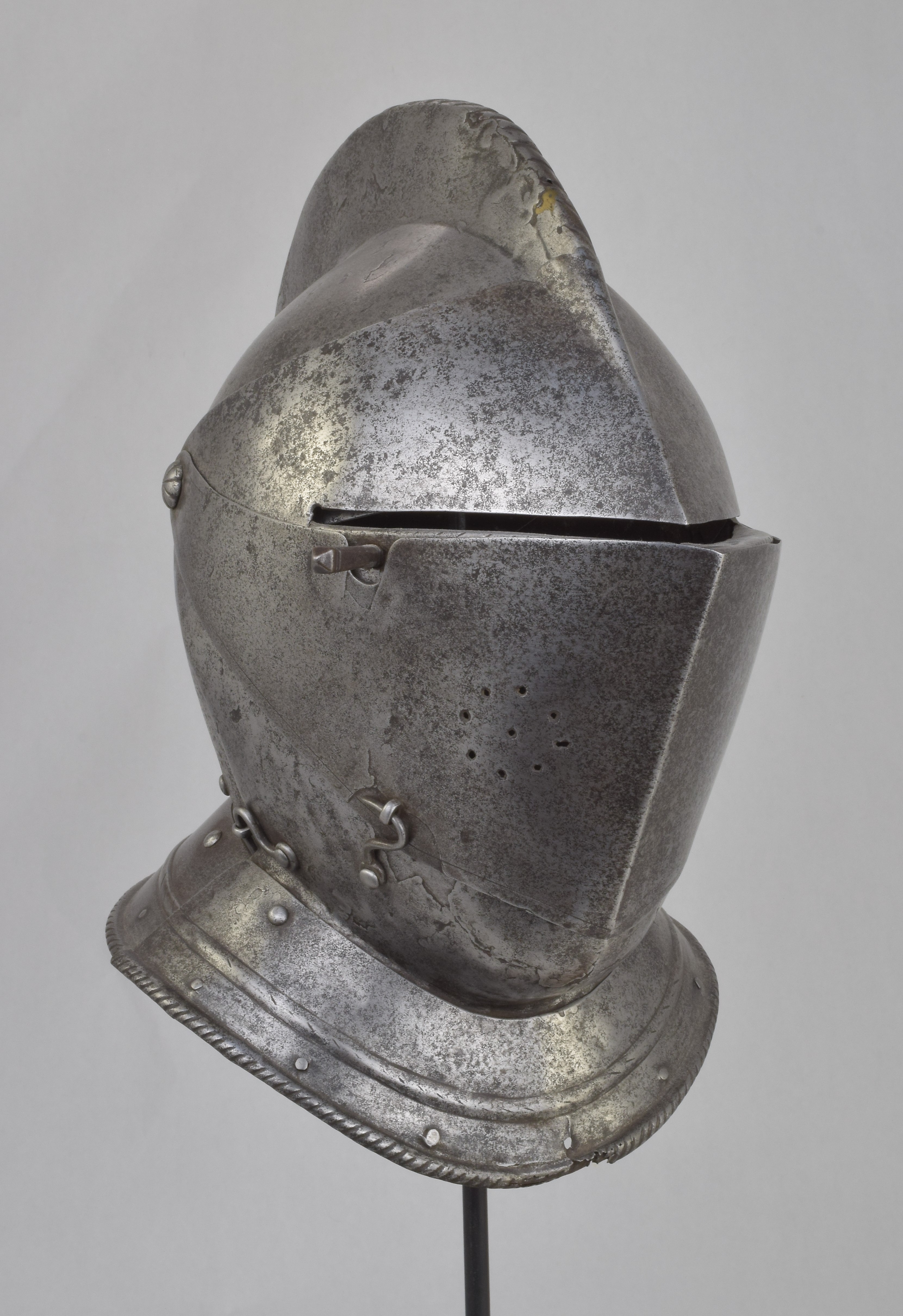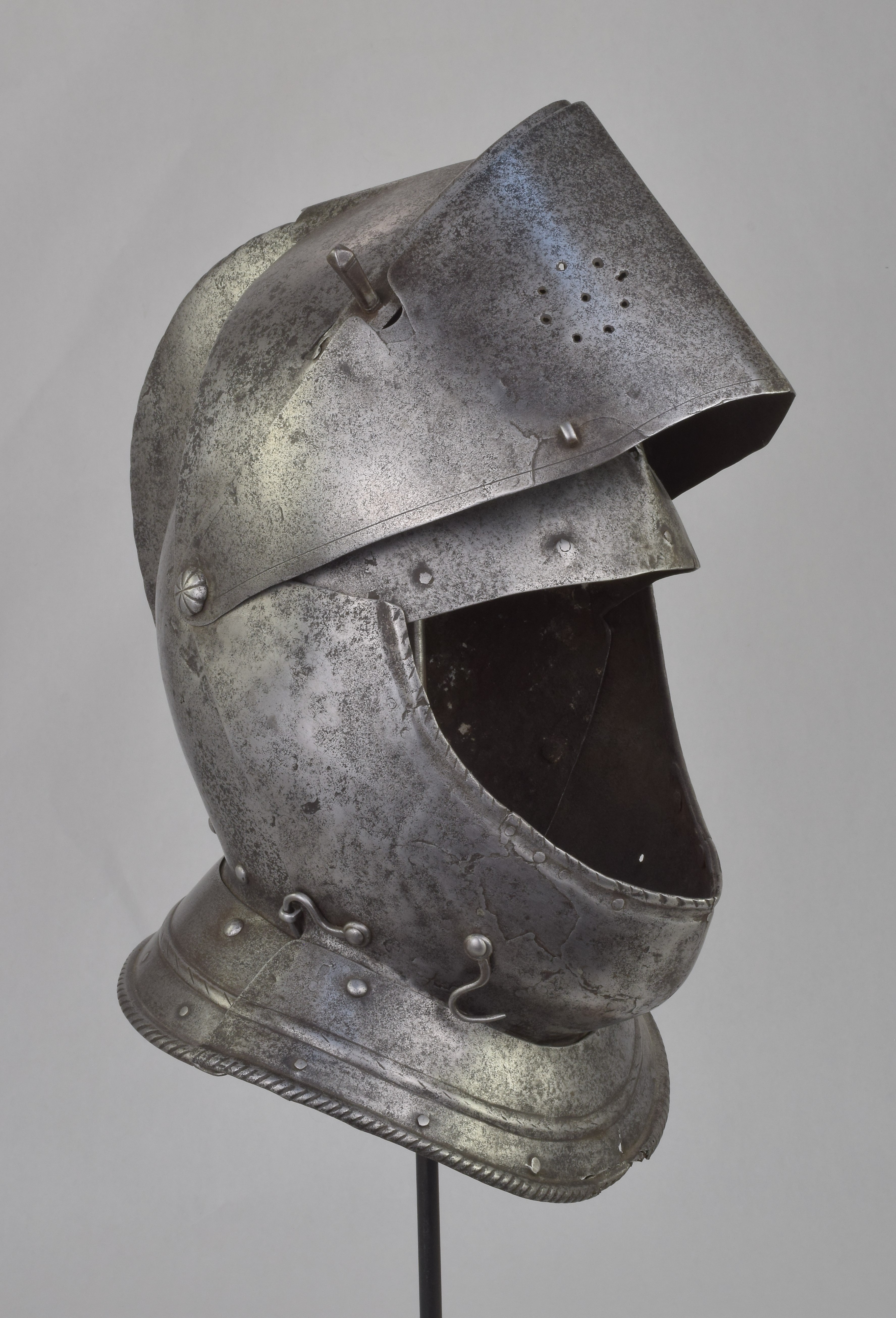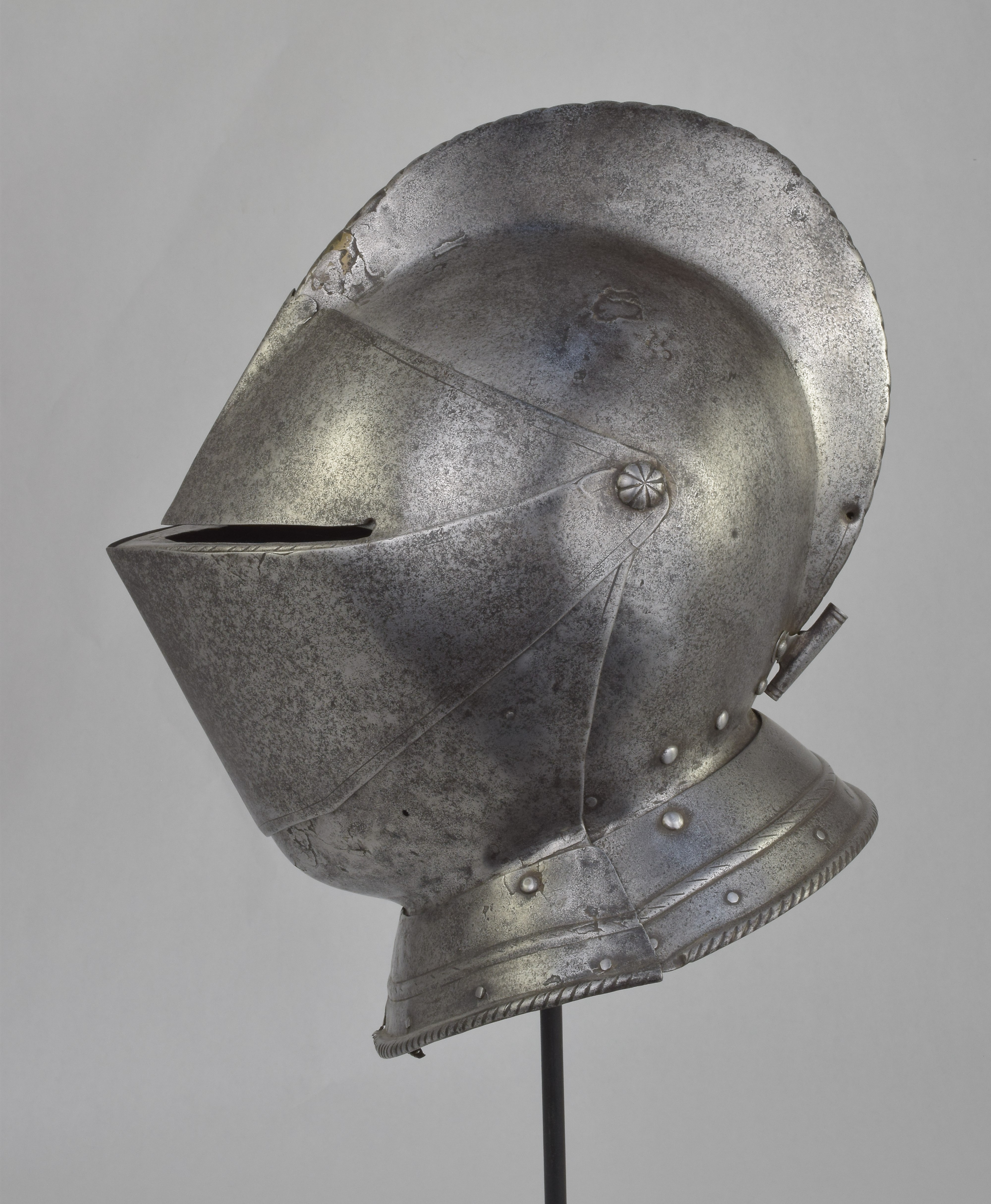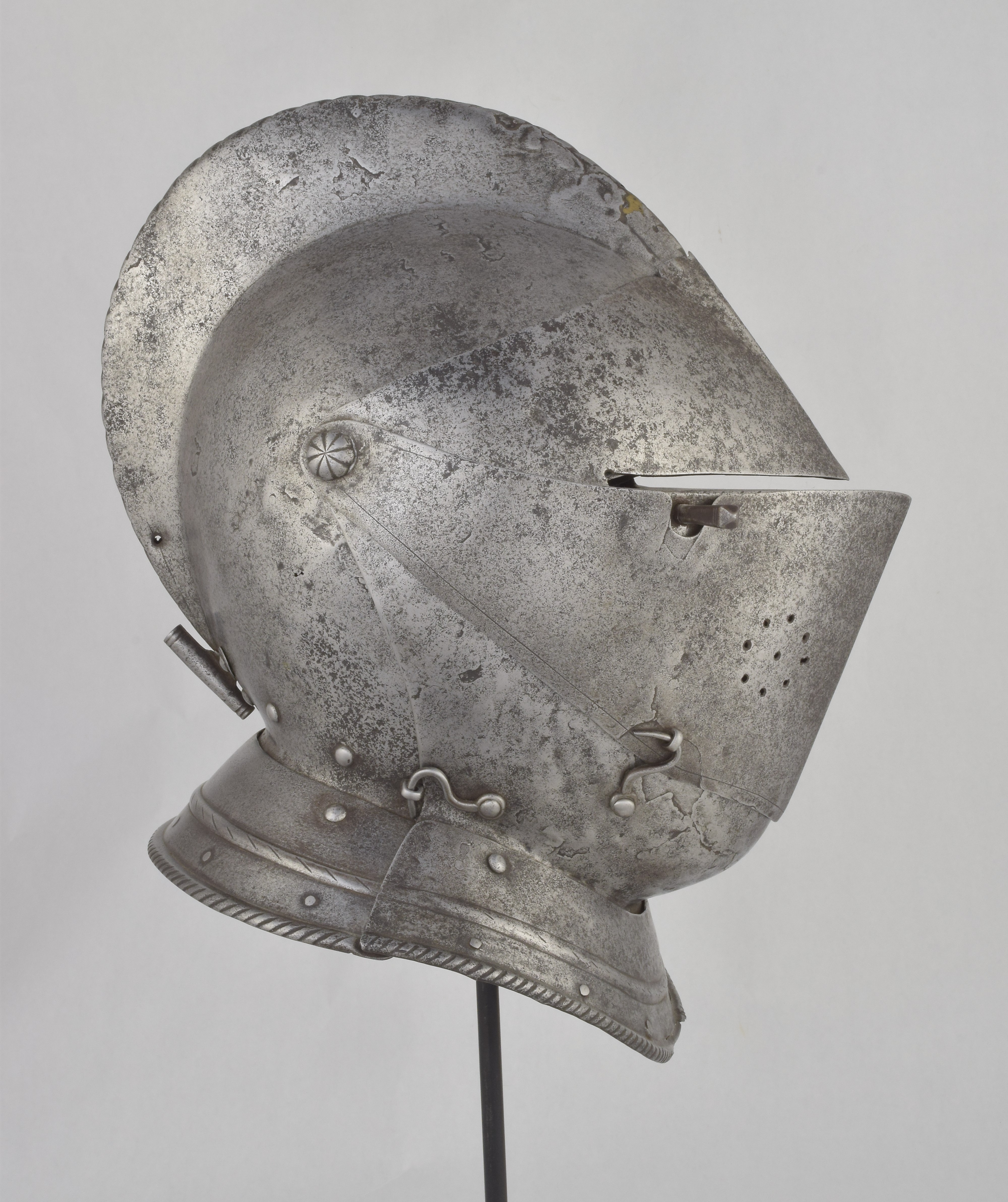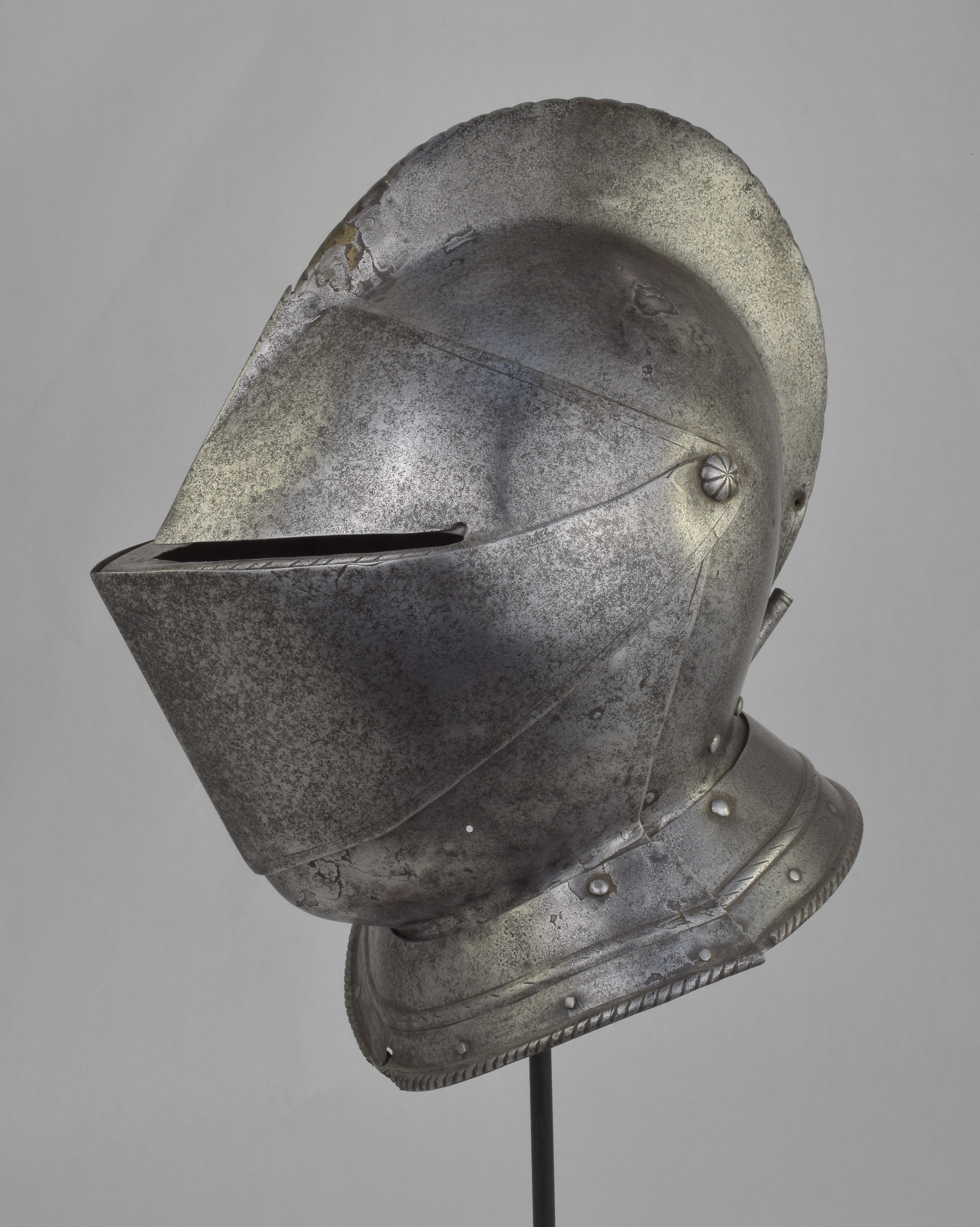 Italian or French. One piece skull with high roped comb, visor with single eye slit, ventail pierced with a circle of breaths on the right, and bevor. Bevor with roped inward turned roll at the edge of the face opening. Visor, ventail and bevor pivoted on common pivots. Bevor and ventail secured by hooks on the right. Visor and ventail decorated with single incised lines. Edge of the visor lightly roped. Lining rivets at the forhead and neck edges of the bowl. Front and back with single neck lames, each with outward turned roped border and an additional parallel raised ridge. Visor with lifting peg at the right. Good internal patches in the skull, bevor and ventail. The form of the visor (relatively flat and straight and without a central piece dividing the eyeslit) and ventail (mostly flat without additional form at the pivots or corners of the eye) is similar to the form of the helmets on the French armors that survive in the Musee de L'Armee. It is likely that the rear neck lame is a replacement and the front lame may originally have been from the rear.
