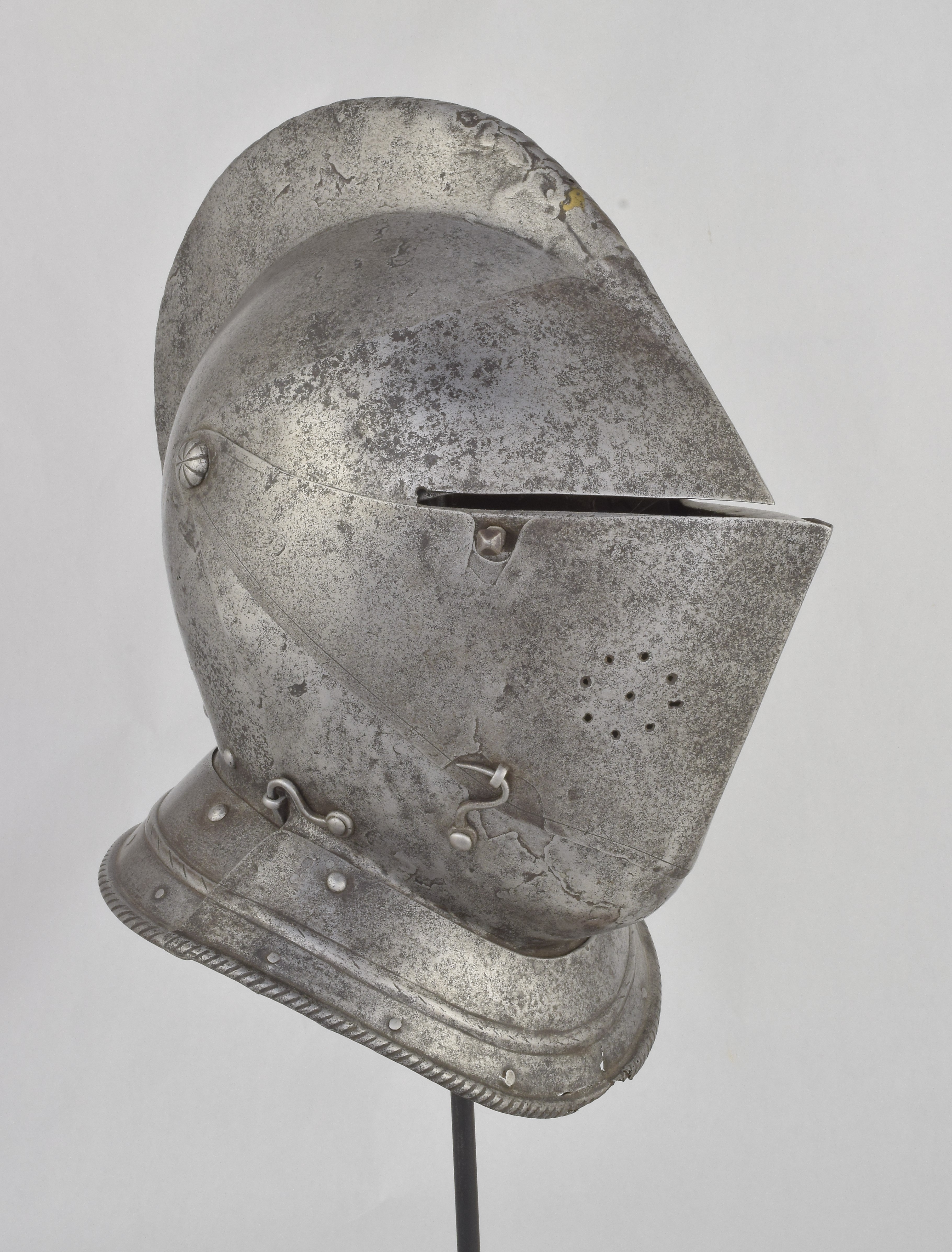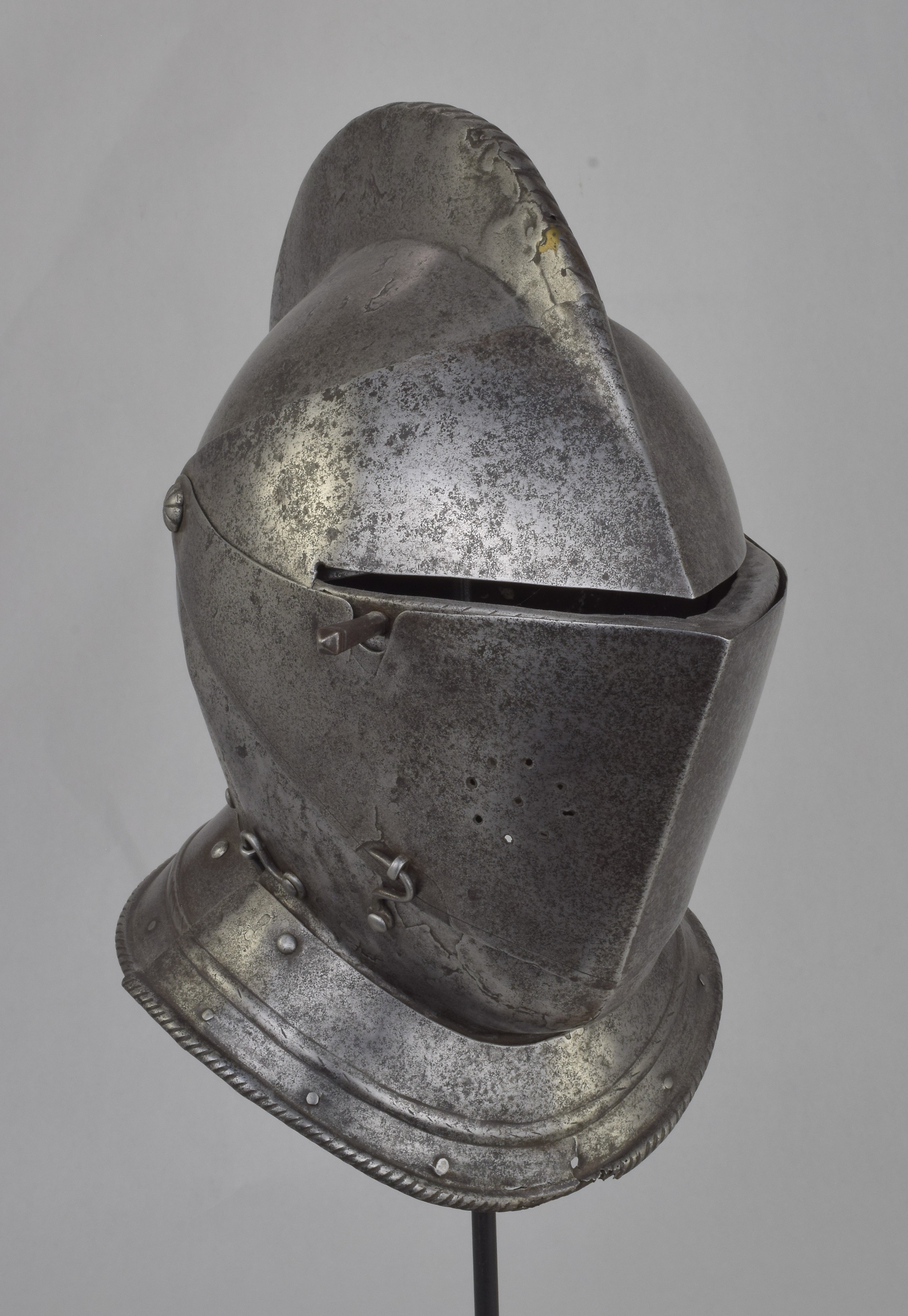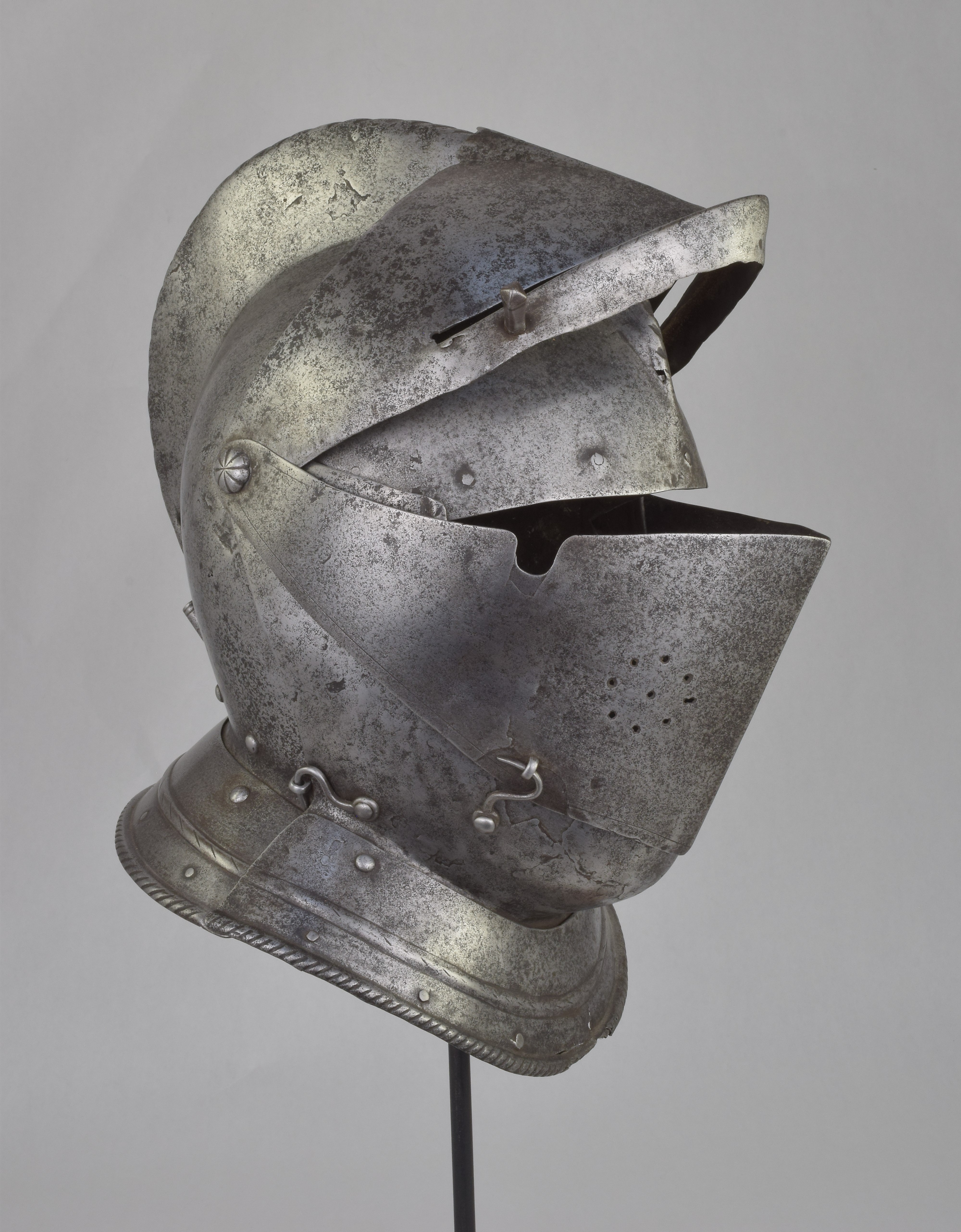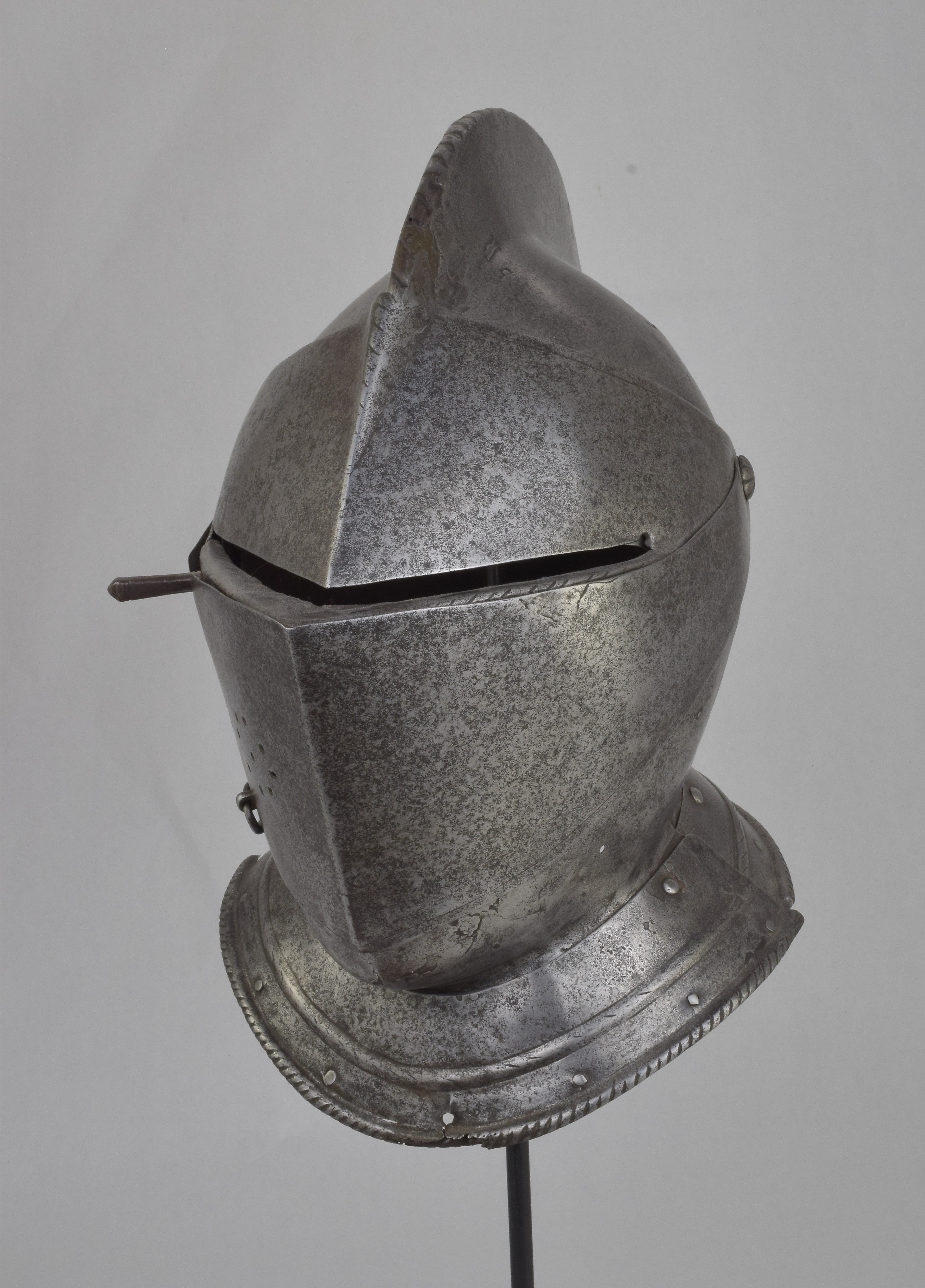 Italian or French. One piece skull with high roped comb, visor with single eye slit, ventail pierced with a circle of breaths on the right, and bevor. Bevor with roped inward turned roll at the edge of the face opening. Visor, ventail and bevor pivoted on common pivots. Bevor and ventail secured by hooks on the right. Visor and ventail decorated with single incised lines. Edge of the visor lightly roped. Lining rivets at the forhead and neck edges of the bowl. Front and back with single neck lames, each with outward turned roped border and an additional parallel raised ridge. Visor with lifting peg at the right. Good internal patches in the skull, bevor and ventail. The form of the visor (relatively flat and straight and without a central piece dividing the eyeslit) and ventail (mostly flat without additional form at the pivots or corners of the eye) is similar to the form of the helmets on the French armors that survive in the Musee de L'Armee. It is likely that the rear neck lame is a replacement and the front lame may originally have been from the rear.