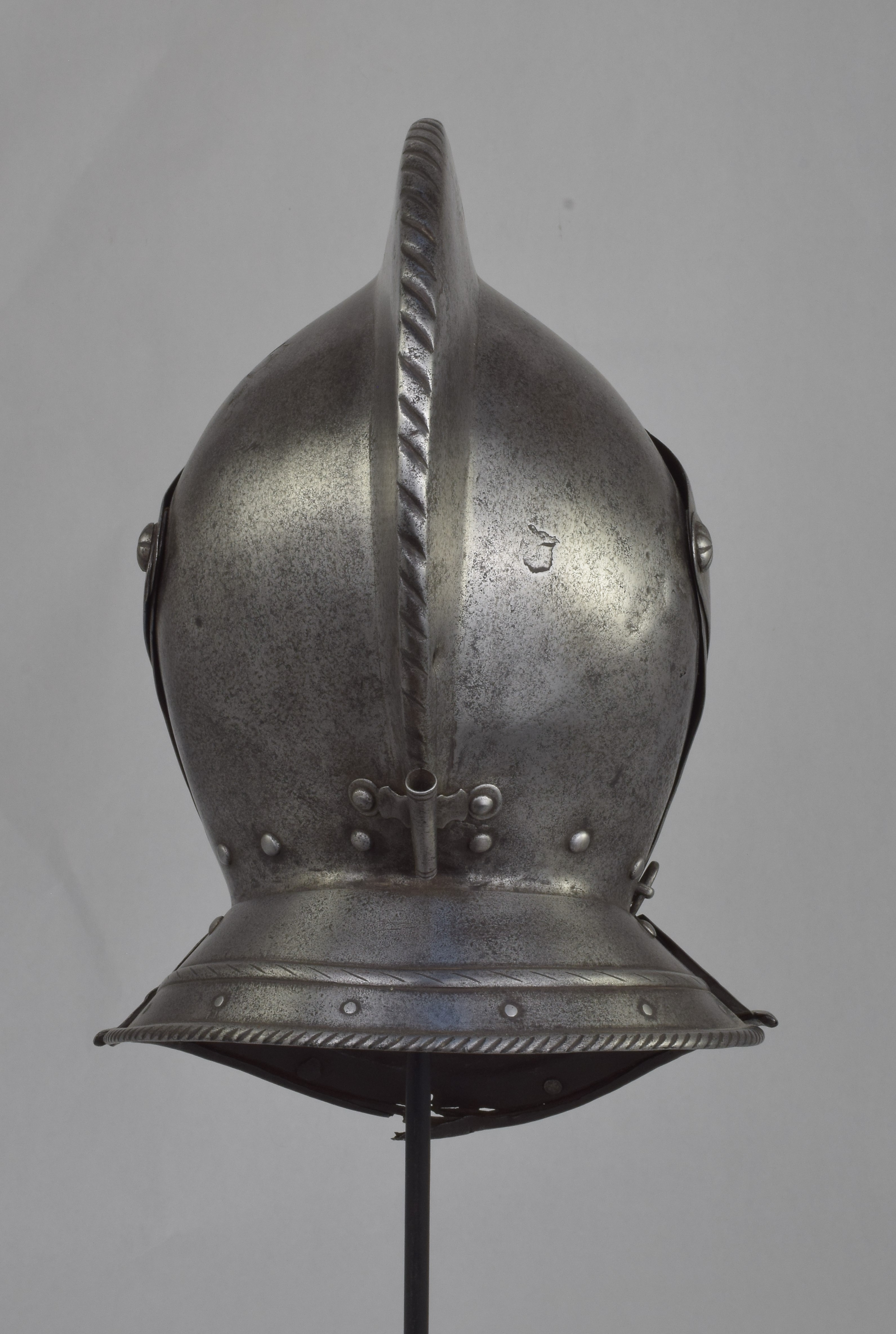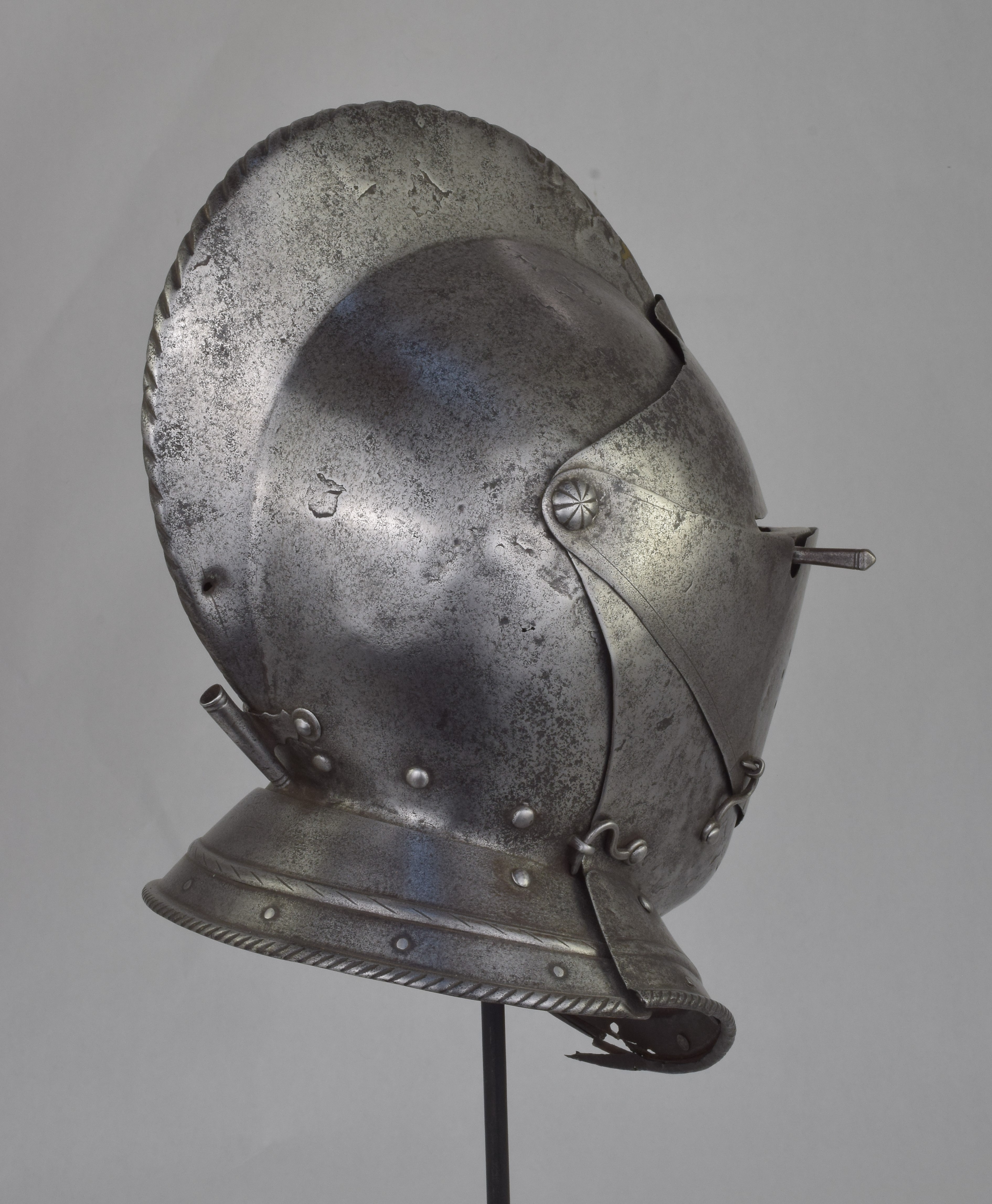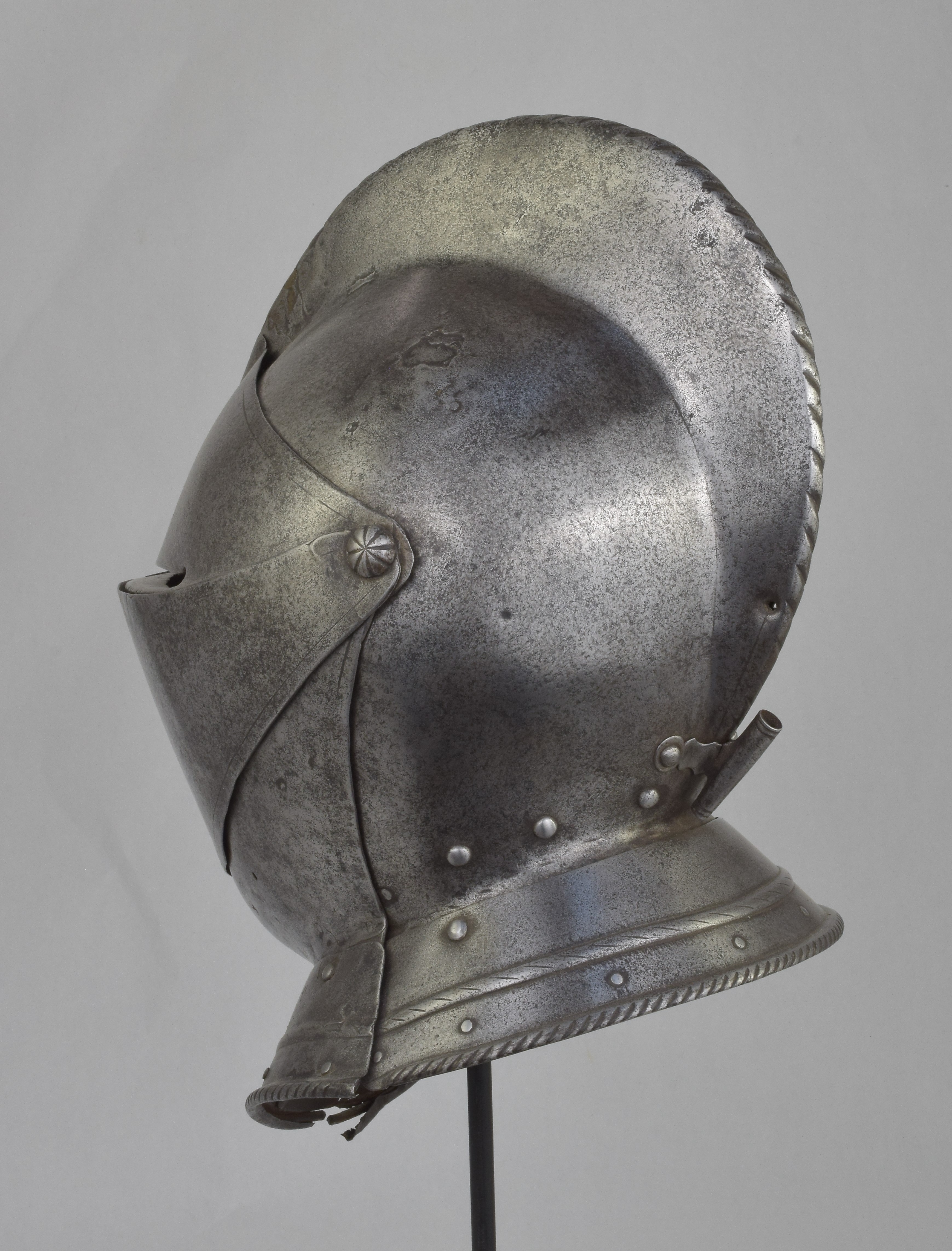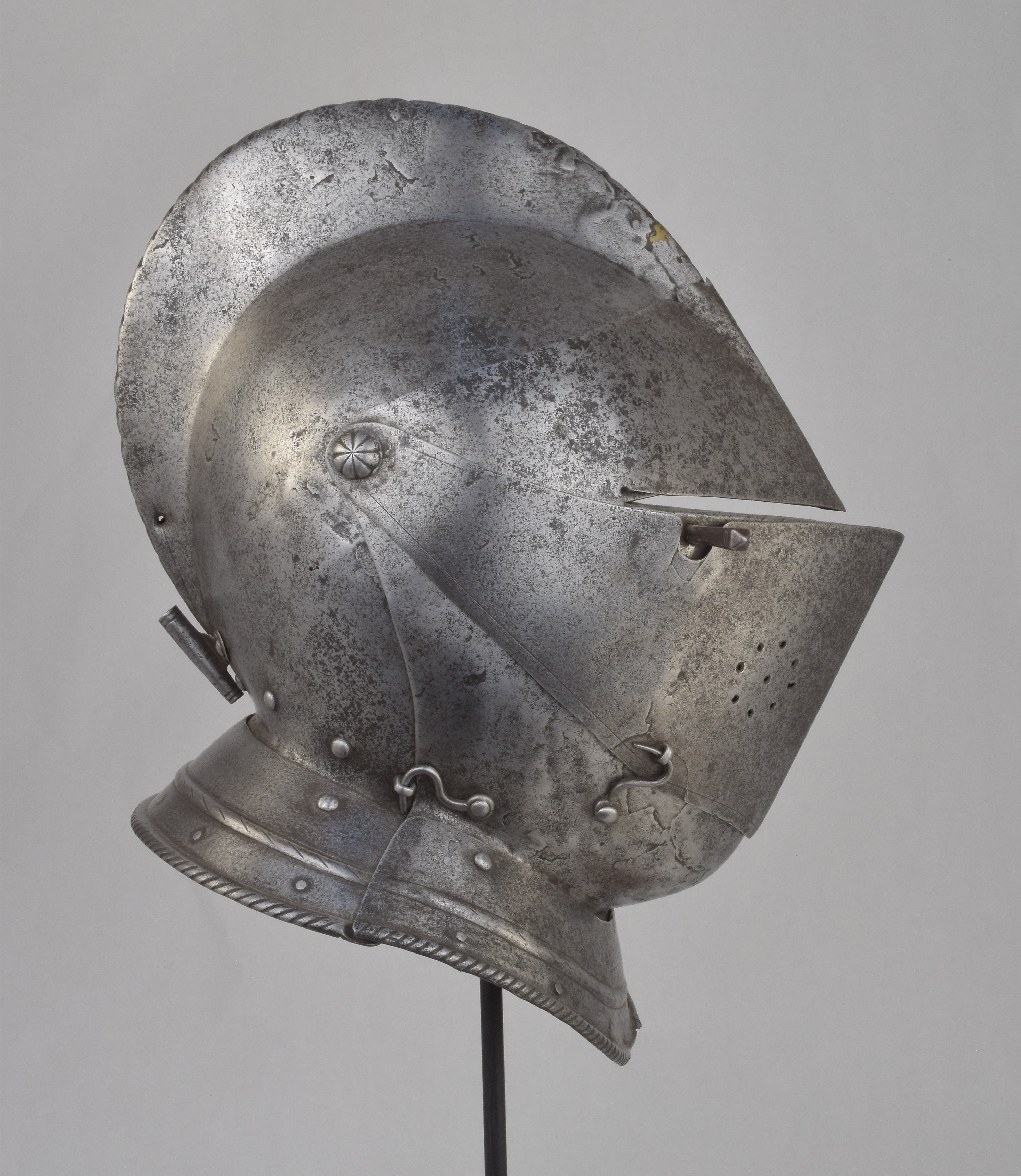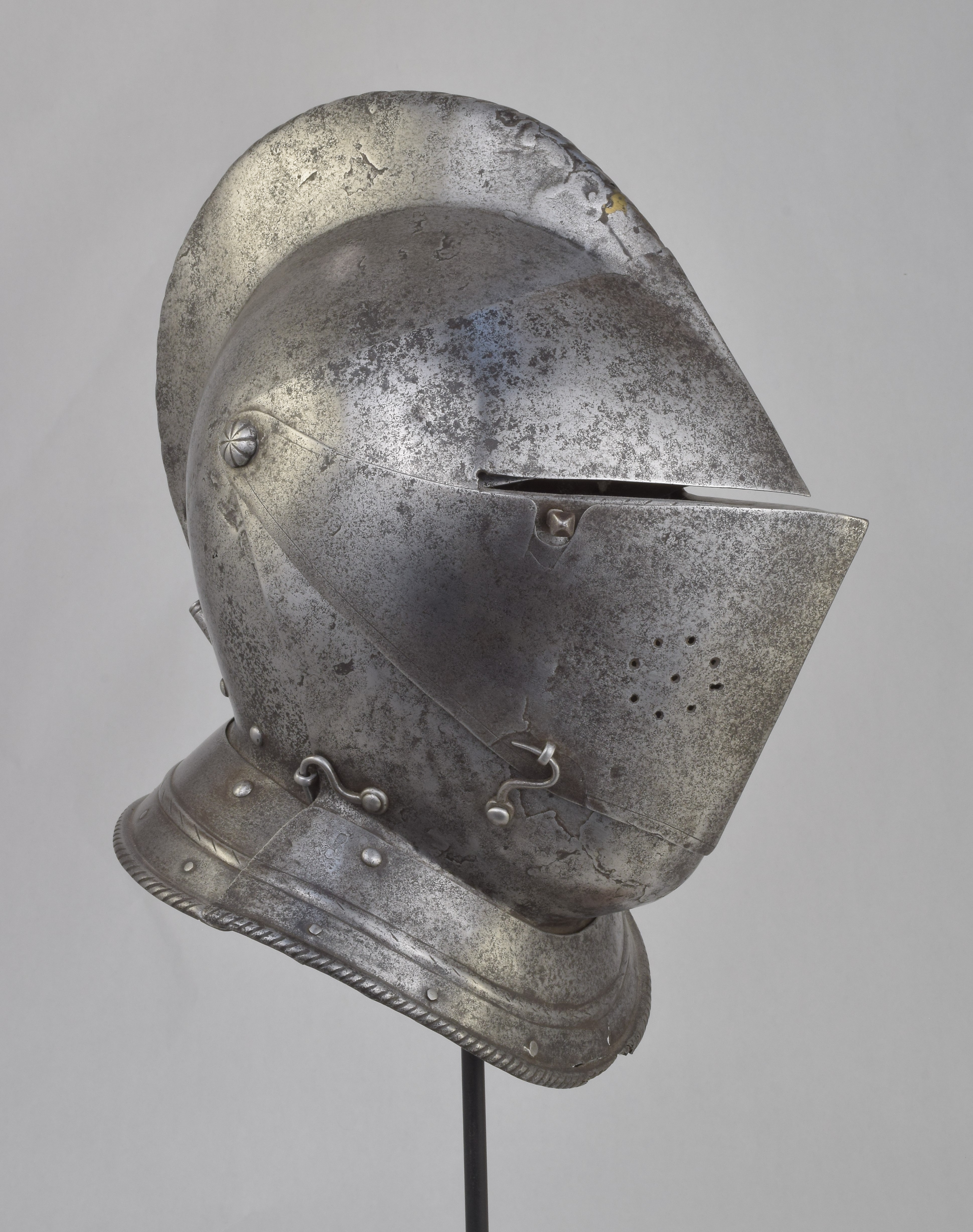 Italian or French. One piece skull with high roped comb, visor with single eye slit, ventail pierced with a circle of breaths on the right, and bevor. Bevor with roped inward turned roll at the edge of the face opening. Visor, ventail and bevor pivoted on common pivots. Bevor and ventail secured by hooks on the right. Visor and ventail decorated with single incised lines. Edge of the visor lightly roped. Lining rivets at the forhead and neck edges of the bowl. Front and back with single neck lames, each with outward turned roped border and an additional parallel raised ridge. Visor with lifting peg at the right. Good internal patches in the skull, bevor and ventail. The form of the visor (relatively flat and straight and without a central piece dividing the eyeslit) and ventail (mostly flat without additional form at the pivots or corners of the eye) is similar to the form of the helmets on the French armors that survive in the Musee de L'Armee. It is likely that the rear neck lame is a replacement and the front lame may originally have been from the rear.