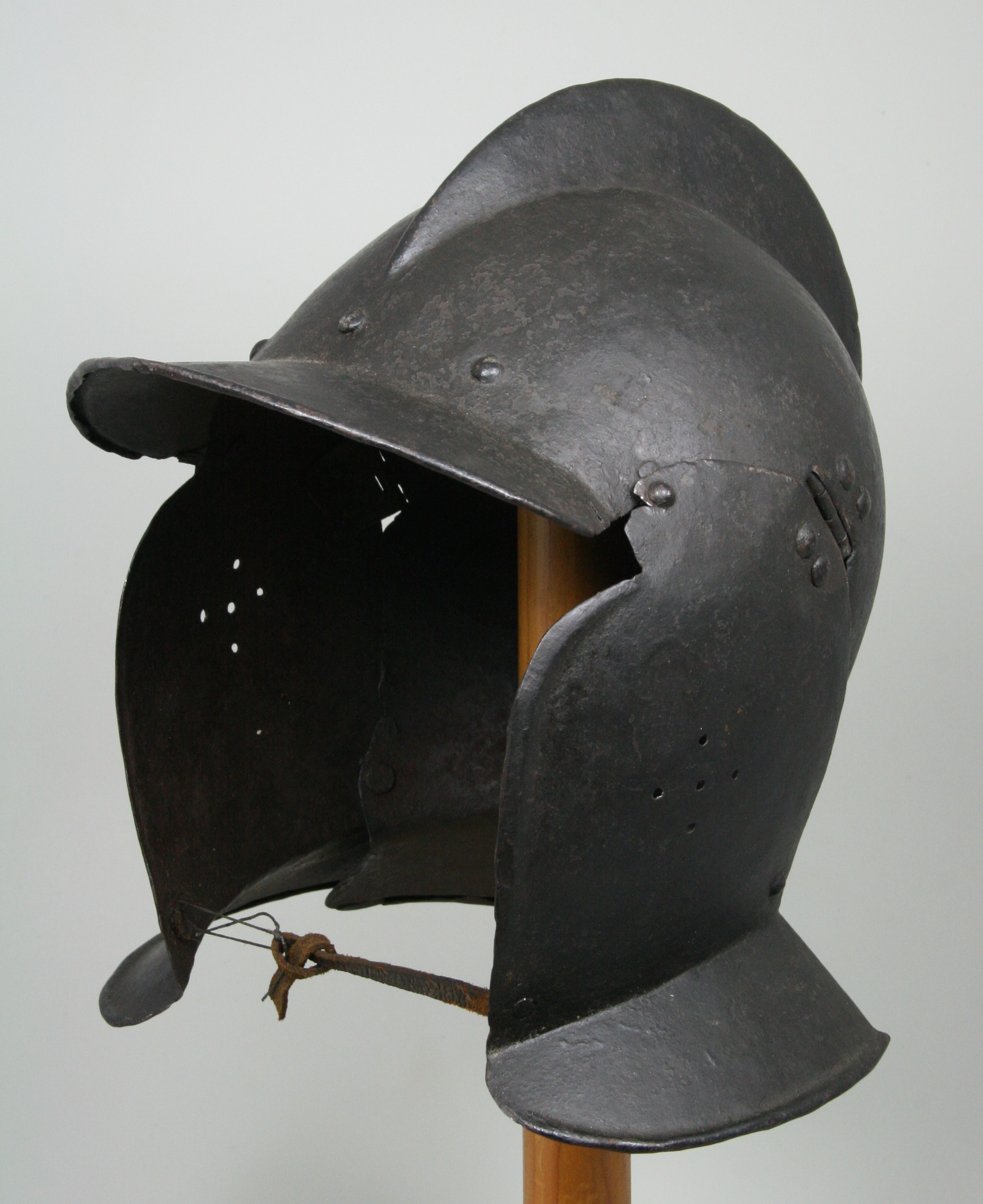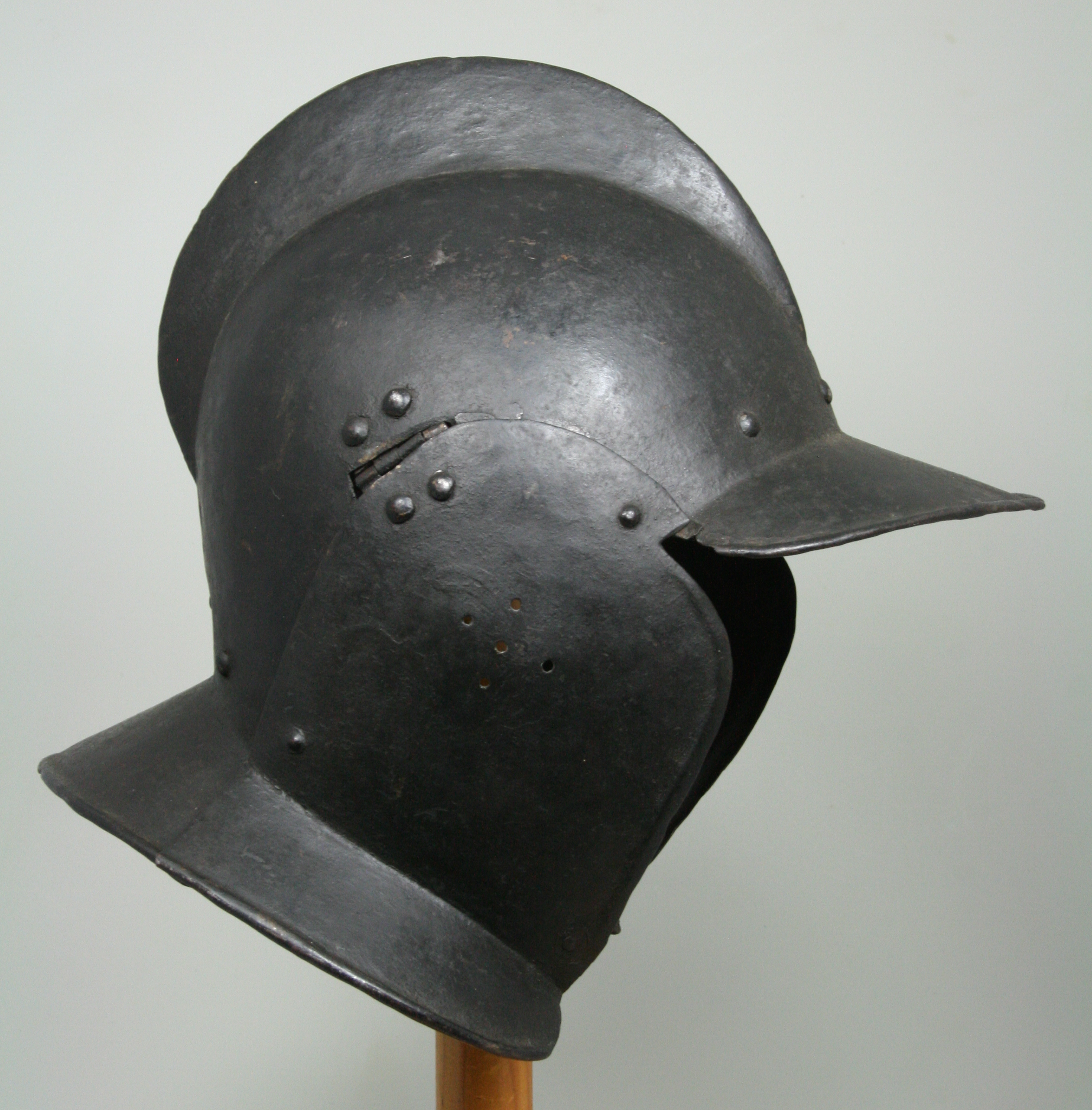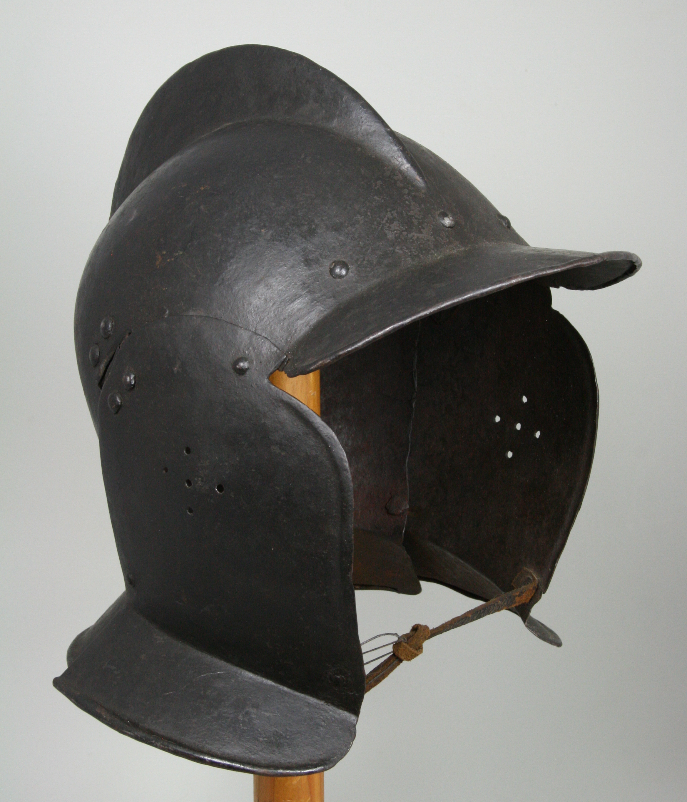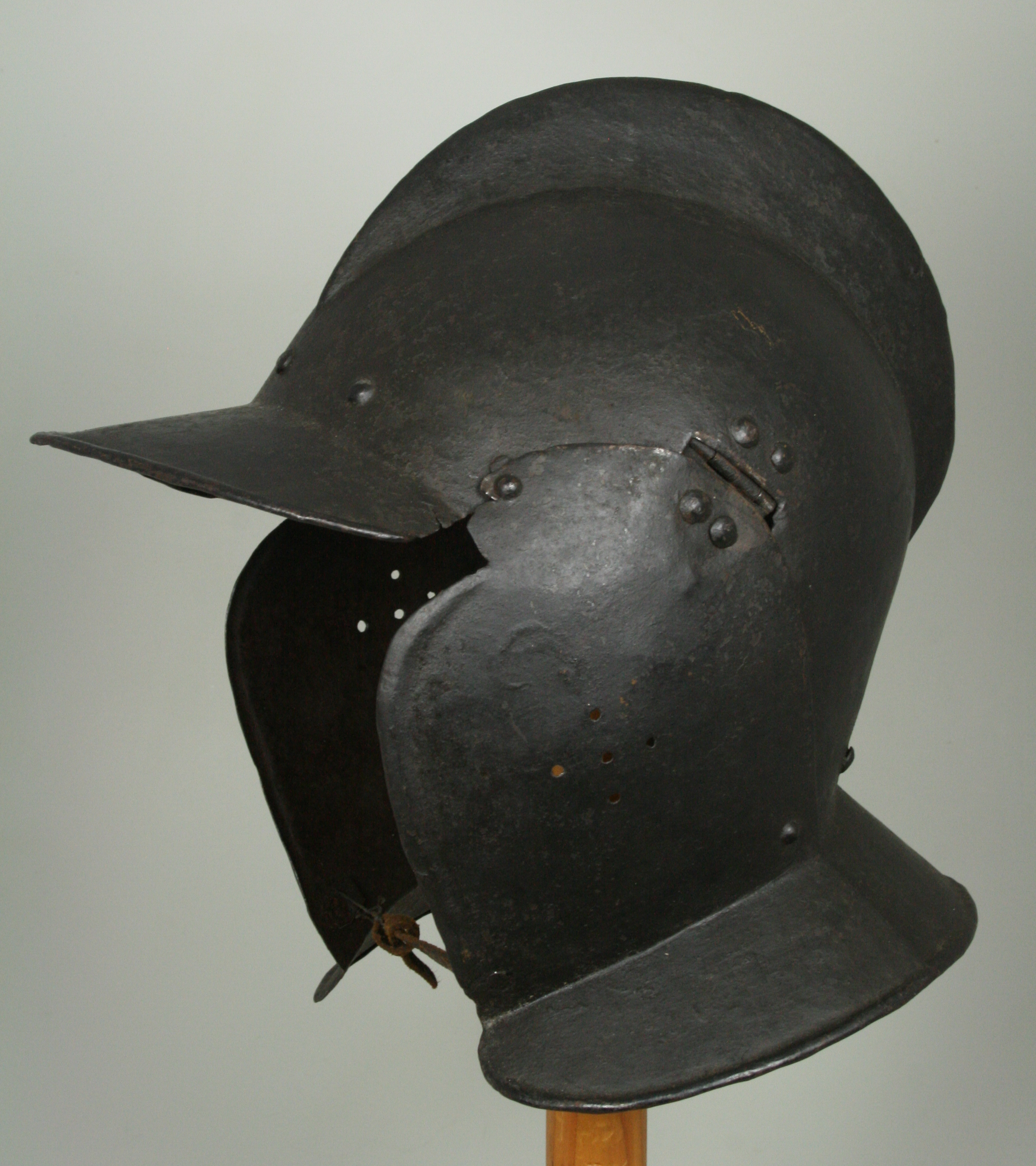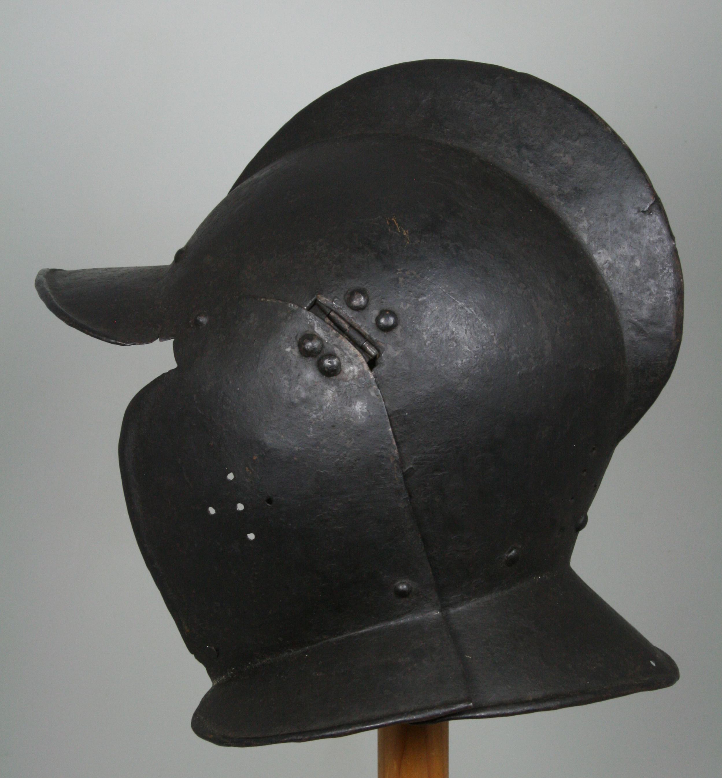 South German, probably Augsburg. One piece skull with high comb and integral peak and (atypically) neck flare and a pair of cheek plates. Inward turns at the edge of the peak, neck and lower edge of the cheek plates. The face edge of the cheek plates with a simple raised edge. Each cheek pierced with 5 holes at the center. Retains lining rivets at the face and neck. Rough from the hammer. One large hole in the back of the crest and an H pattern of smaller holes above the neck in the skull. The larger hole likely from how the piece was mounted in a display. Purpose of the smaller holes unknown. Retains blackened finish refreshed with paint. The integral neck flare is very unusual. It is present on some higher end burgonets often ascribed to an Augsburg origin, but generally the shape is more sweeping and less similar to the form of the burgonets with a neck lame.