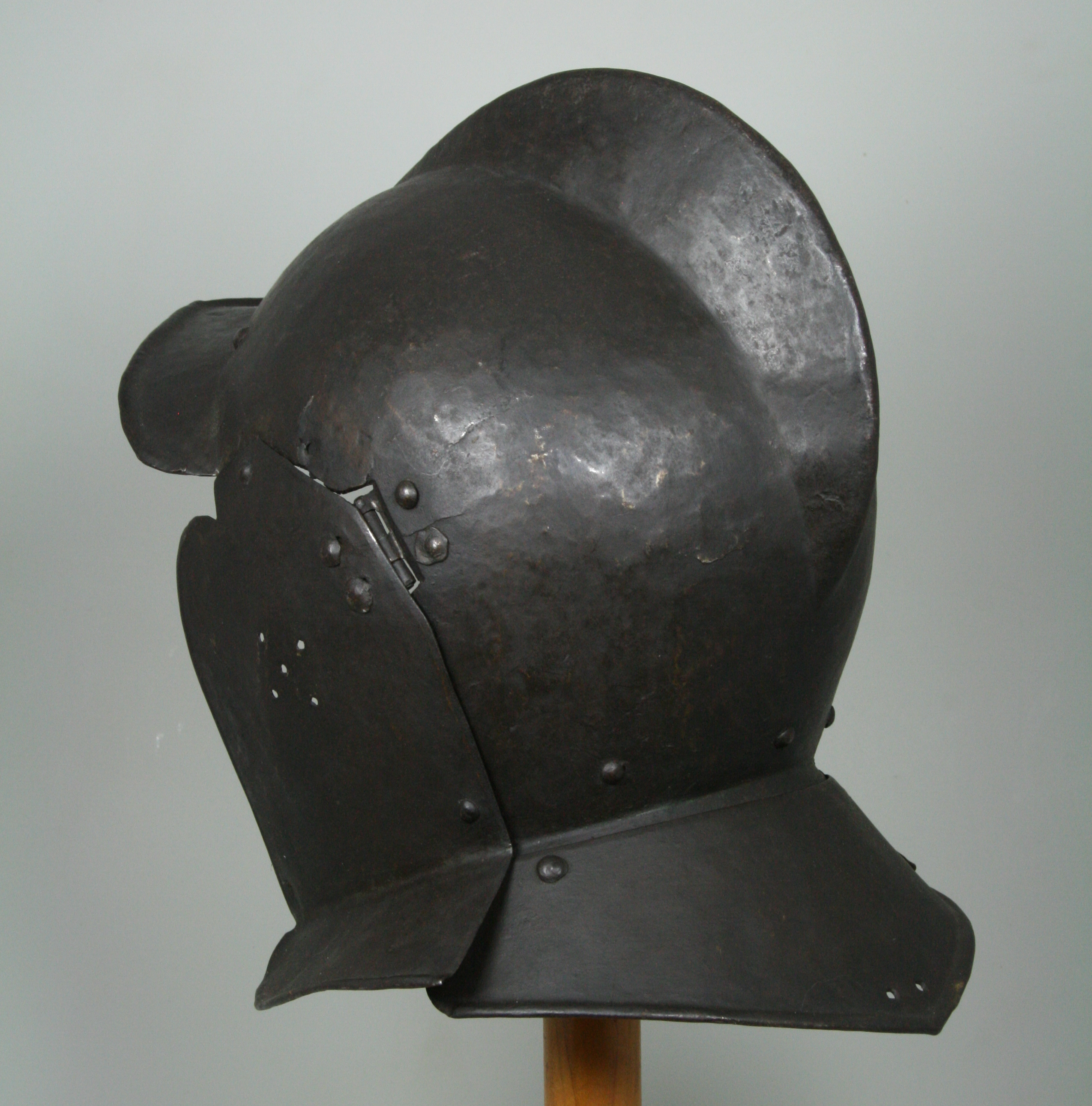 Augsburg. One piece skull with high angled comb and integral peak. Single neck lame and a pair of cheek plates. Rough from the hammer. Point of the peak with two marks, one the Augsburg pinecone, the other indistinct. The edge of the peak formed with a simple inward turned roll coming to a blunt point at the center and with a central crease. Neck plate with plain inward turn at the outer edge coming to a blunt point and with a pair of holes near the point for suspension in an arsenal. Cheek plates with a simple bump at the face, inward turned roll at the bottom and pierced with five holes over the ear. Retains lining rivets at the neck and forhead. Signs of delamination esp. in the rolls on the peak and neck lame and at the edge above the cheek plates which also shows signs of folds and cracking which has been repaired during manufacture.
