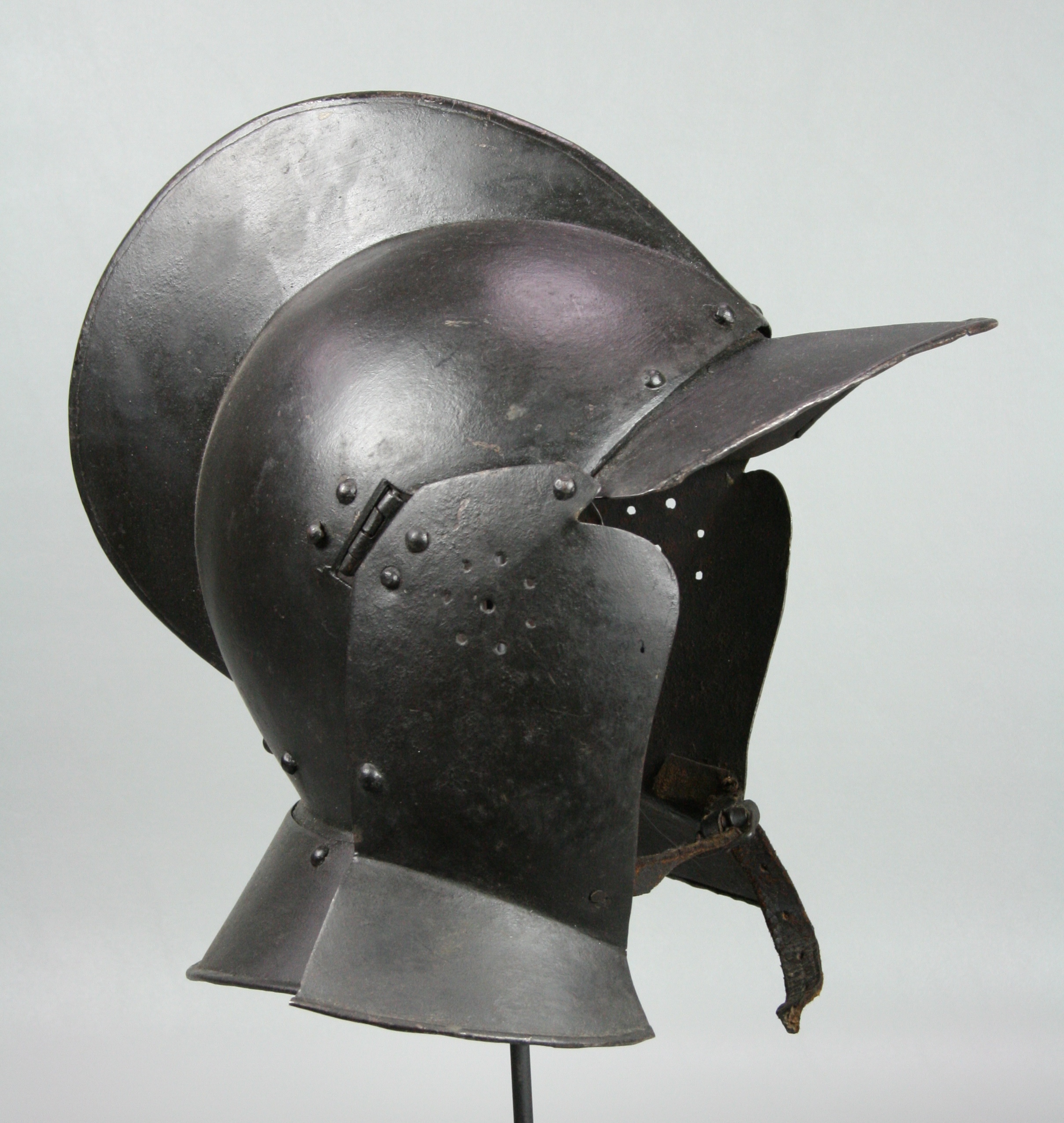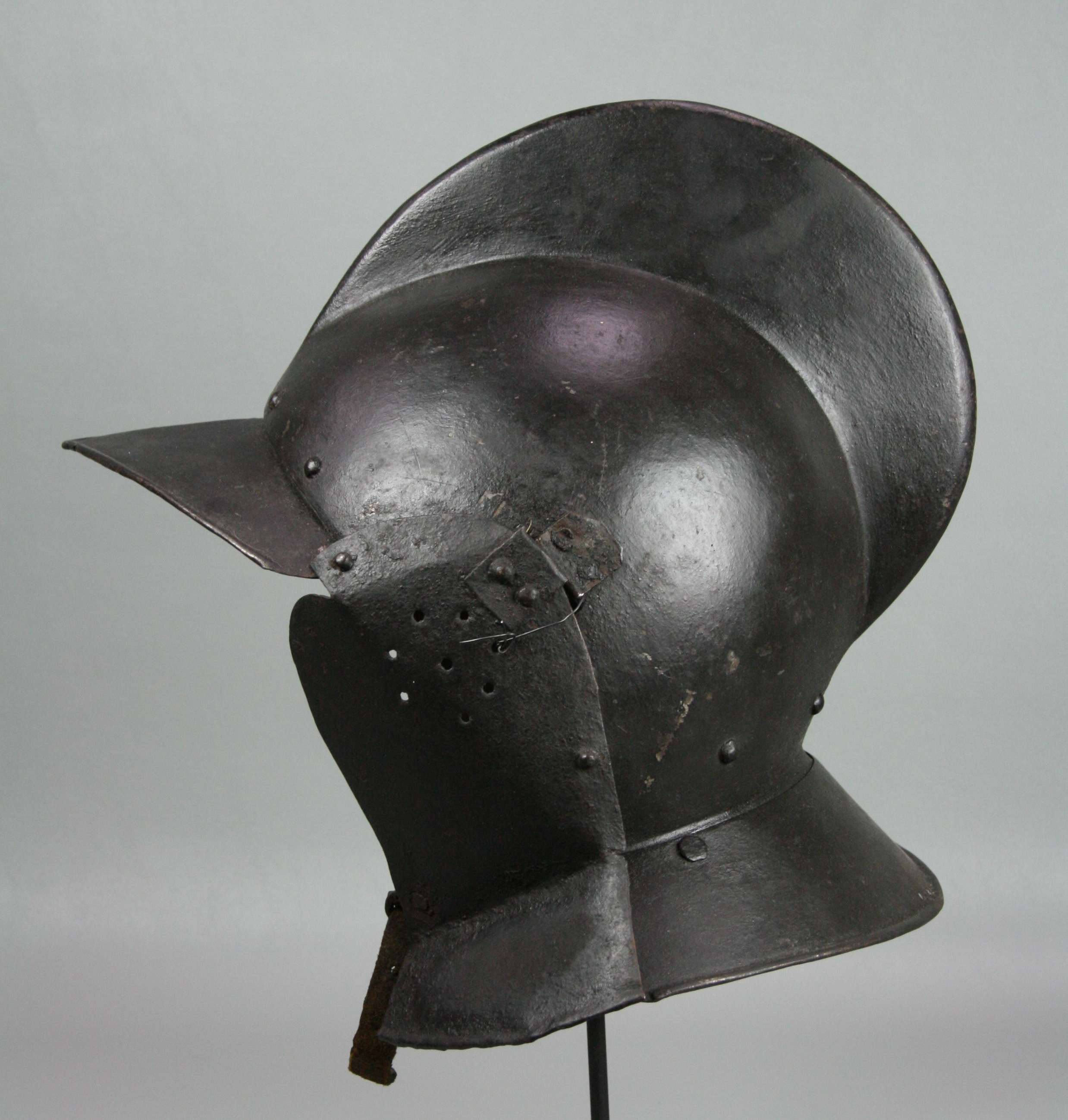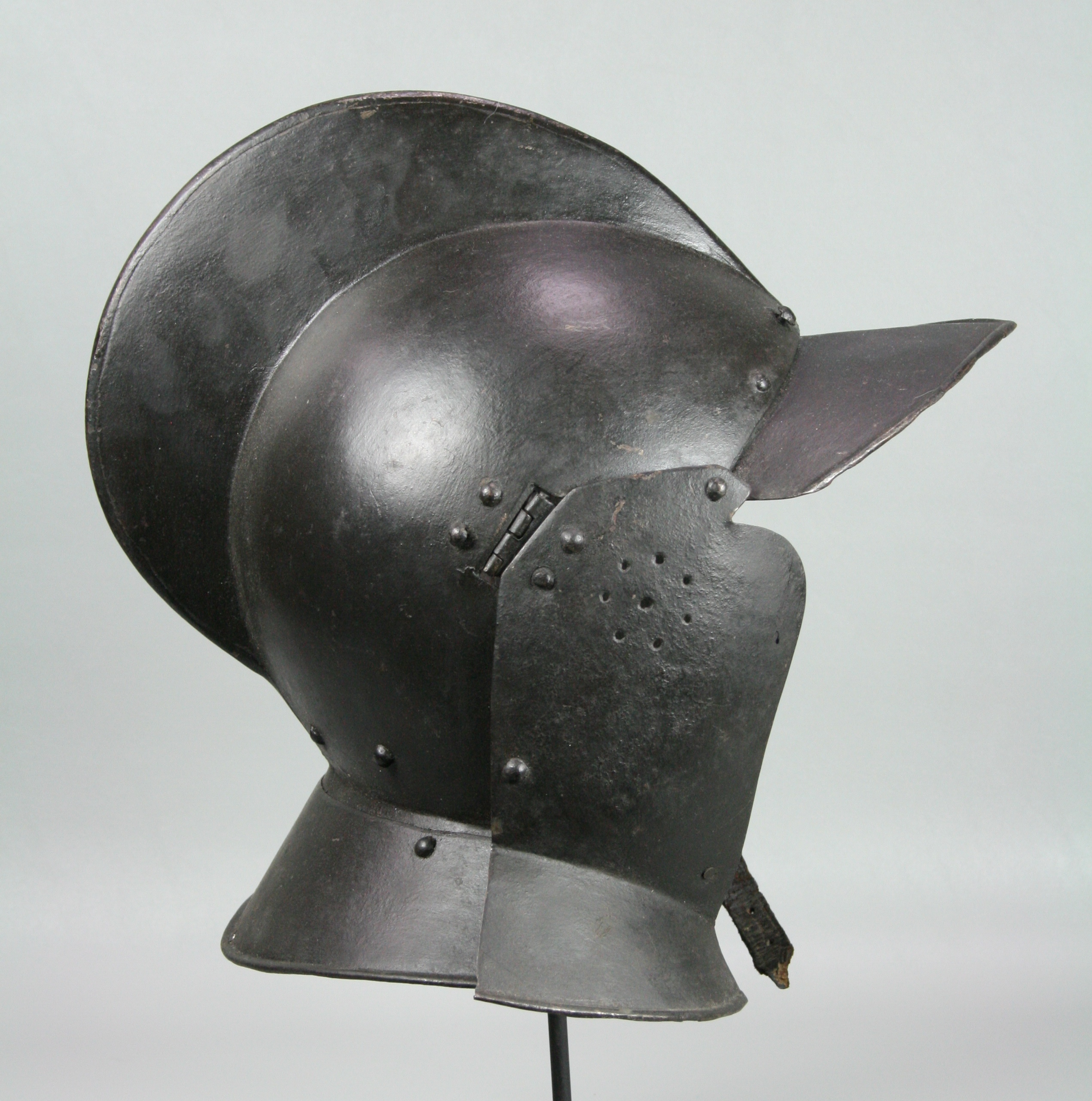 South German Probably Augsburg. Two piece skull with high comb and separate inset peak and separate neck lame. A pair of cheek plates (the left probably associated and slightly worked to fit at the bottom). The hinge badly replaced on the re-worked cheek plate. The two piece construction is much nicer than many helmets. The two halves fit, are at the same level and the seam in the comb can be confused with an engraved line (which it was in the auction description where it was described as having a one piece bowl). Rough from the hammer. Edges with plain inward turns. Lining rivets at the face and neck lines.