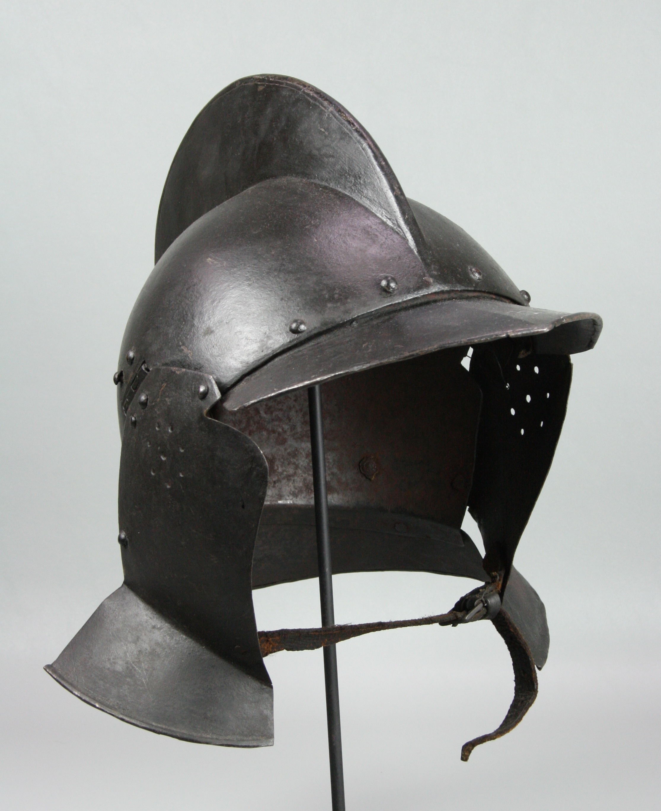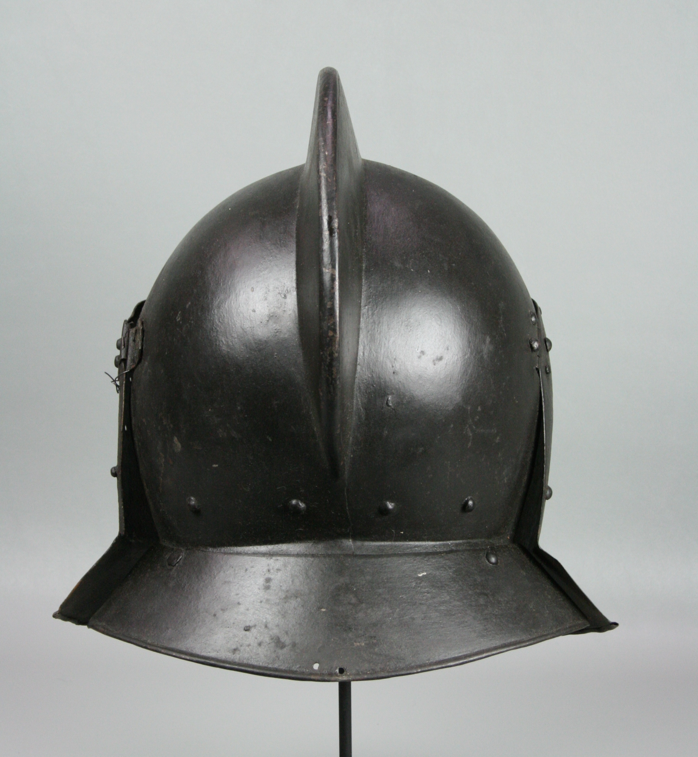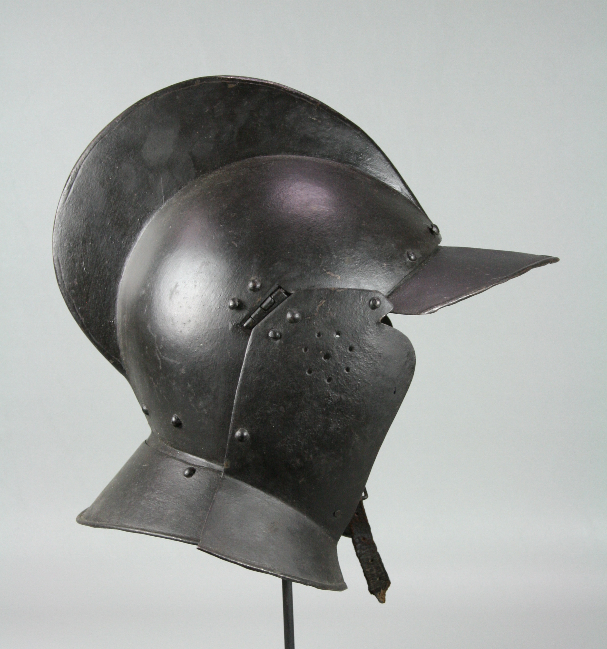 South German Probably Augsburg. Two piece skull with high comb and separate inset peak and separate neck lame. A pair of cheek plates (the left probably associated and slightly worked to fit at the bottom). The hinge badly replaced on the re-worked cheek plate. The two piece construction is much nicer than many helmets. The two halves fit, are at the same level and the seam in the comb can be confused with an engraved line (which it was in the auction description where it was described as having a one piece bowl). Rough from the hammer. Edges with plain inward turns. Lining rivets at the face and neck lines.