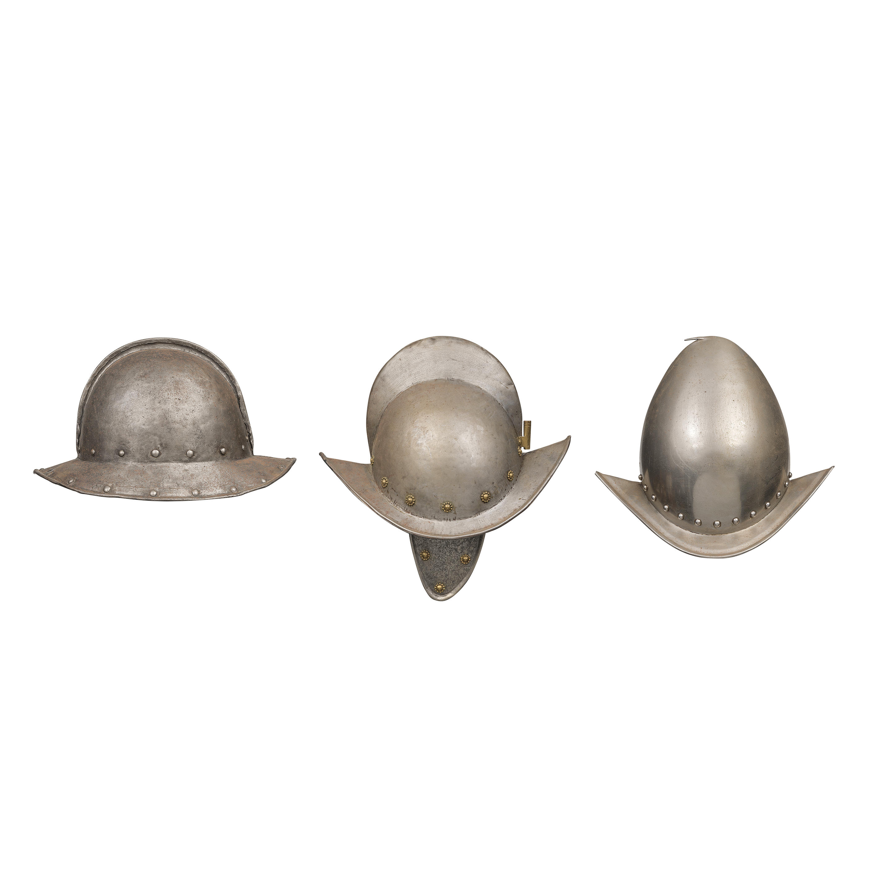 Typical form with nice tall skull, bring drawn out to a rising point front and back a nice stalk. Rivets around the edge of the skull. Edge of the brim with inward turned roll.