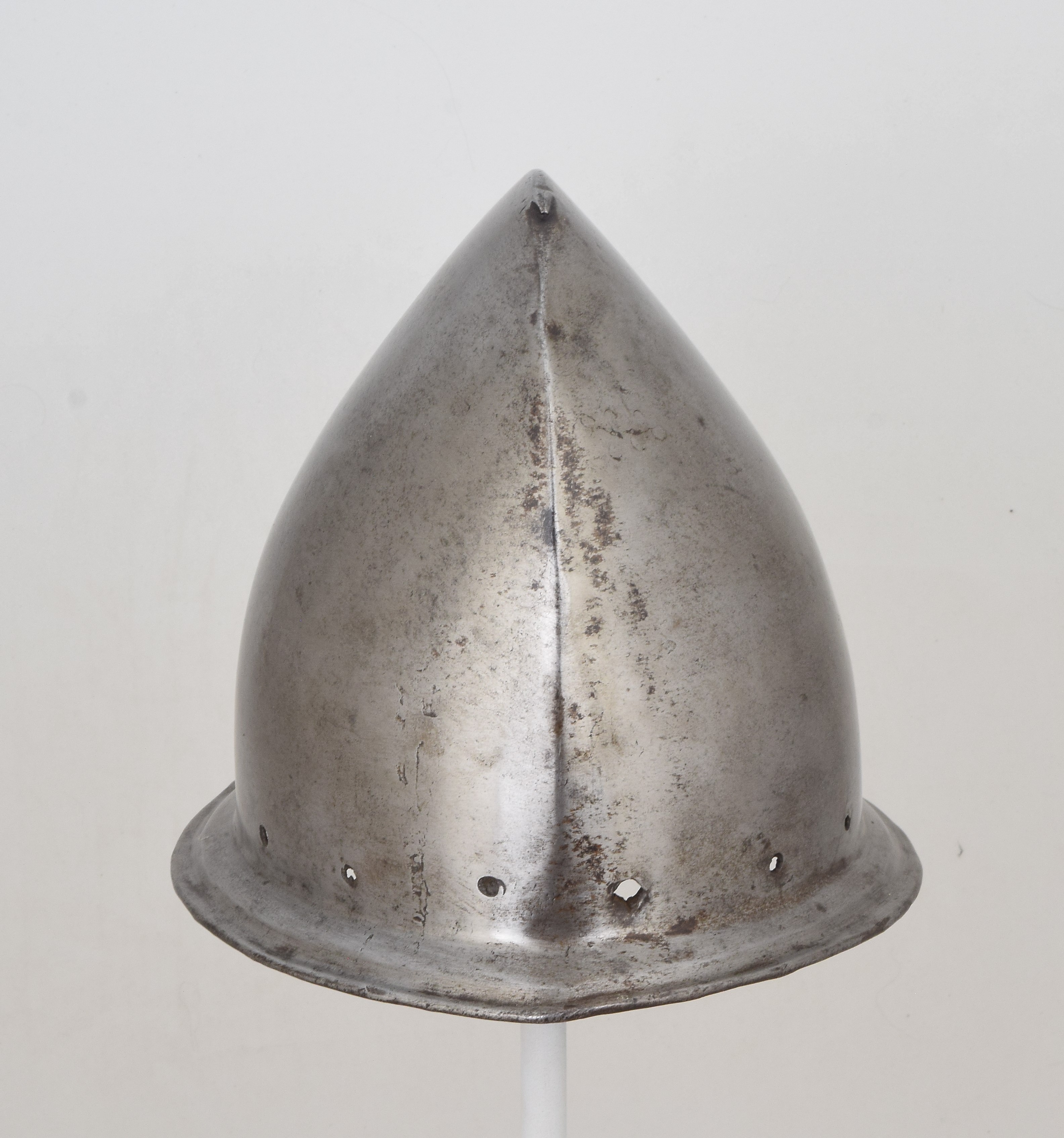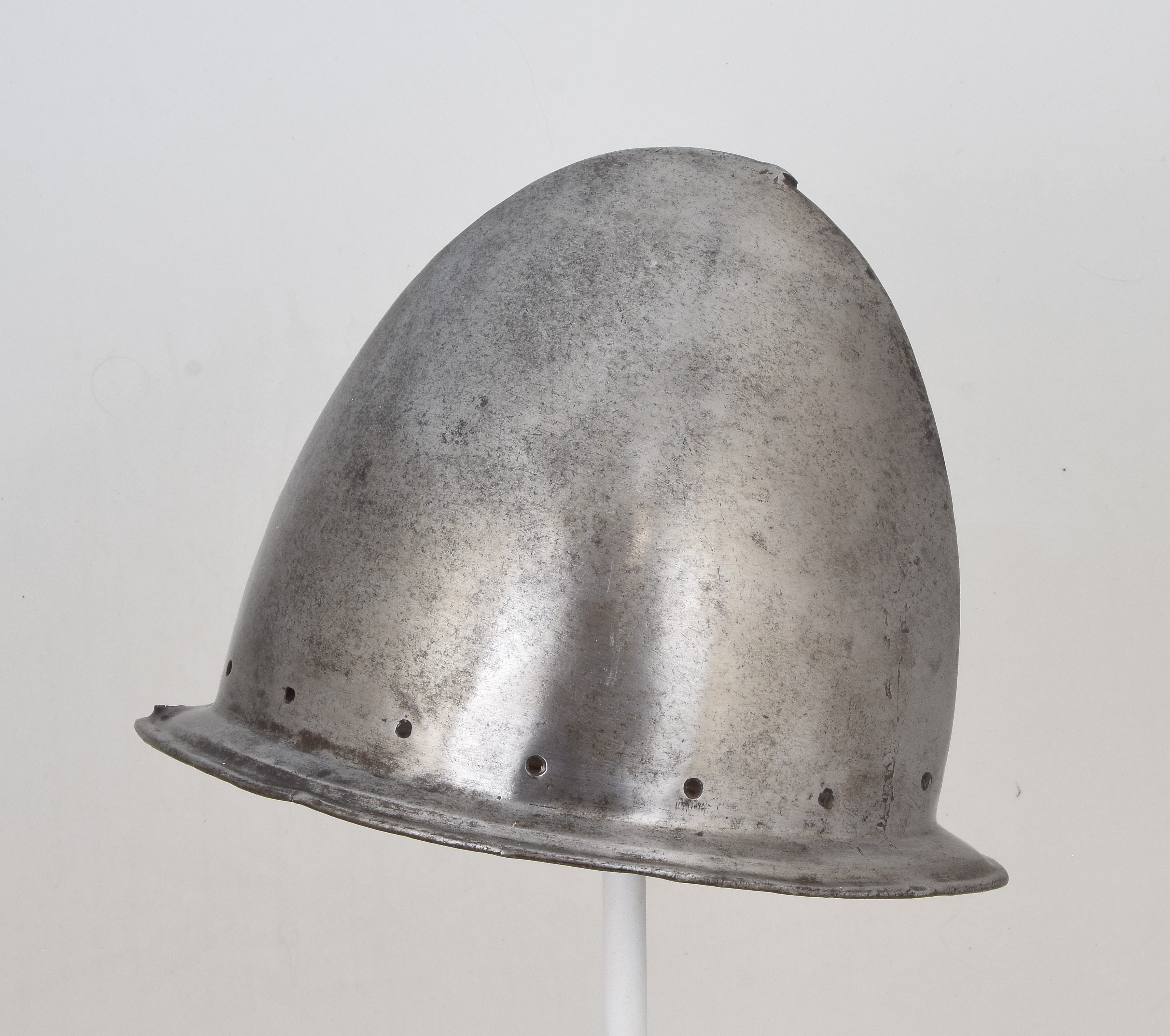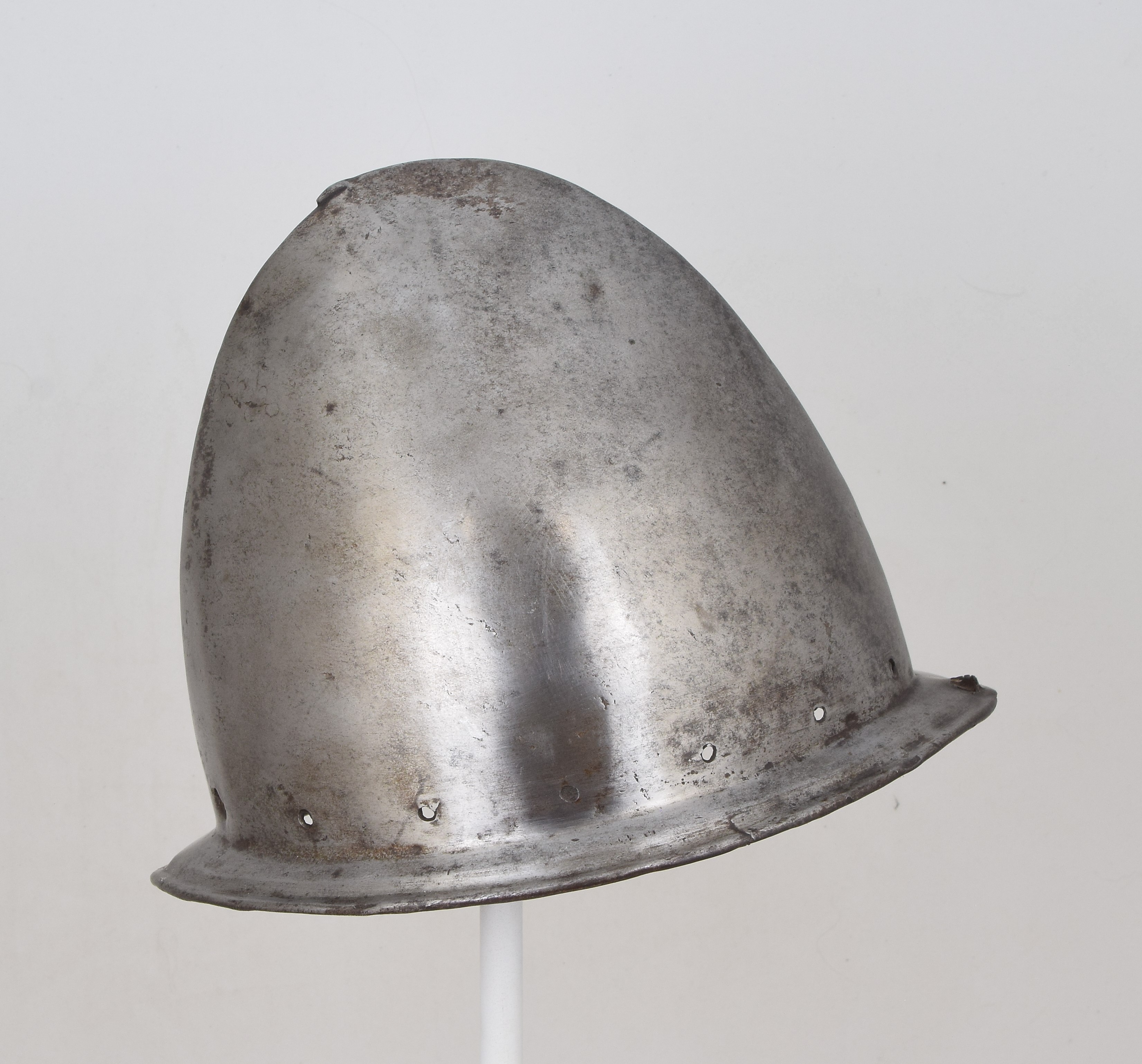 Tall one piece bowl with very small stalk at the point, central crease and narrow slightly downturned brim. Brim with plain inward turned roll at the edge with a narrow recessed groove at the inner side of the roll. At least a portion of the roll is turned over wire - part of which is exposed. Line of holes at the base of the skull for (lost) lining rivets. Small patches of oxidation - most of the discoloration was due to old varnish which has since been cleaned. There is a small old (probably working life) internal rivited patch in the upper rear right portion of the bowl near the crease securing what looks like a small crack.