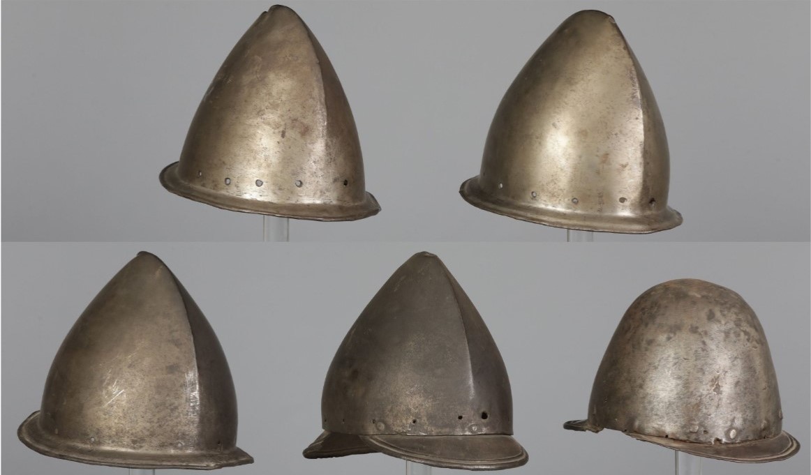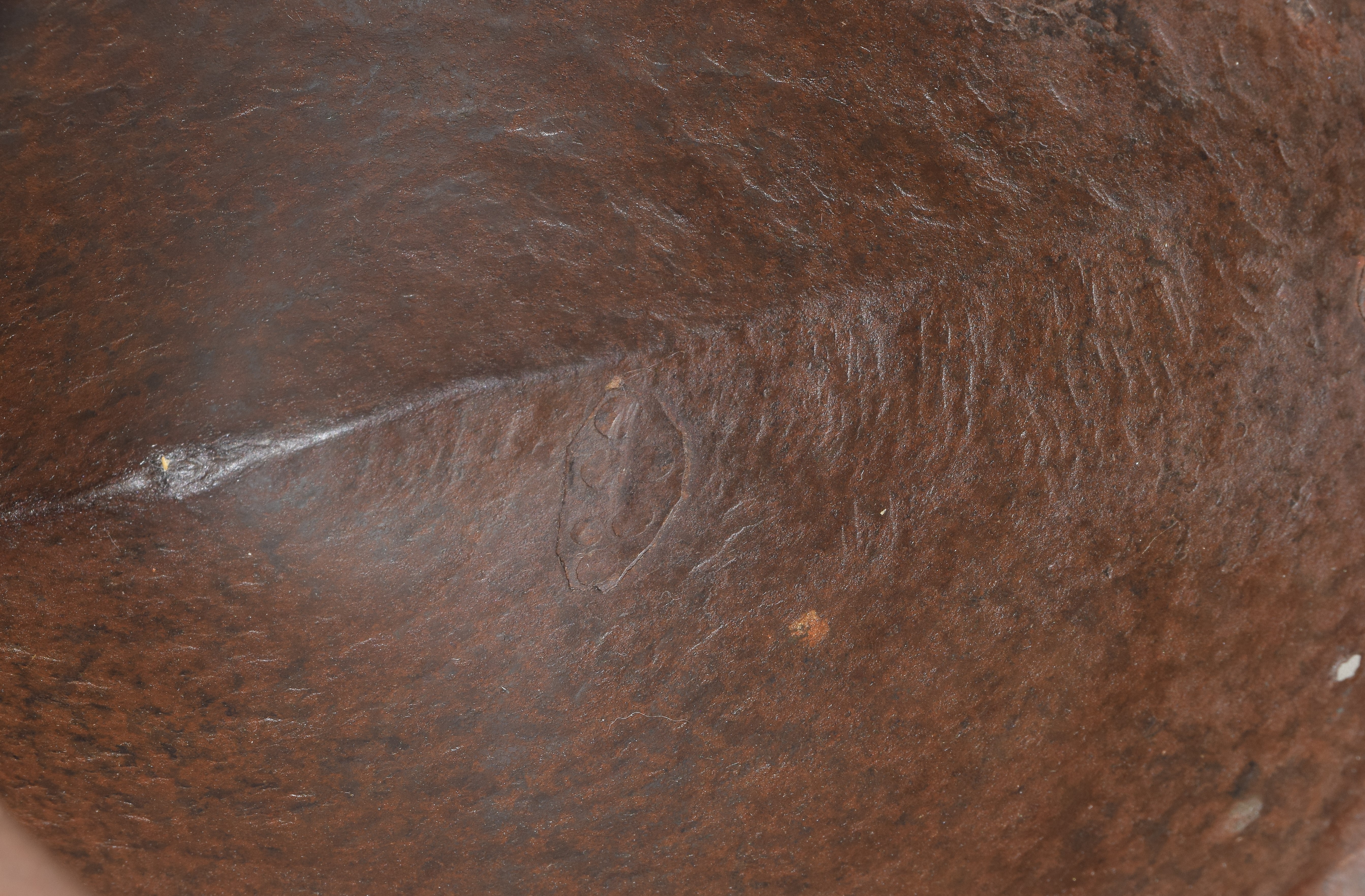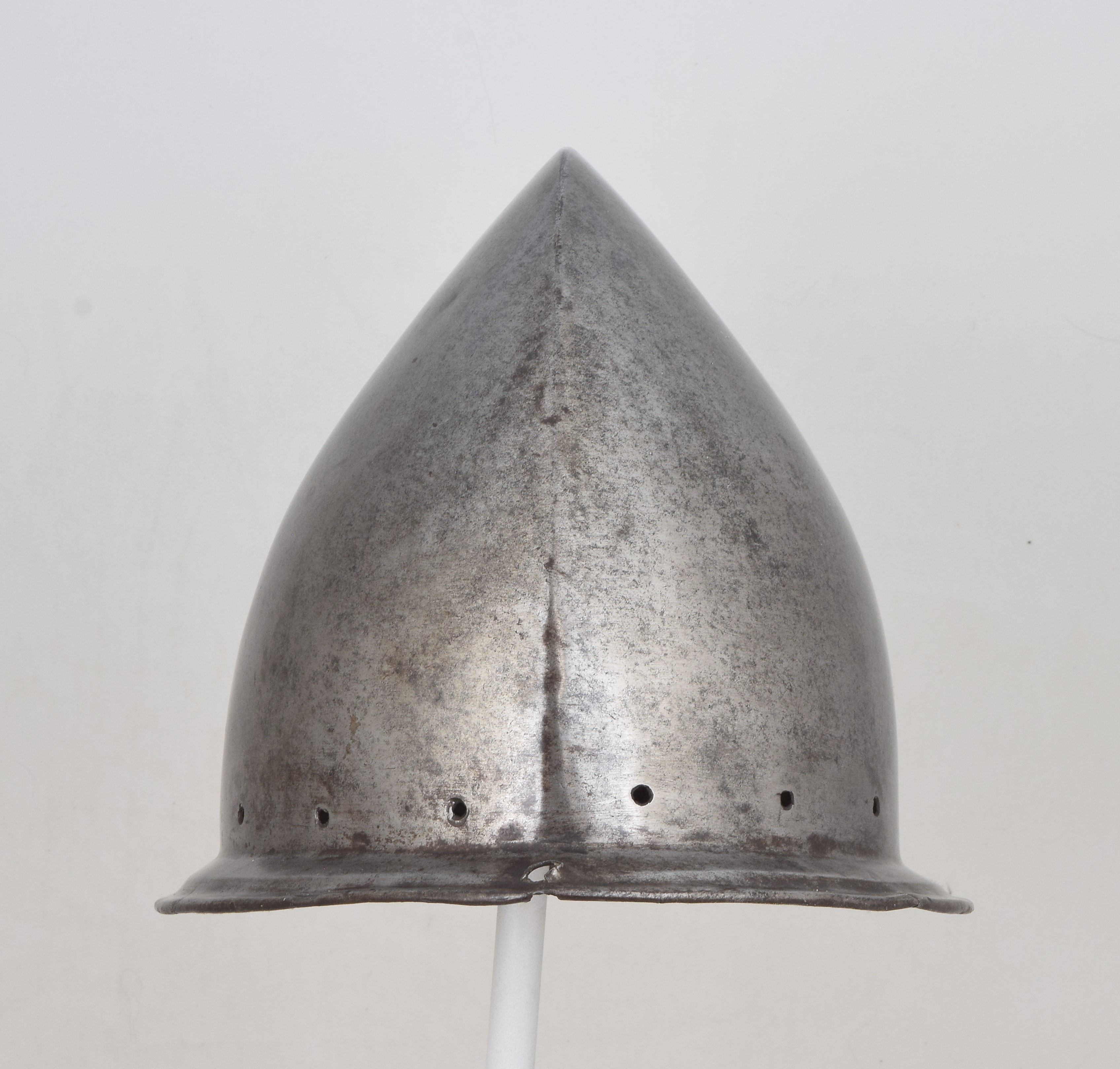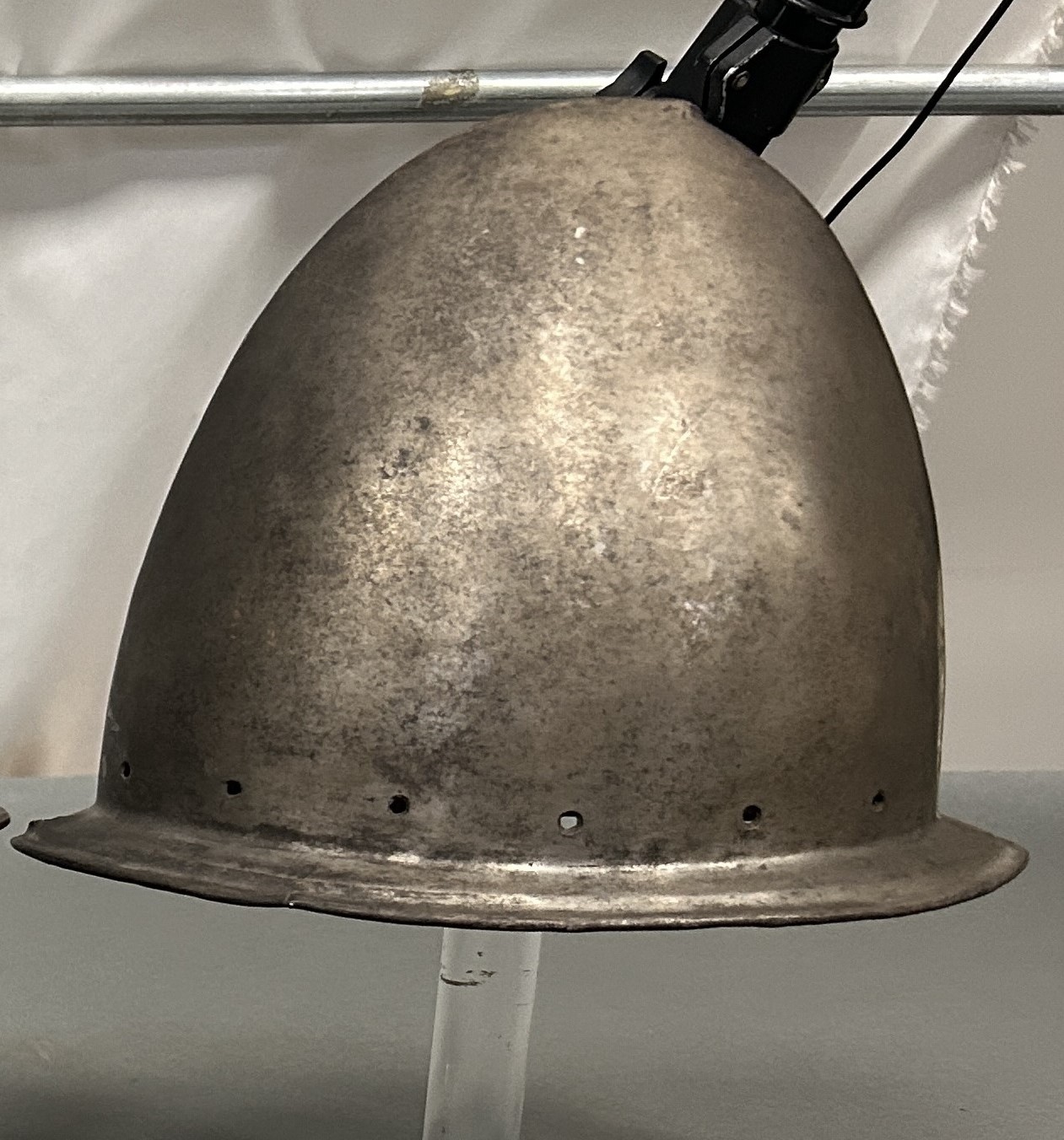 Tall one piece bowl with very small stalk at the point, central crease and narrow slightly downturned brim. Brim with plain inward turned roll at the edge with a narrow recessed groove at the inner side of the roll. At least a portion of the roll is turned over wire - part of which is exposed. Line of holes at the base of the skull for (lost) lining rivets. Small patches of oxidation - most of the discoloration was due to old varnish which has since been cleaned. There is a small old (probably working life) internal rivited patch in the upper rear right portion of the bowl near the crease securing what looks like a small crack.