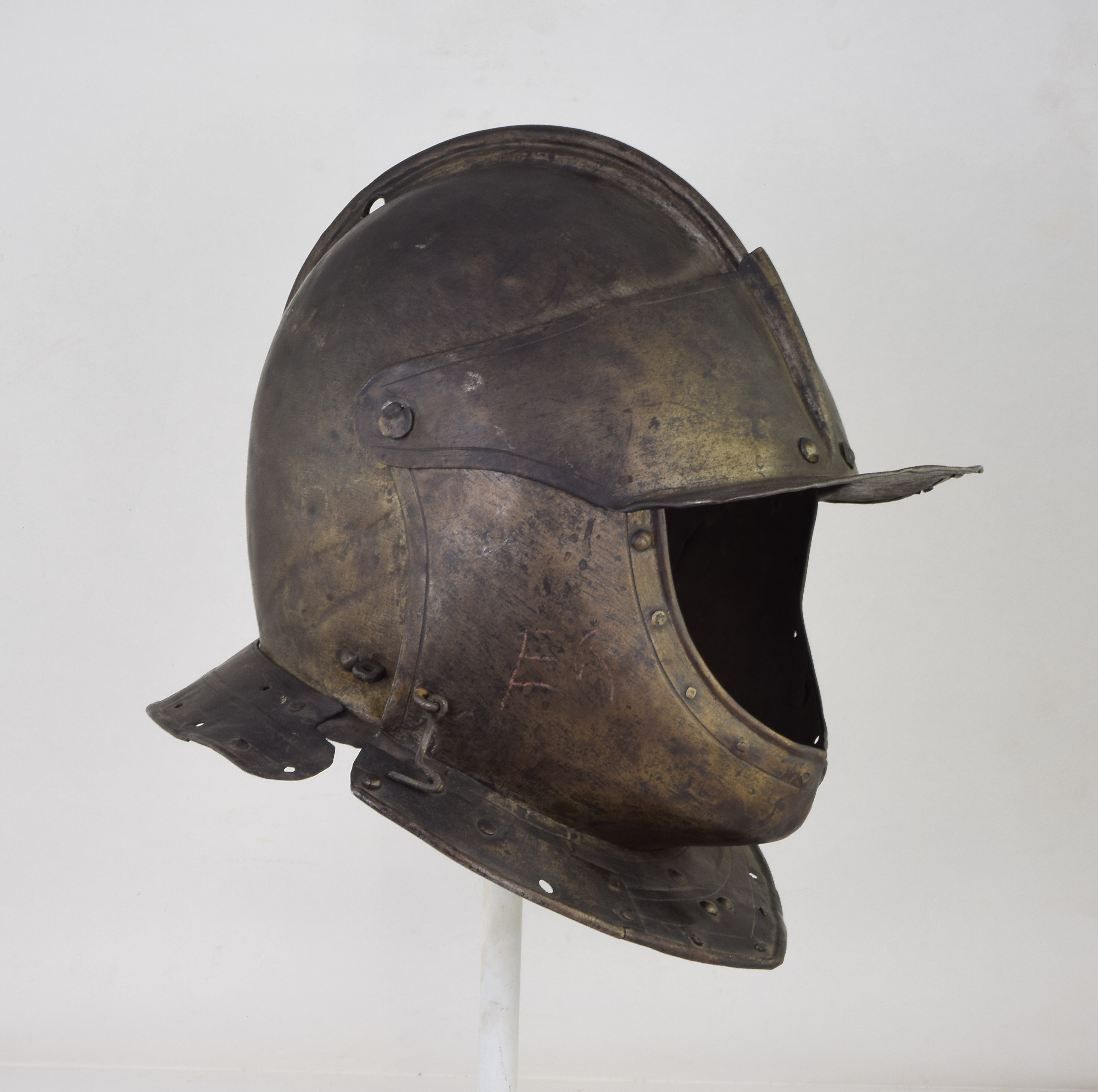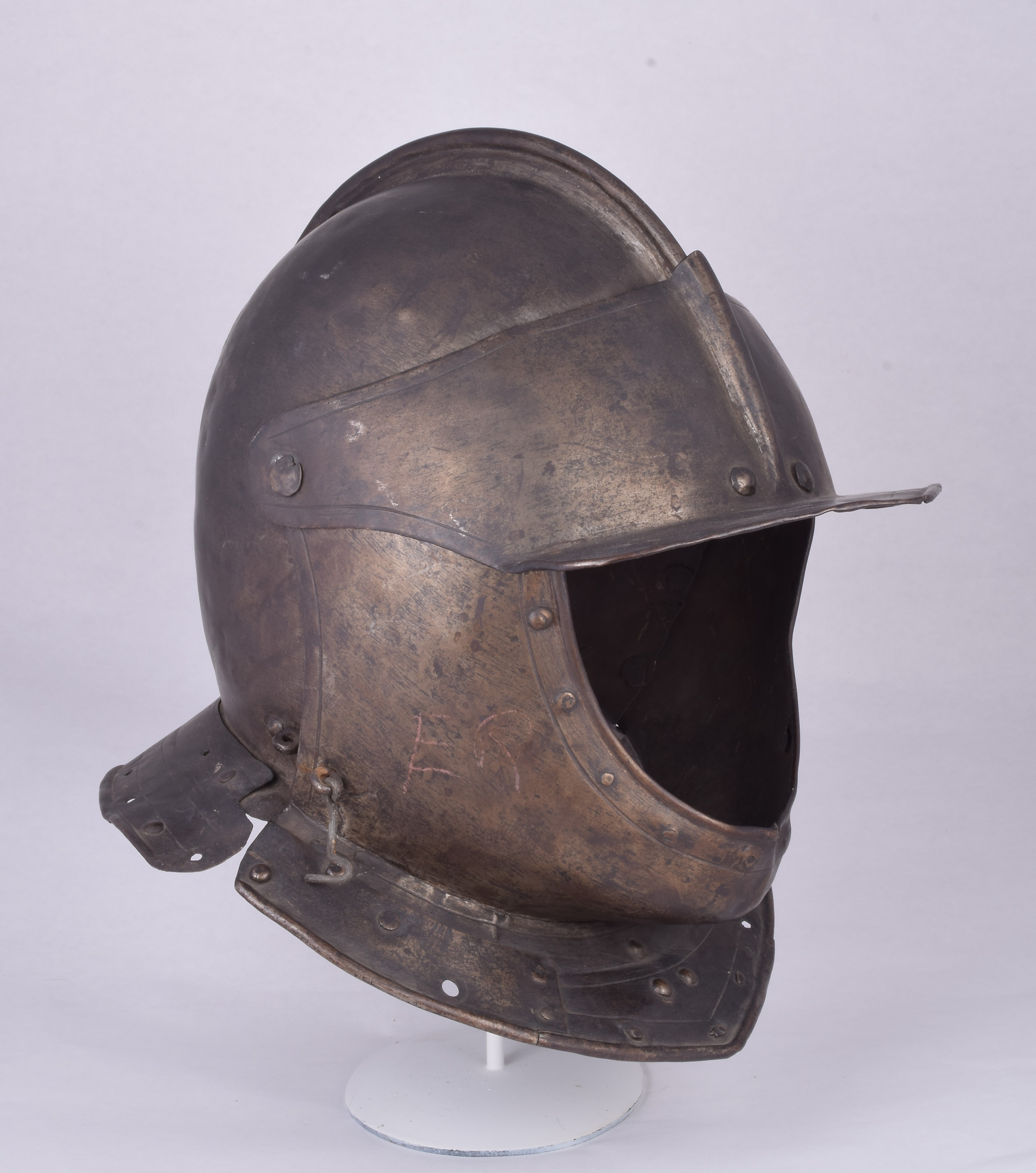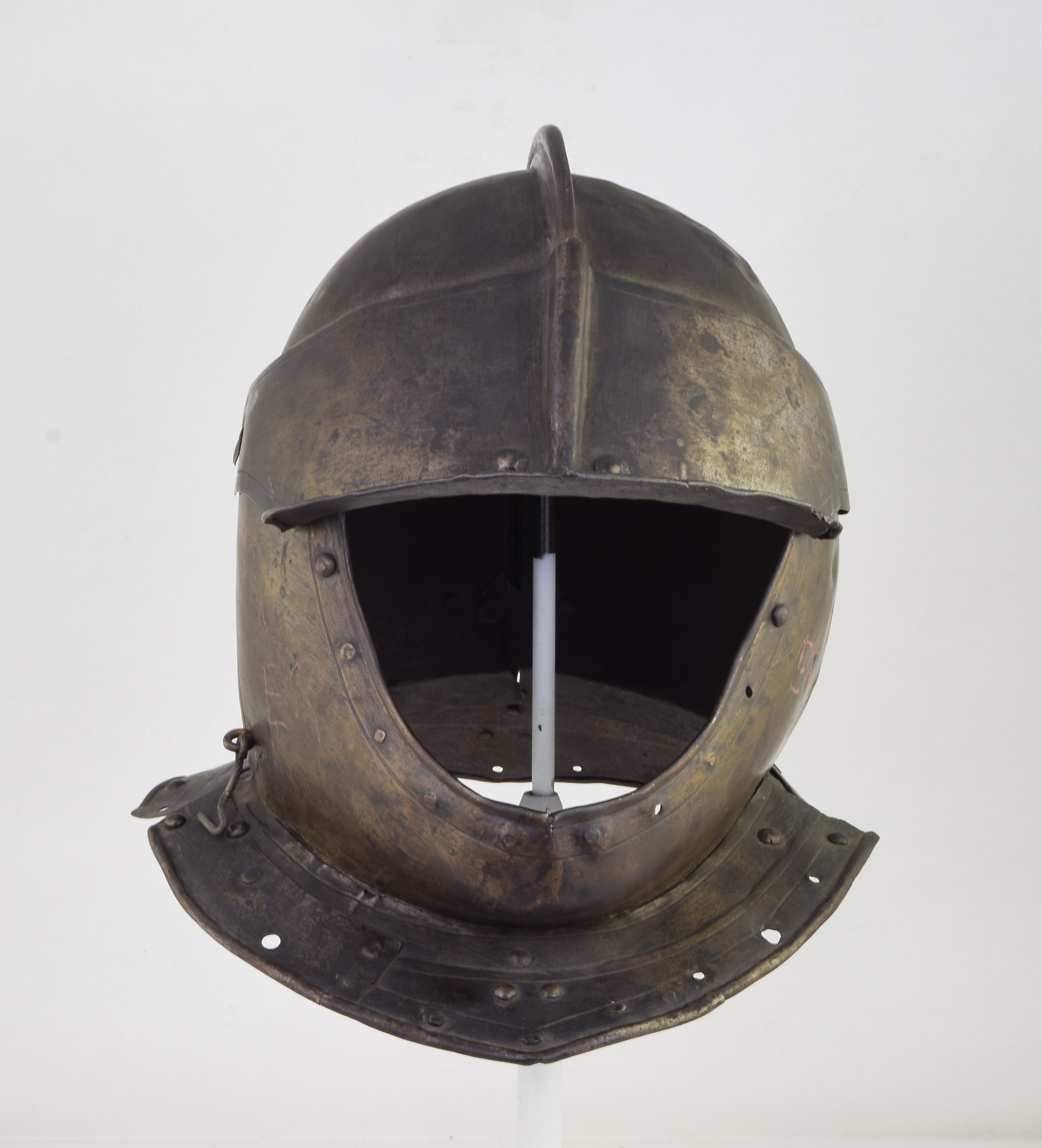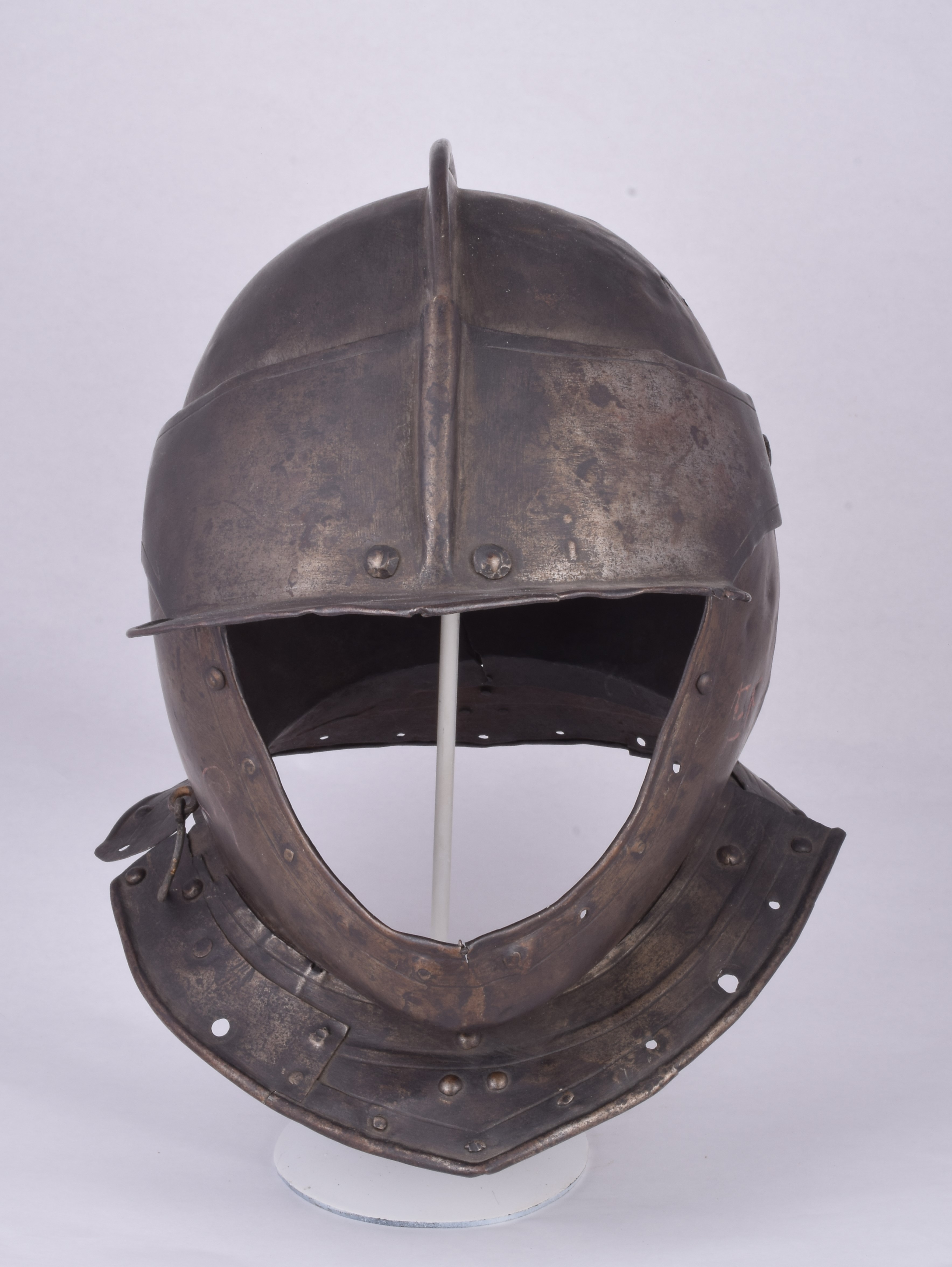Two piece bowl, the halves secured by a roll at the top of a short comb. Pivoting brim secured on common rivets with the bevor (rivets replaced). Single neck and tail lames. The edge of the bowl at the face decorated with an inward turned plain roll with parallel single incised line ensuite with the face hole of the bevor. Secondary edges of the bevor and brim with single incised line. Patches in the neck lames. Sneck hook engaging a peg at the right side of the neck to secure the bevor closed. Open face. Significant damage to the left side of the skull. Skull deformed at the back. Interestingly, given this damage, much of the surface of the right side of the skull, brim and bevor may be original - ground smooth and retaining grind marks.