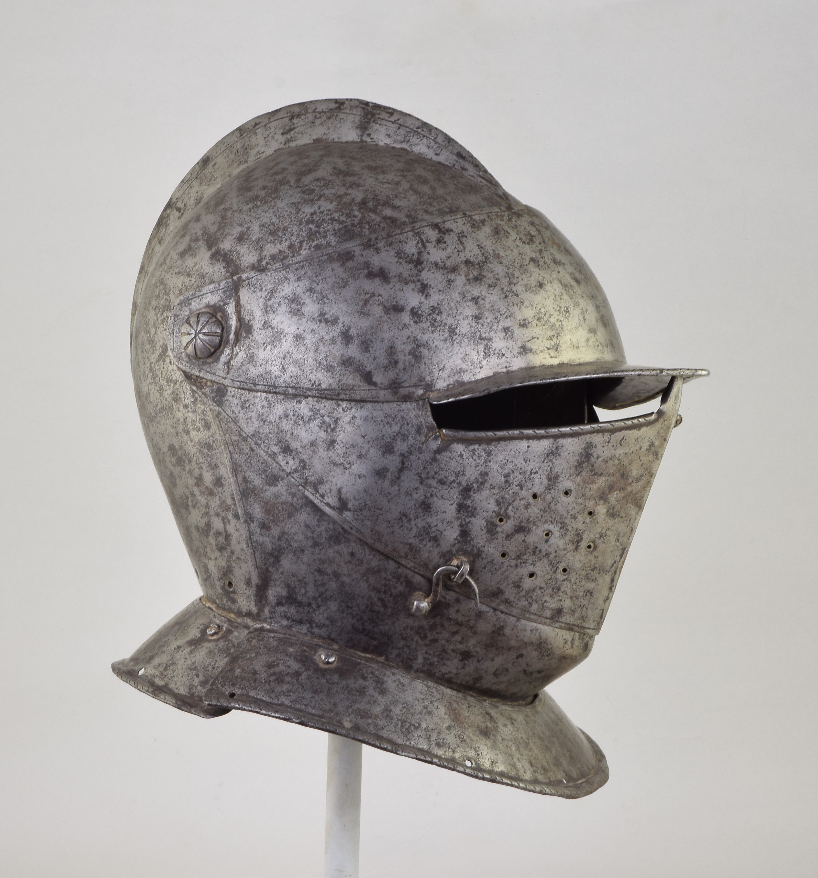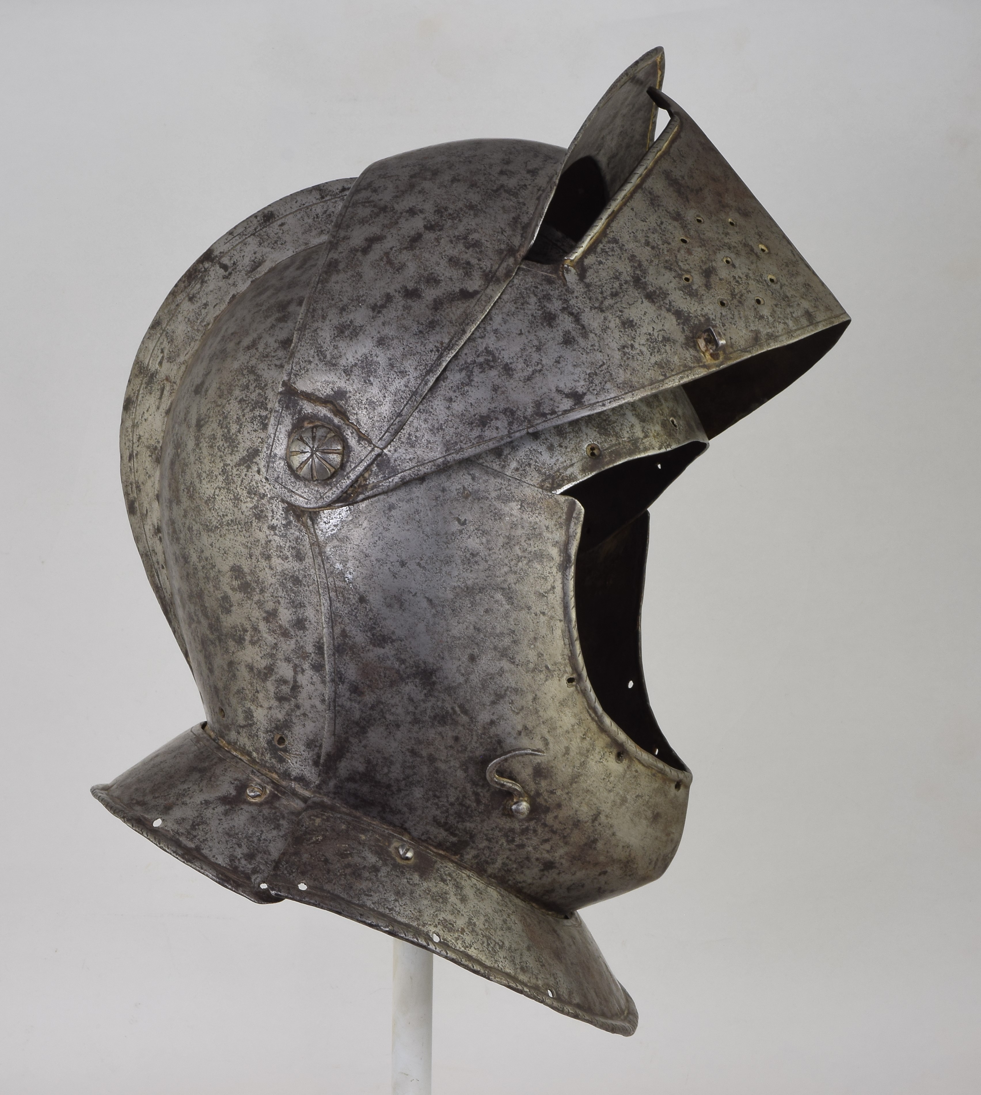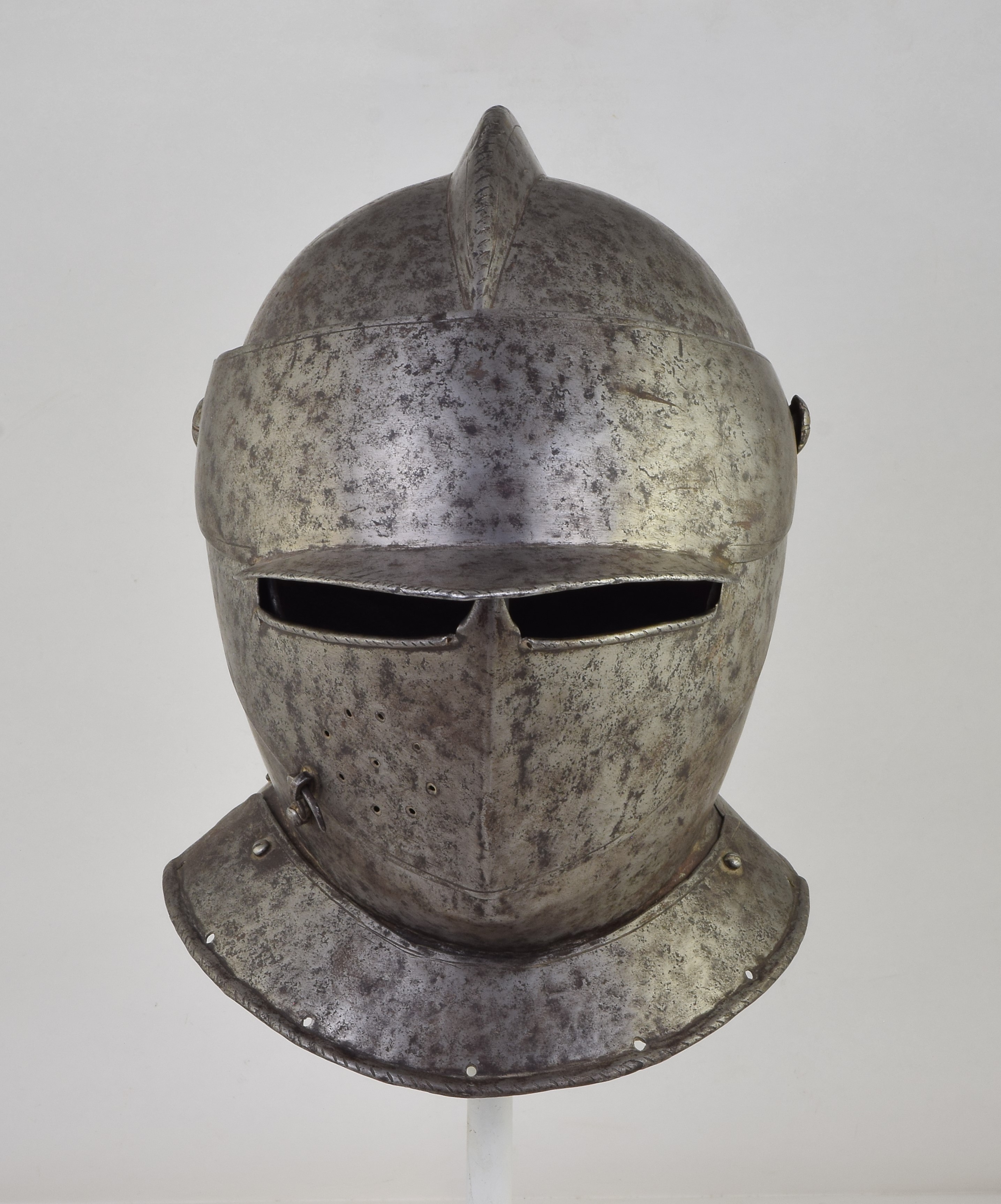 One piece bowl with a low comb. Top of the comb lightly roped. Pivoted brim. Bevor, visor and brim on common pivot points. Simple flat visor. Neck lames front and back. Edge of the brim, neck lames and bottom of the eye slot on the visor with roped rolls. The turns on the brim and neck lames turned inward, the rolls on the eye slot turned outward. Edges of the brim, visor and bevor with single incised line decoration. Visor can be held closed with a sneck hook on the right side. Bevor was likely held closed with a strap and buckle around the neck. Lining rivets lost. Surface appears to have been rough from the hammer, now cleaned. Pivots and neck lame rivets replaced with modern bolts and nuts. My guess is that the piece was disassembled for cleaning, the lining rivets removed and it was reassembled with nuts and bolts. The pivot bolts were decorated to look like nice old pivots. The right side of the brim at the pivot point damaged.