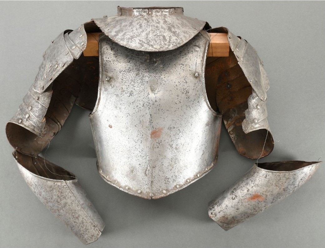 Formed of two plates. The outer shaped to the elbow. Inward turned rolls at the upper edge. Wrist decorated with single incised line. Hands missing. Inventory number "2000.6.51" in red paint on the inside of the left.