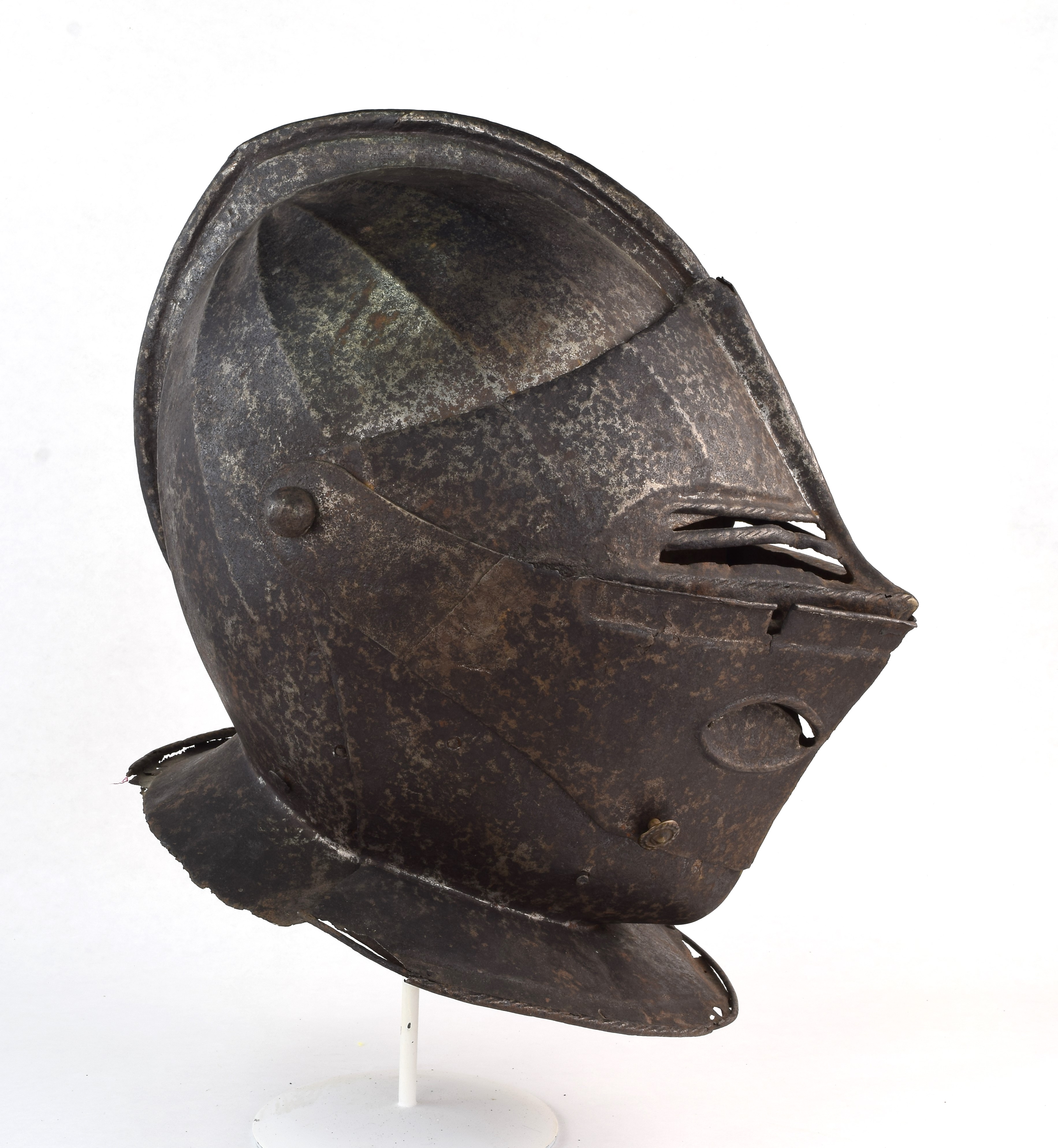 Probably French. Consisting of a skull, bevor, visor and ventail. The skull and visor decorated with flutes radiating from the center of the skull. Two piece skull with flat crest rising to a blunt point at the center. The two parts of the bowl joined with a round roll at the top of the crest (the right side rolled over the left). The roll decorated with fine roping. Bowl with integral neck flare. Edge of the face hole with a narrow finely roped inward turned border and a parallel recessed band. Bevor formed to the chin with an integral flare at the neck en-suite with the bowl. The edge of the neck flares with a finely roped inward turned roll (turned over wire) and a parallel recessed border ensuite with the rolls and border on the bowl. Visor with central ridge continuing the crest from the bowl. Divided eyeslots also divided horizontally with a central roped ridge. Ventail decorated with eye shaped raised bands on both sides, the center recessed and pierced at the top. Overall heavily pitted. Losses to the edges of the neck flares. Ventail cracked at the center and with a repair to the right arm. Hook thta would have secured the ventail lost. Visor lifting peg lost.