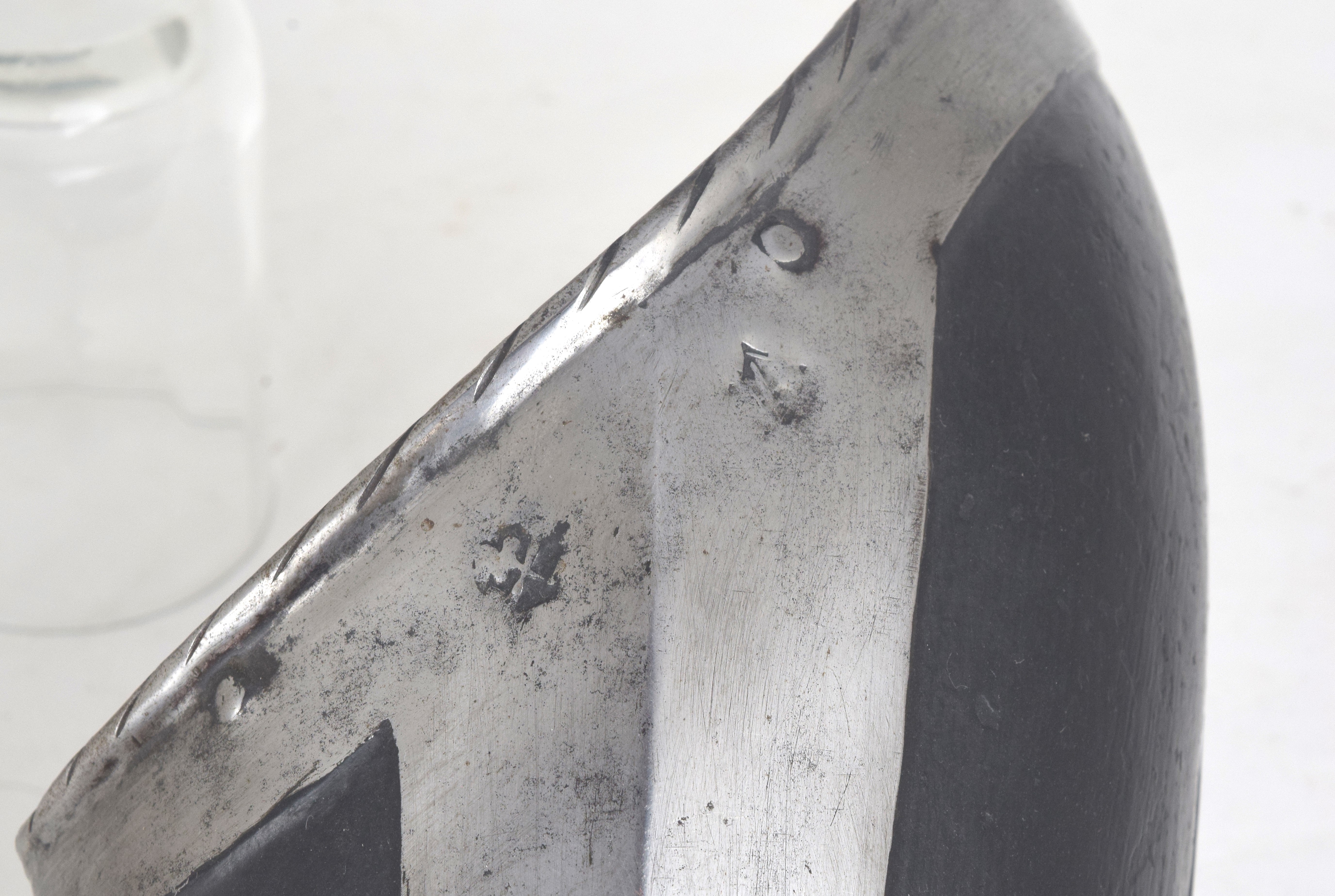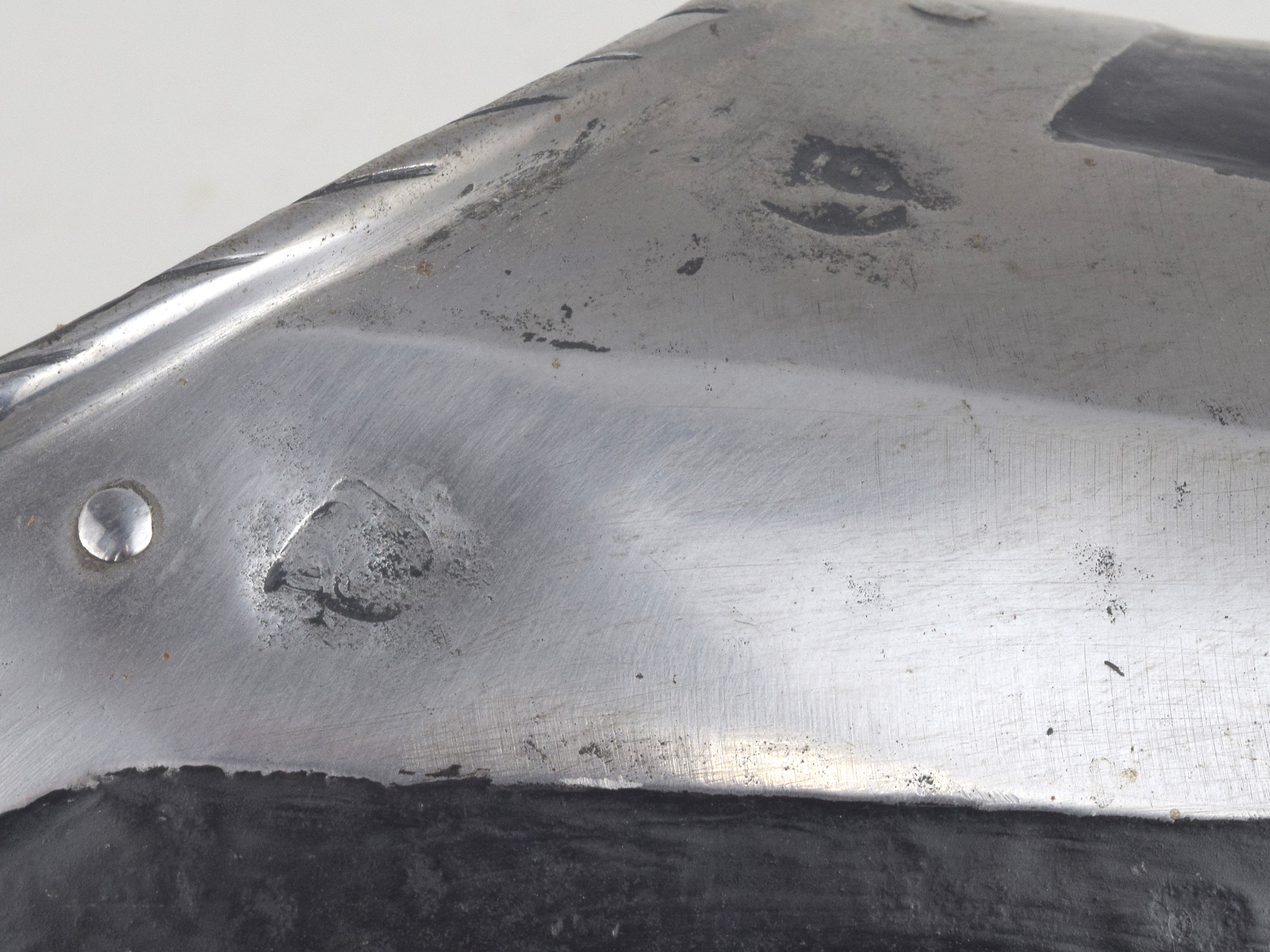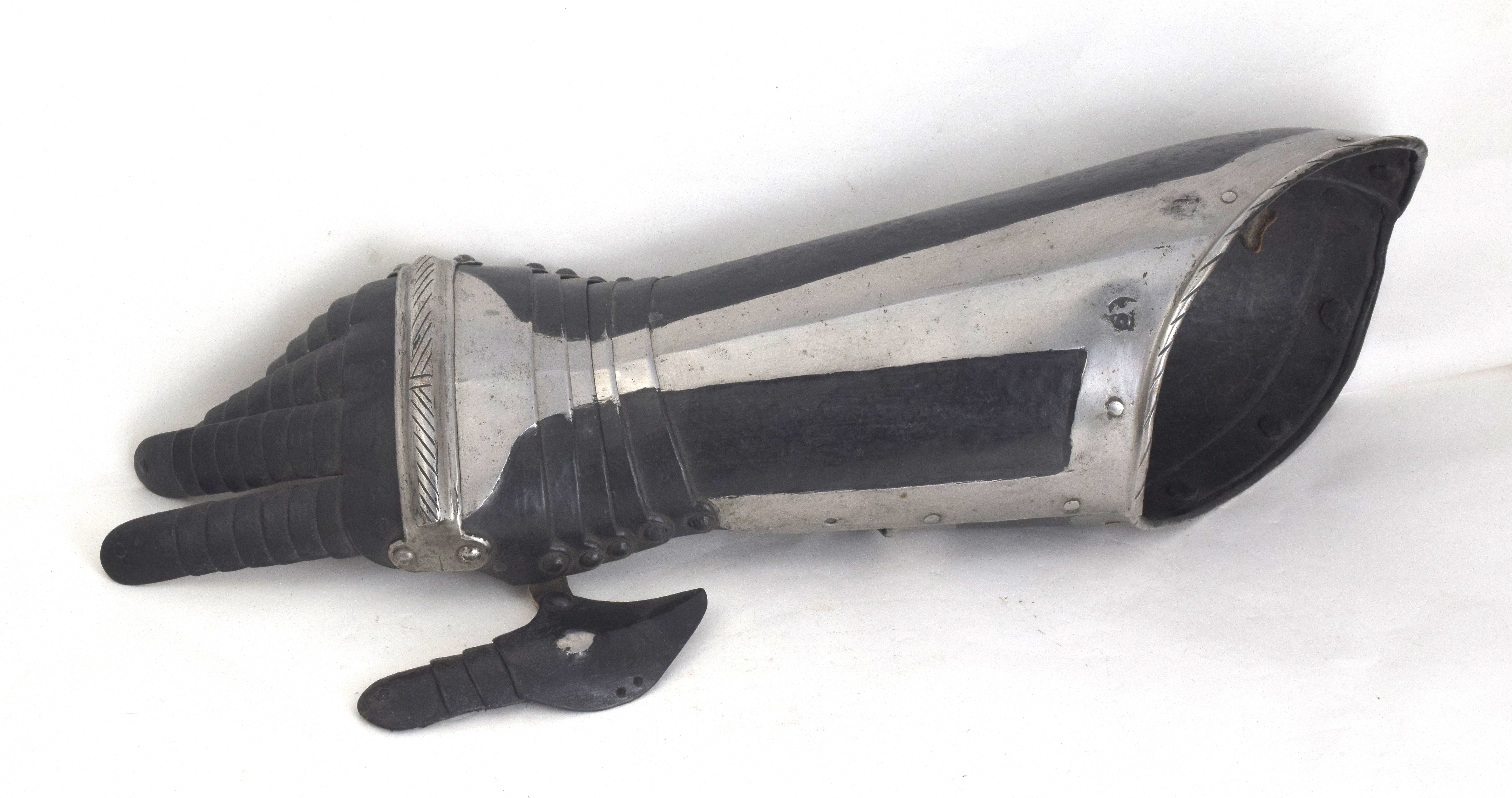 Good quality black and white gauntlets with raised bands and recessed ground. Bands polished. 2 marks on each gauntlet. On one, a recognizable part of the Nurenberg guild mark. Remaining marks unclear. Cuffs of 2 plates attached by rivets. Metacarpal of four narrow and one wider plate. Knuckle plate with raised, roped ridge. Additional plate formed to the fingers between the knuckle plate and finger plates. Large thumb plate attached to the large metacarpal plate with leather. Re-leathered fingers.