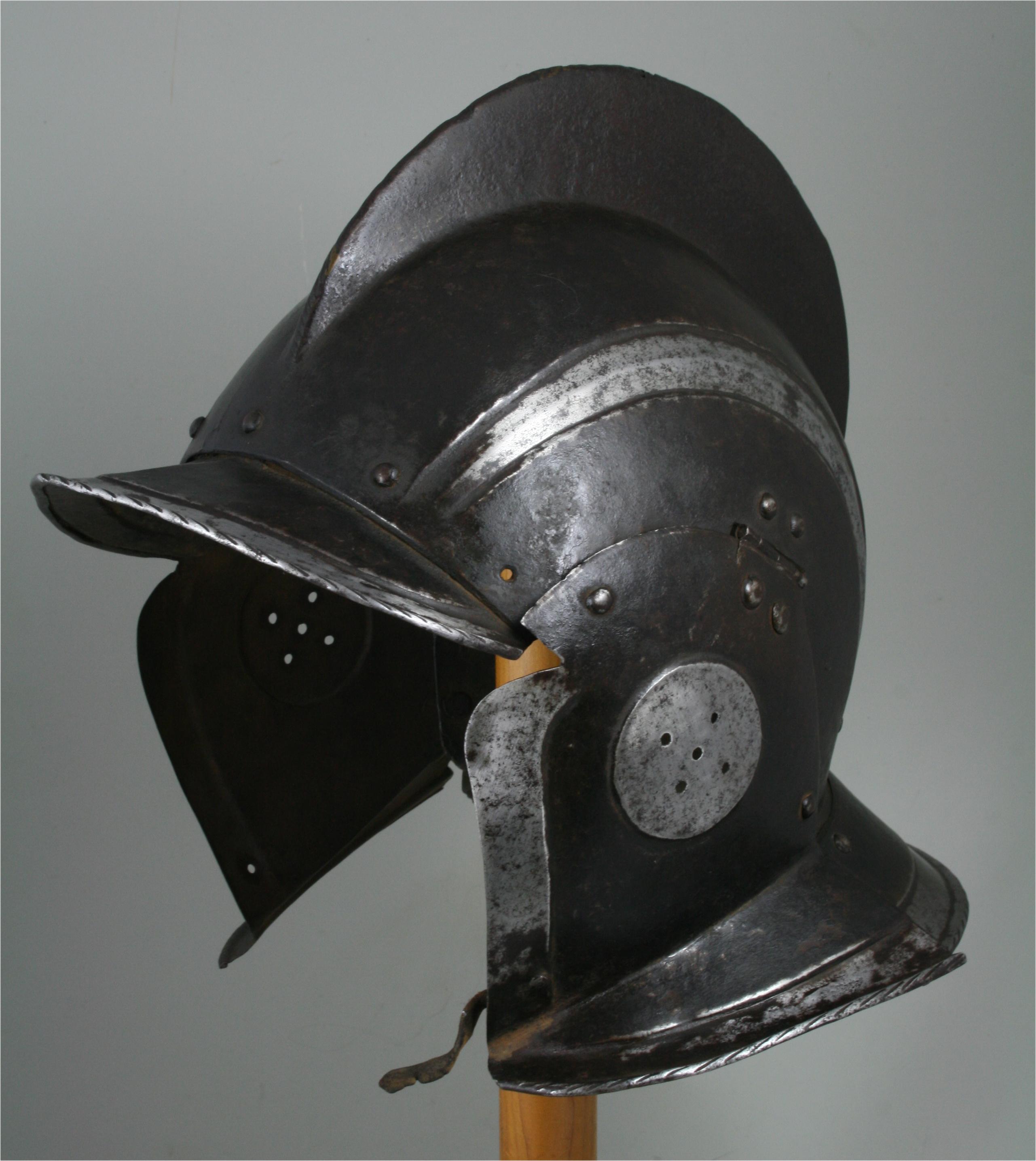 Of 'Black and White' form with recessed bands on each side of the skull. High, roped comb. Neck plate and brim formed of separate plates, each with rolled, recessed and roped borders. Cheek plates with flared bottom (conforming to the neck plate), raised circle in the center and a raised edge at the face openning. Signs of delamination as is common with authentic pieces. Includes original patch at the tail flare and 2 rivets to stabilize laminations at the forhead. Extremely fine roping on the rolls. Likely indistinct Nuremberg guild mark in the white band near the point of the brim. White bands lightly cleaned to restore original look. Right cheek plate replaced. Overall oxidized and stabilized surface. No signs of cleaning that would affect the surface. Small holes in the comb almost certainly from corrosion. Thickness of the bowl pretty consistently .050 in. Weight 3 pounds (1360 g).