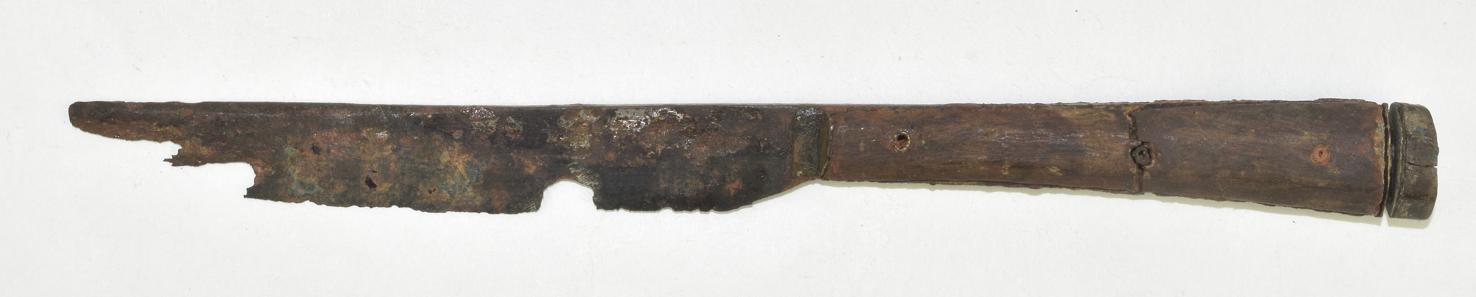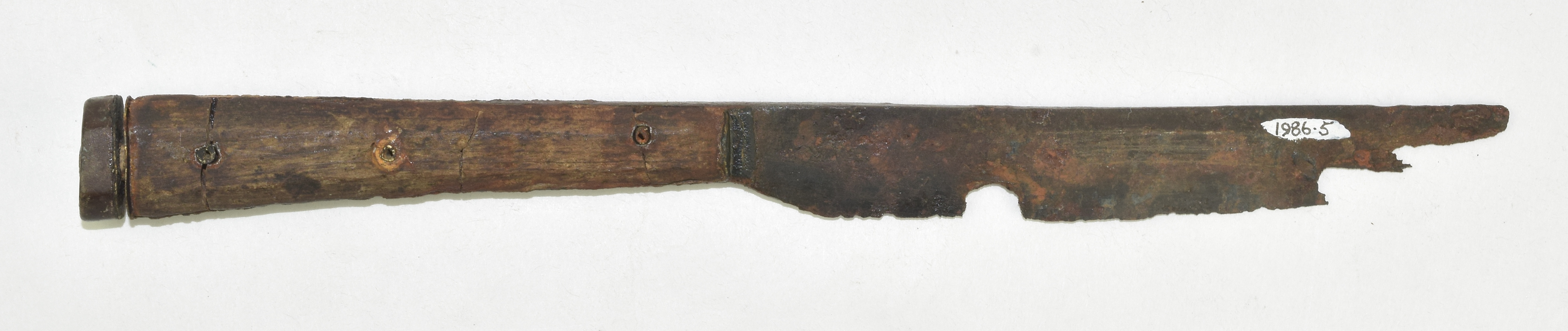 Wooden scales attached by tubular brass rivets. The bolsters are brass. the handle is terminated by a horn end cap - between this and the wooden scales 2 thin brass plates remain. There would have been some organic (possibly leather) spacer between these two brass pieces, overall forming a very decorative end. Each scale is beveled - forming a hexagonal handle.