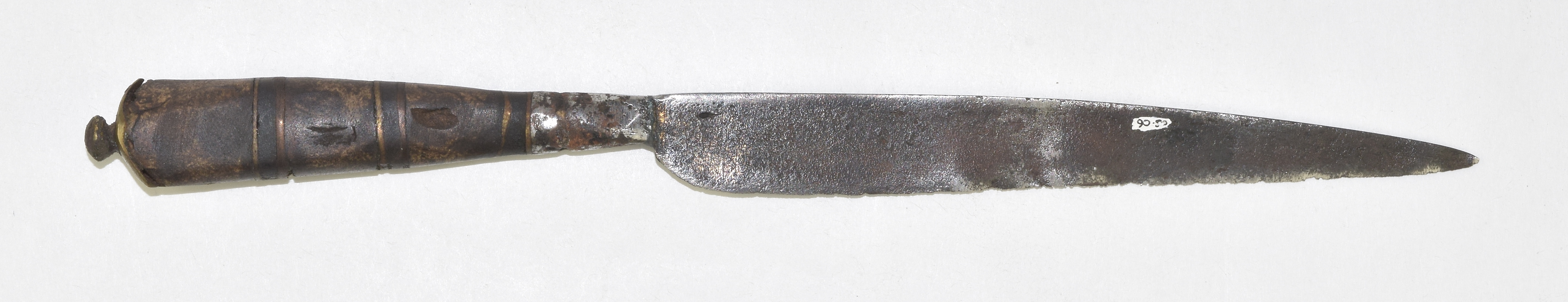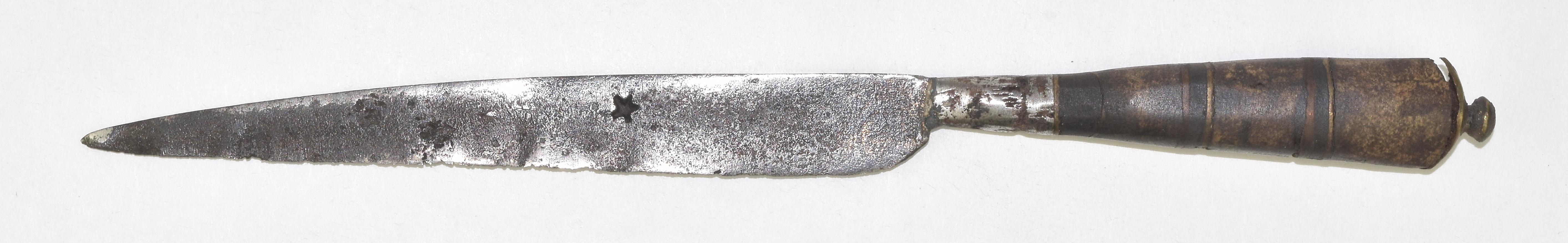 Wood handle, integral iron bolster, whittle tang, laten spacers within the handle, laten end cap with decorative finial. Blade marked with a five pointed star cutlers mark. Remnants of gilt on blade. Ex. Col. Simon Moore #90.50