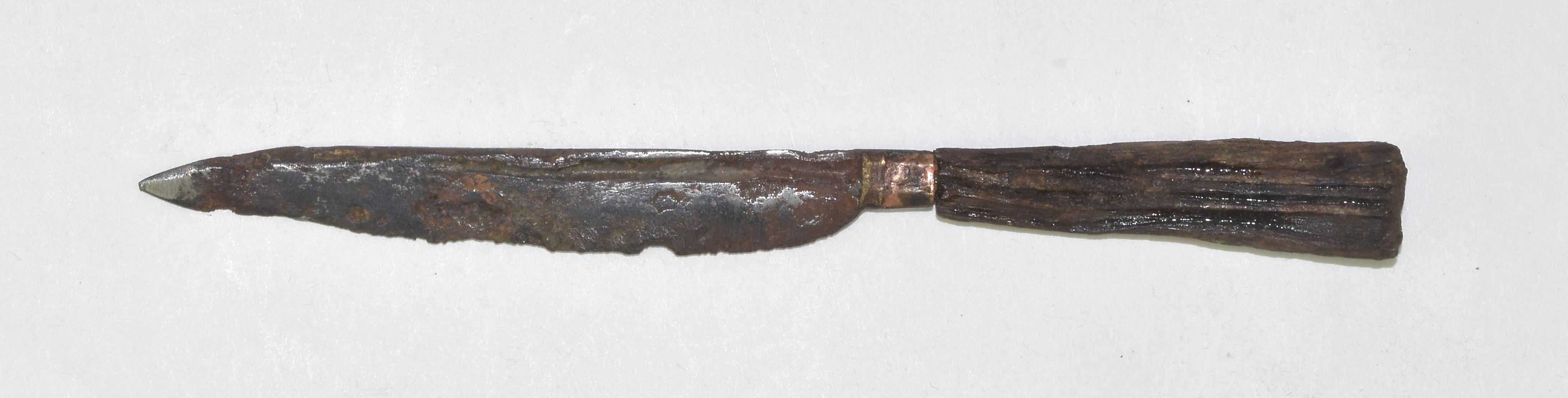 Fullered blade (on one side) Two part copper bolster of sheet with filed decoration. O cutlers mark. Handle formed of a single piece of wood - which has deteriorated.