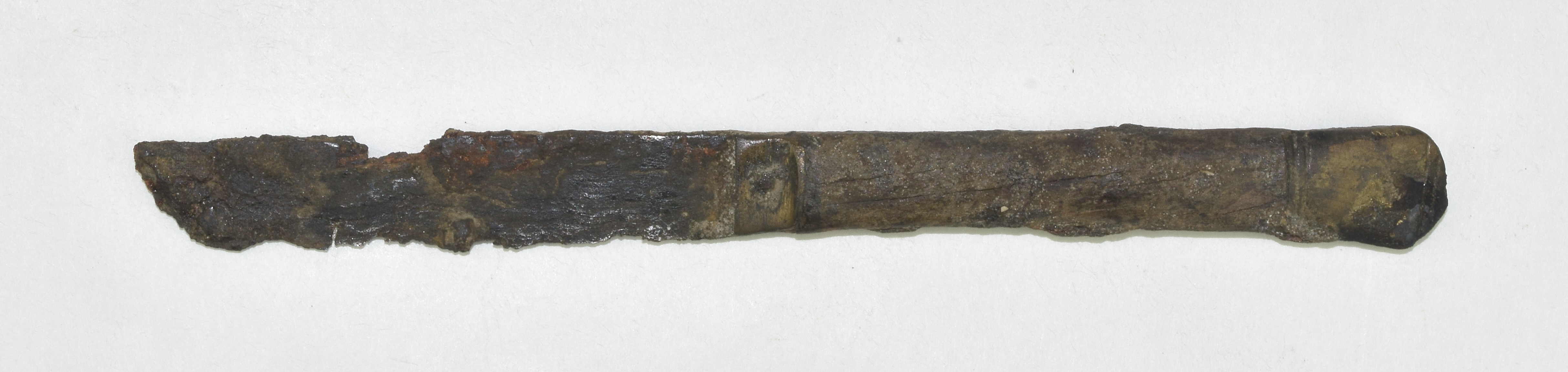 knife handle of 2 wooden scales. Bolster formed of two of brass. Pommel formed of 2 flat pieces of brass. Bolster and pommel with engraved line decoration and remains of gilding. Scales affixed by solid brass rivets. Handle in remarkablly good condition. Blade with (likely) significant losses.