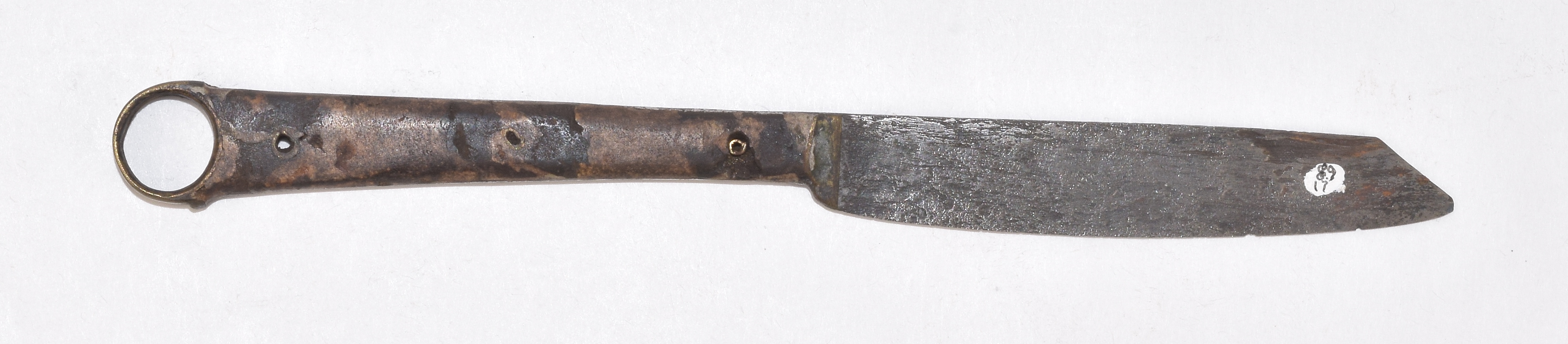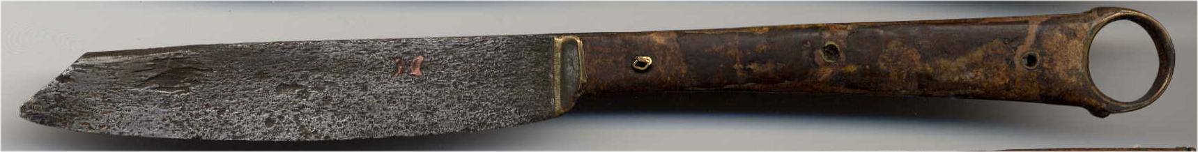 Clip pointed blade with rounded edge. copper-marked double crescent. Two piece applied copper alloy bolster. dudgeon scale haft secured by three tubular rivets. Handle terminated by a large ring finial. From the Thames. Ex. Col. Simon Moore #89.17.