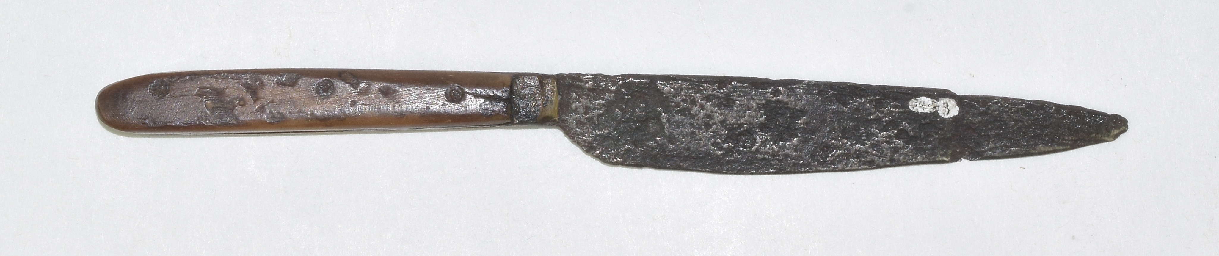 Handle formed of bone scales. Flat through tang secured by small pins. Applied latten bolster formed of two scales.