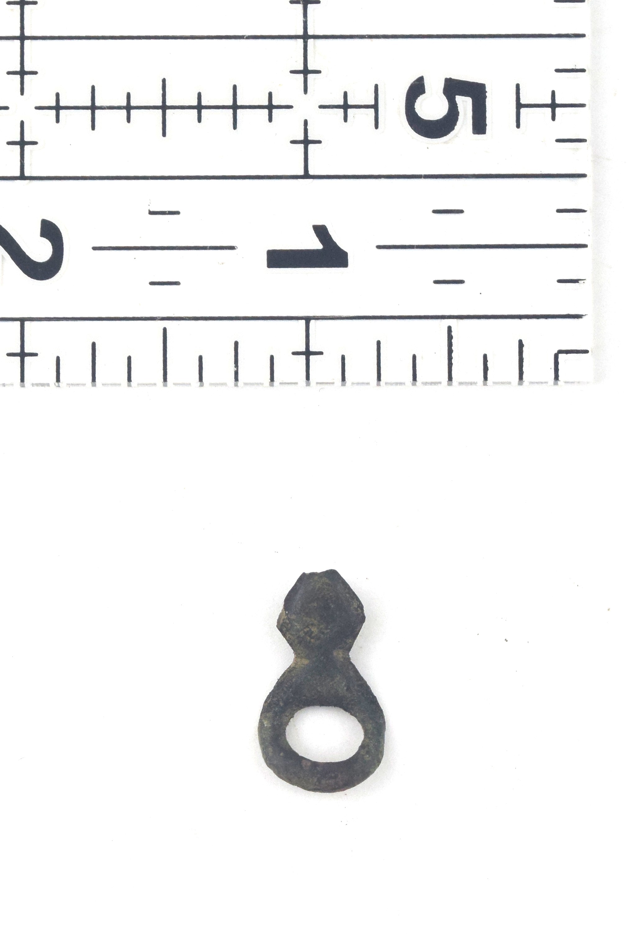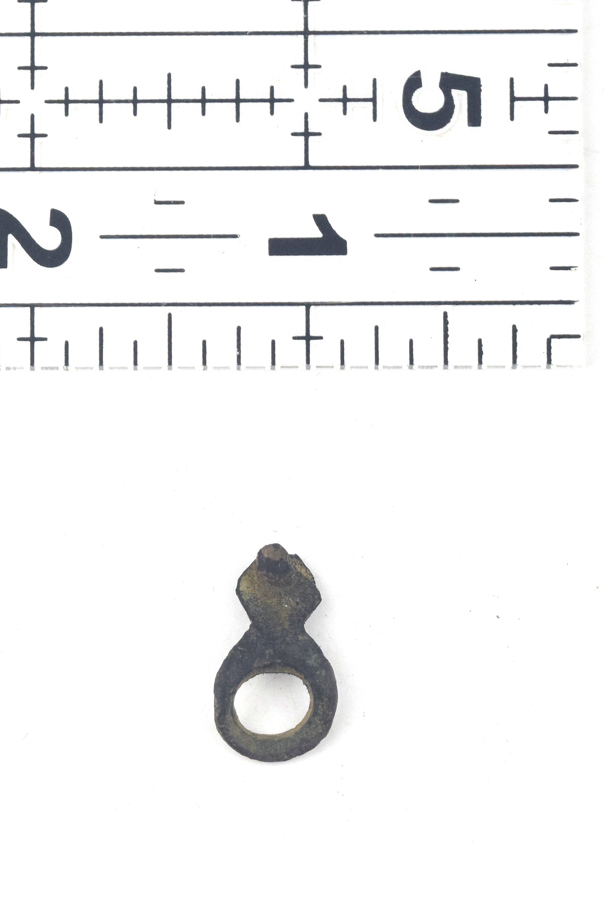 Copper alloy. A simple loop secured by a single integral rivet post. These may be somewhere in "Medieval Finds from Excavations in London: 3 - Dress Accessories c. 1150-1450.
