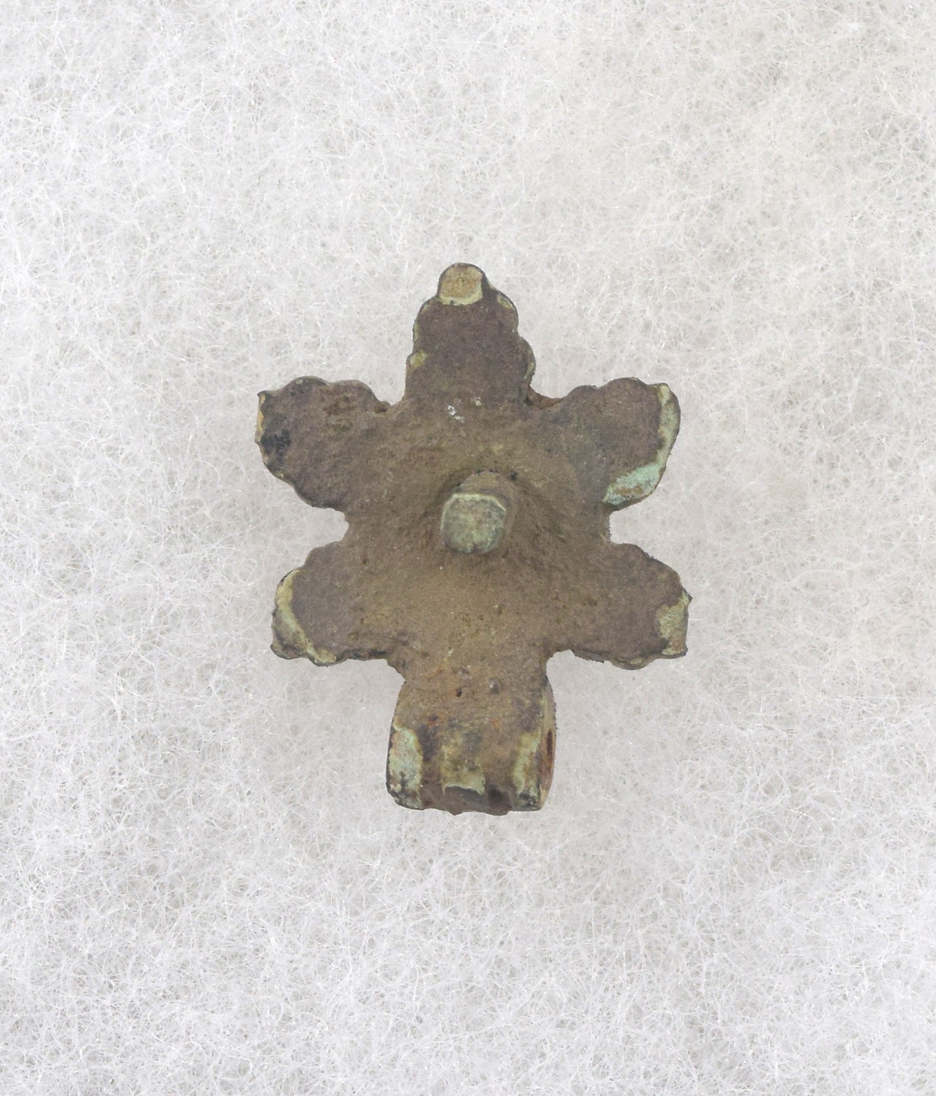 copper alloy. Small remains of gilding. Secured to the belt by a single integral rivet post. Bezel to secure something - likely glass or semi-precious stone. Remains of hinge to secure a pendant.