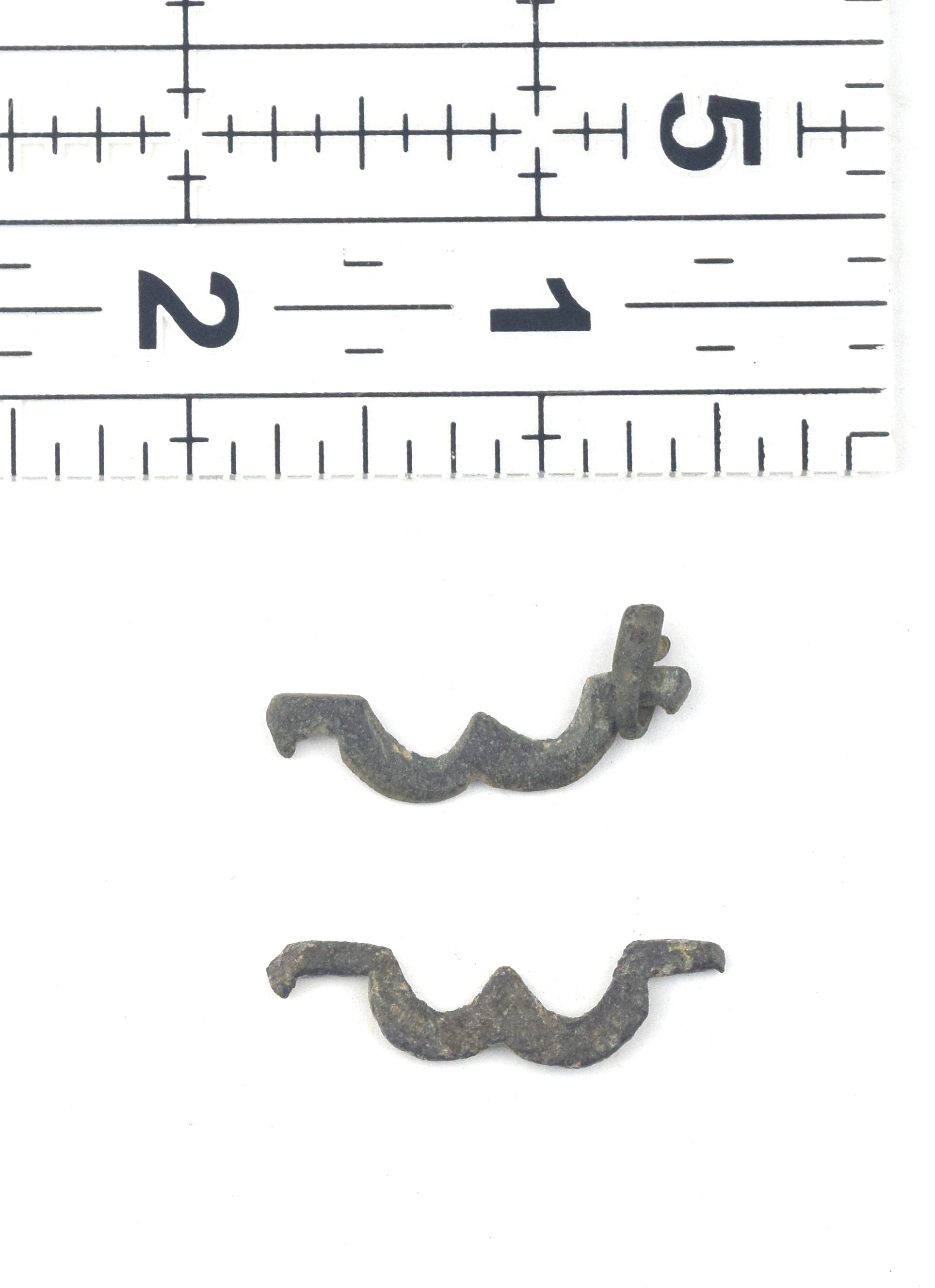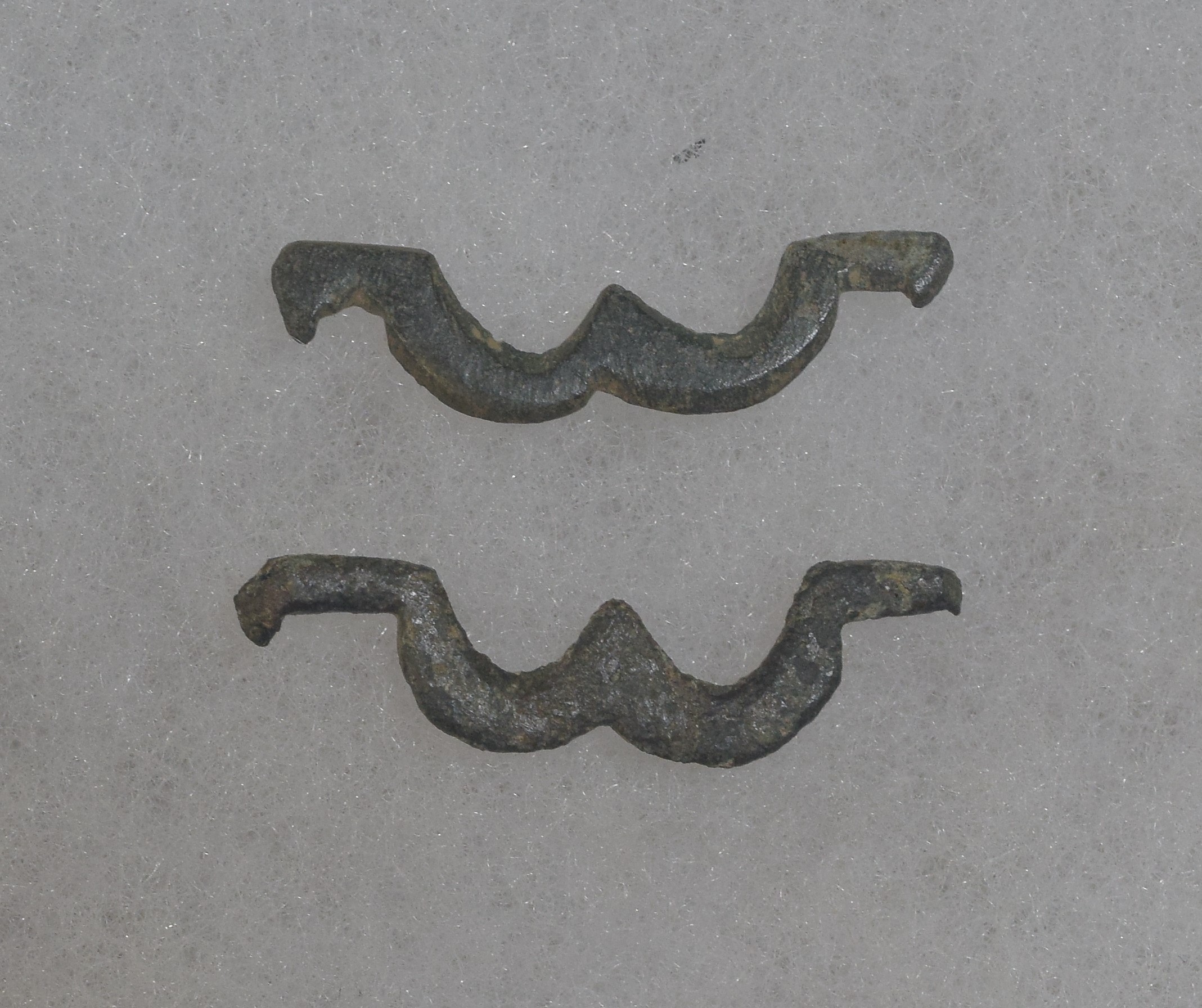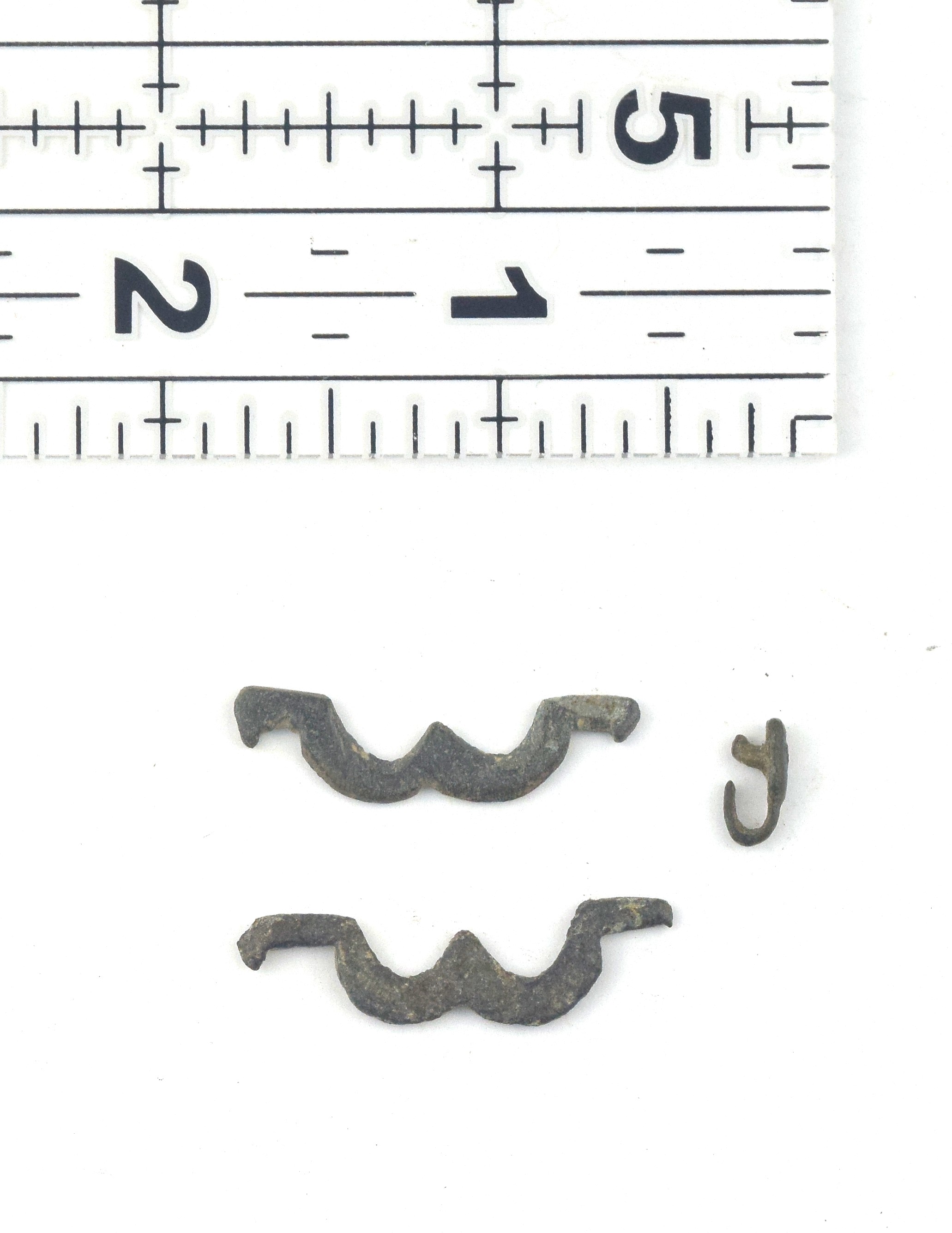 Copper alloy. Two lobed design. They would have been suspended from a belt with U shaped fitting. The images with scale show one of these hangers in place and in profile. These are discussed on pages 219-224 of "Medieval Finds from Excavations in London: 3 - Dress Accessories c. 1150-1450." These examples most closely resemble 1198, but these only have 2 lobes whereas 1198 has 3.