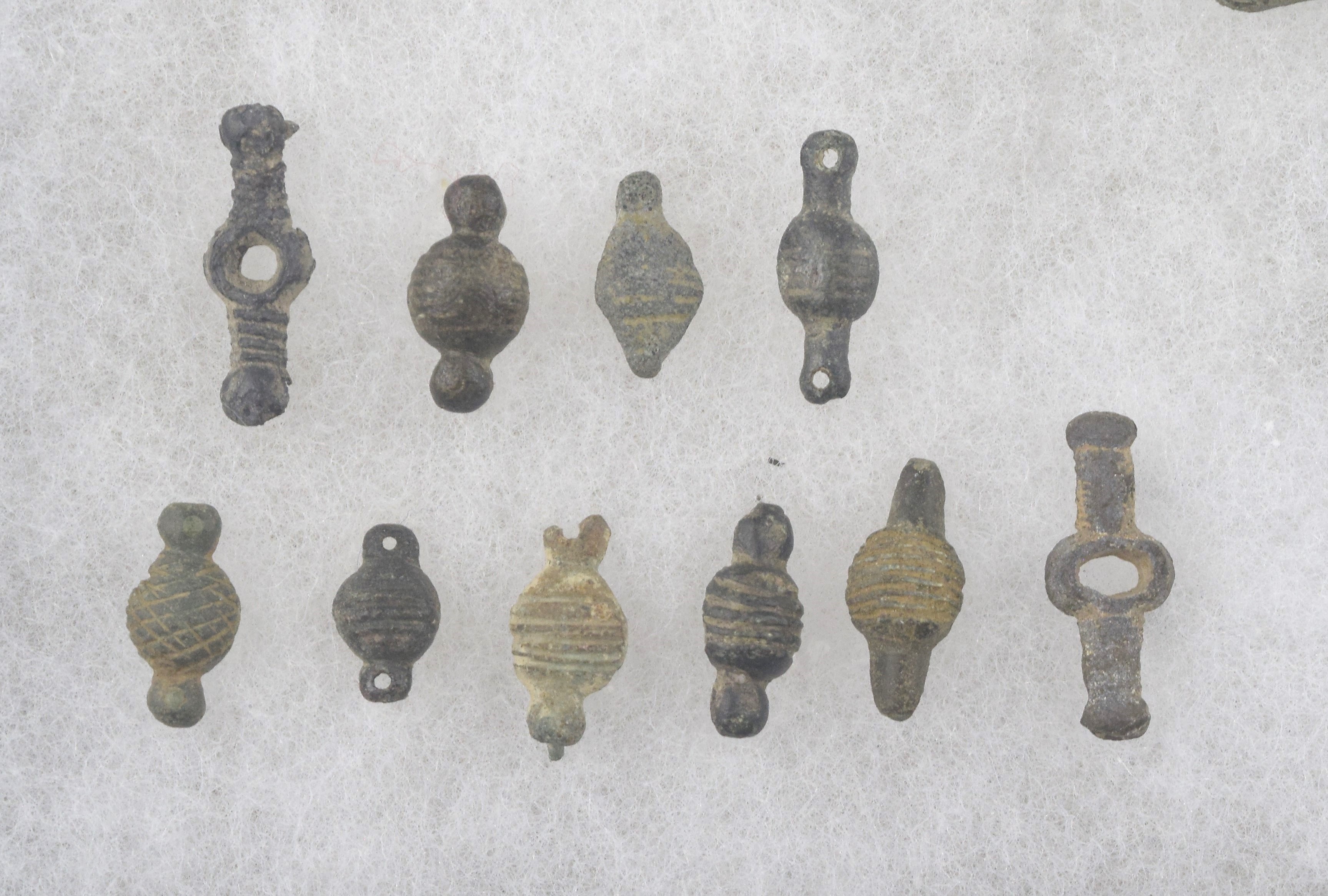 Upper left pewter. The rest copper alloy. Some with central hole, others with central swell. An assortment of belt mounts of several styles.