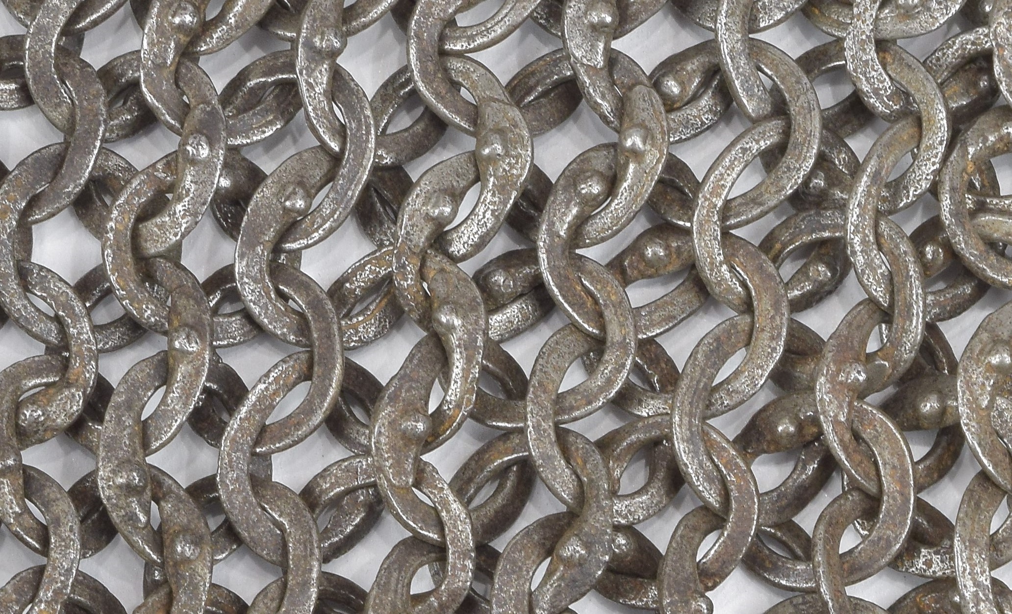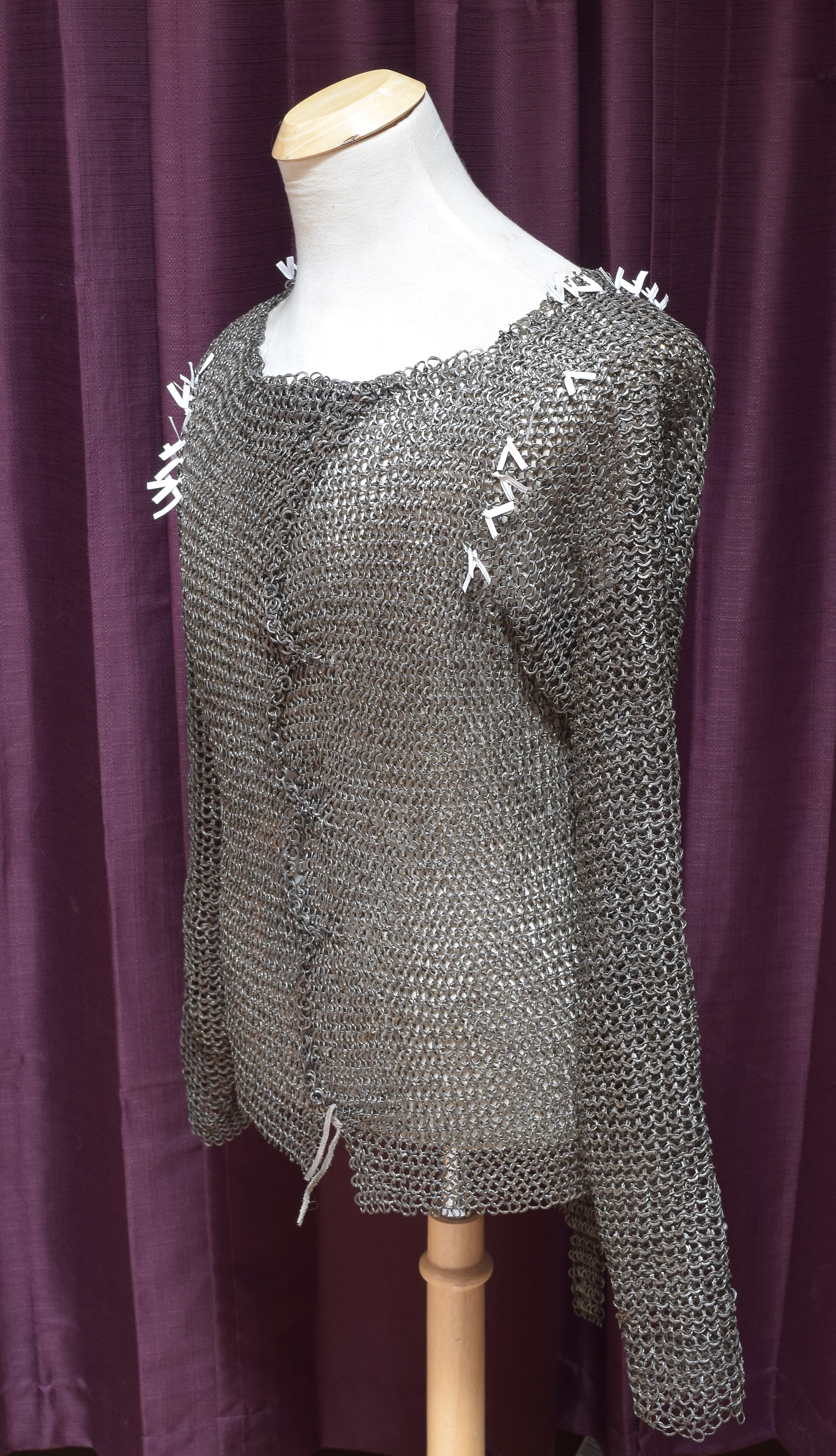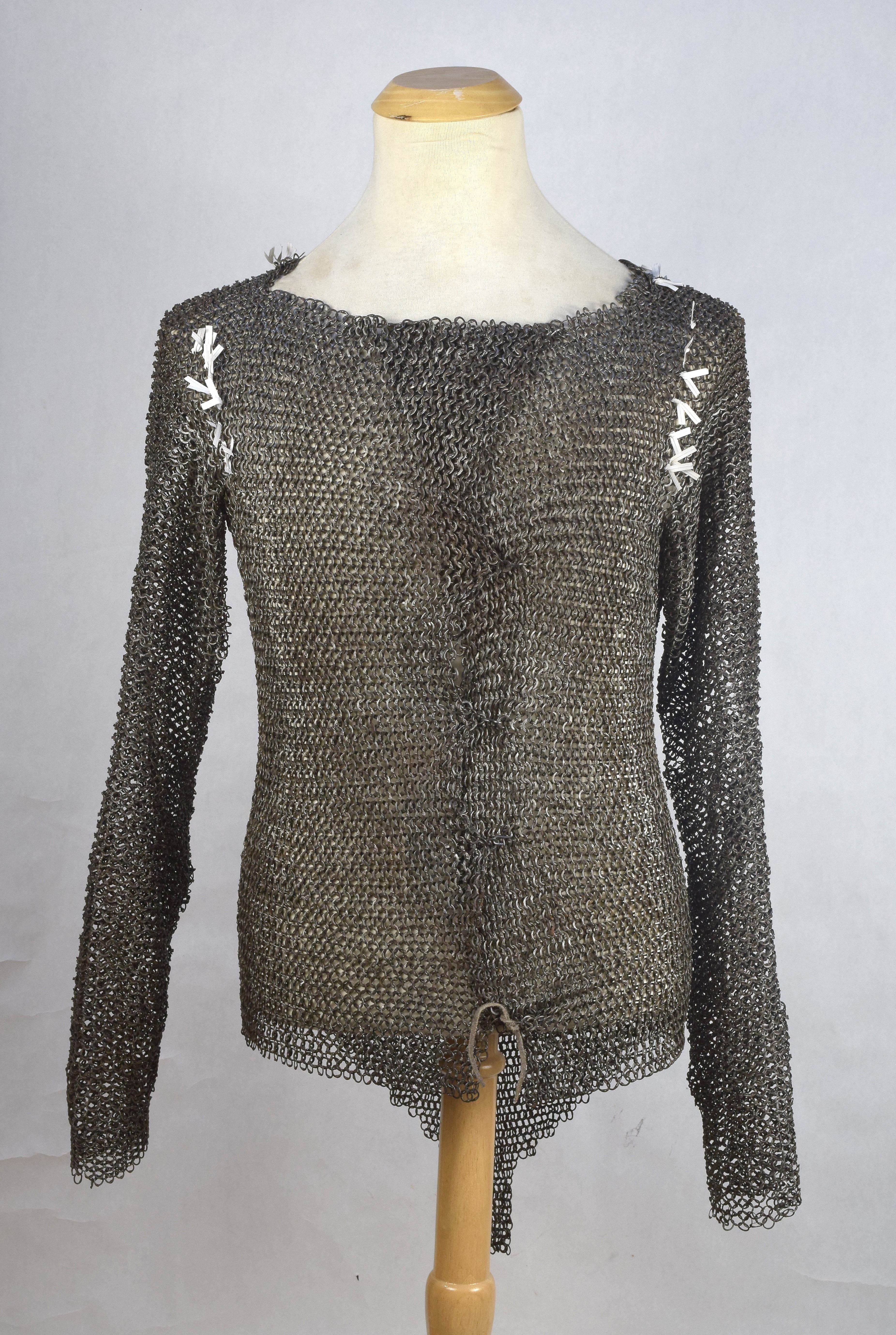 Crotch length body with long sleeves. Opens in the front. Sleeves with elbow bends and tapers in the upper arm and forearm. Arms joined to the body with a row of cross-linked rings at the armpit. There are 13 rings in the body connected by 7 cross-linked rings to 8 rings in the sleeve at this join. Tailored in the back to the shoulders with expansion from the shoulder to the shoulder blades and taper back to the waist. Small extension to the center back that can be pulled up and connected to the short section at the bottom of the left side to form a brayette. There is some expansion leading to this extension that allows the mail to fit to the buttocks. Right sleeve with a narrow cuff formed of 5 rows of much finer mail formed of round wire with wedge rivets also forming a pent roof. Formed of large mostly flat slightly oval rings, secured by wedge rivets with pent roof form at the overlaps. Rings tapering in size somewhat in size from the chest to the wrists and skirt. Some old repairs, assembly or modifications with smaller riveted links. Some minor areas of repair with modern butted links. Left forearm appears to be patched with a forearm from another shirt or sleeve as the wrists don't match and there seems to be one almost full row of butted rings. The repair is formed of nearly identical rings with correct taper, so was from an appropriate piece, not just a random swatch. Tailoring in the back of the body consists of 9 expansions on each side at the shoulder which then lead to 9 contractions back to the waist (10 on the left side). There are two additional rings in the center of the back that provide additional contraction, and two more near inside the base of the right contractions. There appears to be one spurious expansion as well. Below the waist, just right of center, there is a single line of 8 expansions which would allow the piece to fit to the buttocks. The shoulder expansions add a ring every even row. The contractions remove one every other even row, then the below waist expansions are also every other even row. There is also tailoring in the front of the shoulder. There are 7 expansions on the left and 9 on the right. The cross grain join at the armpit is 7 rings long (counted on the left). Expansions are marked with white flags, newer images at the top show the most complete map, lower images were taken earlier, before all tailoring was found.