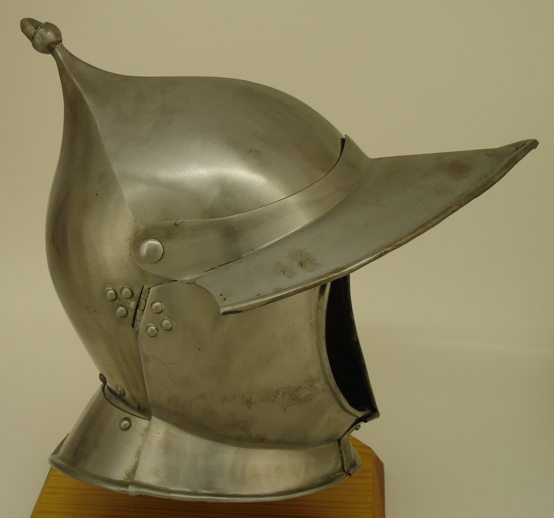 Burgonet with acorn finial. Bowl raised from a cone. Moveable umbril and cheeckpieces that attach with a pin at the chin. Lined with an authentic linen lining of 2 layers stuffed with tow and quilted. All hand stitched. patterned after the burgonet lining in the Allen collection. Stitched to leather strips which are riveted along the face and neck edges of the bowl. Armour by Wade Allen, lining by Tracy Justus.