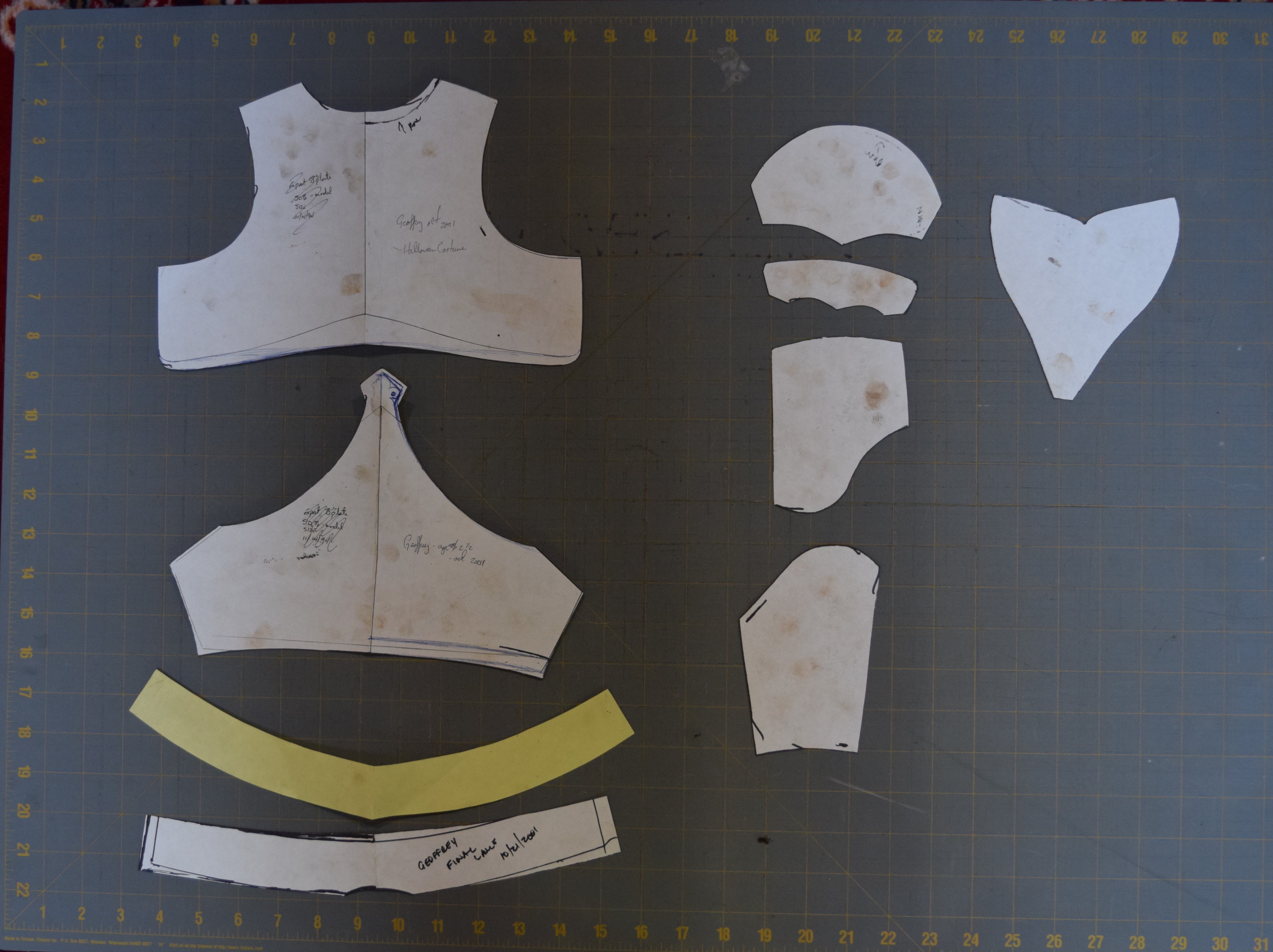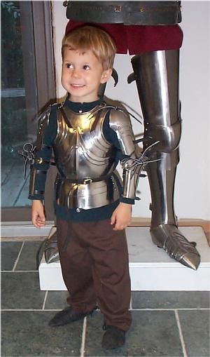 Part armour. German style. Made as a costume for a 2 1/2 year old. Consisting of a breastplate and arms. The breastplate formed of an upper and lower breastplate, the lower carrying a fauld of three lames. The upper with small angular rolls at the neck and arms and with a pair of flutes inside the arc of the armholes. The lower rising to a central point with a simple fleur at the top and pairs of flutes bording the upper edge. The two pieces joined by a central bolt. The bottom edge of the lower breast flared to carry a fauld of three lames articulated at the sides with sliding rivets. The construction of the breastplate mimics item number A-330 which was added to the collection many years later. The arms of open form covering the outside of the arms, and consisting of a spaulder extended to the elbow, a floating elbow cop and a one piece vambrace. The spaulder with a large cop covering the shoulder secured to the upper cannon by two lames. The cop and two lames with three points on the lower edge. The plates are secured by sliding rivets at the back and leathers at the center and front. The spaulder, cop and vambrace secured by a pair of laces above and bellow. Worn with a doublet, pants and turnshoes. Patterns made by scaling down the patterns for a simple pair of arms designed by Wade and Aaron in the 1980's working as Valerius Armouries and scaled down breastplate from one Wade made in the early 1990's. Arm patterns require two of of the small pieces between the spaulder cop and cannon. I don't remember what was used for the third fauld lame. Armour and turn shoes by Wade Allen, doublet by Tracy Justus.