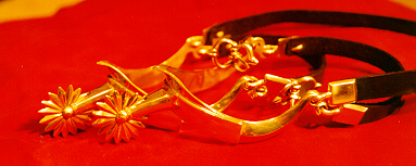 Pair of spurs made for Aaron Toman. Cast brass. Leather straps.