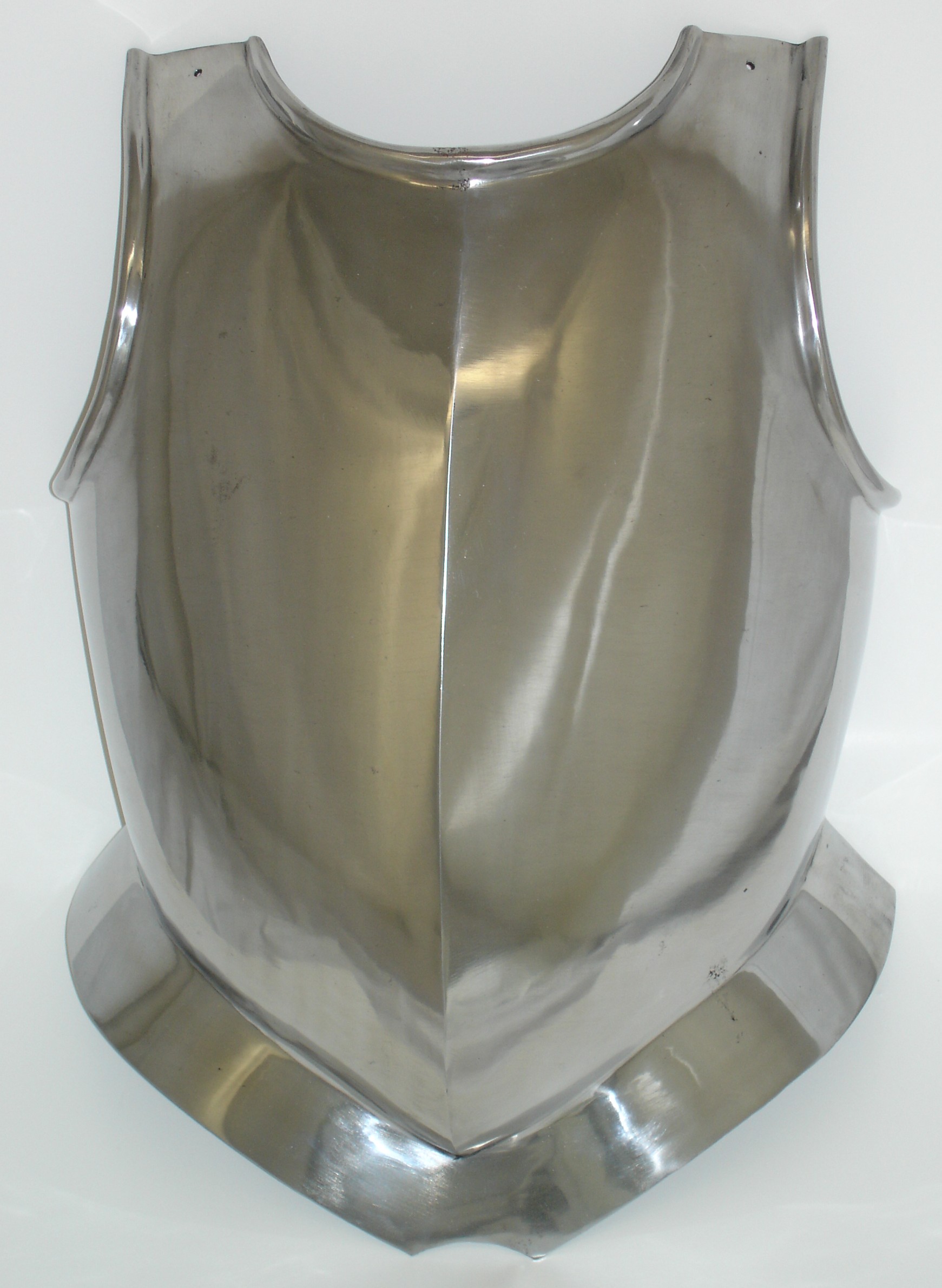 Breastplate. Simple peascod form. Raised from one piece. Rolls at the neck and arms. Flair at the waist.