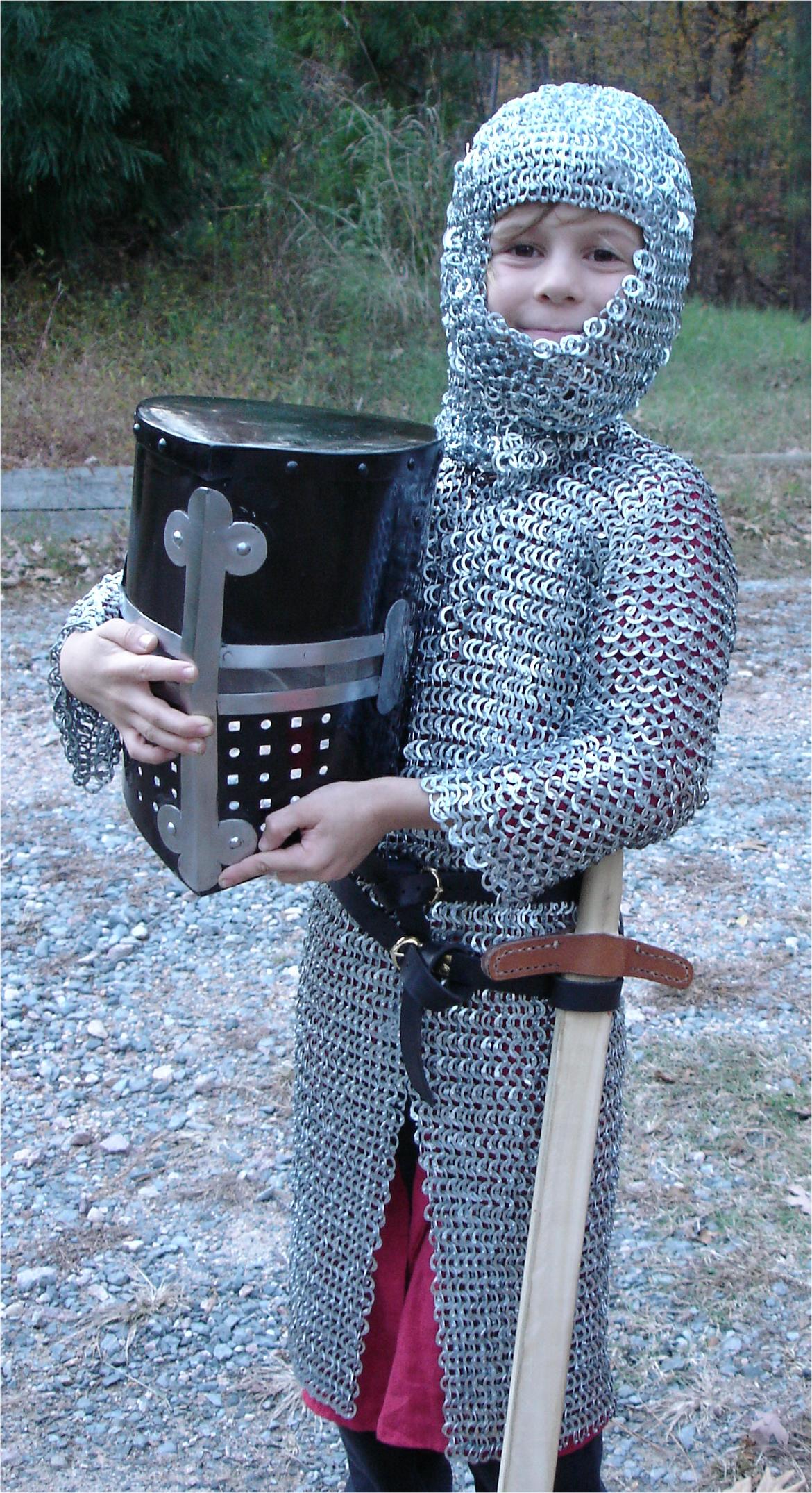 Reproduction armour patterned after David from folio 28 recto of the Maciejowski Bible. Shirt of flat rivetted mail with long sleeves, knee-length skirt with slits front and back and integral hood with ventail allowing a small face opening and to be fitted to the neck. Arms with extra rings forming a bent elbow and with tapered forarms. Helm of 5 pieces with cross applied to the center crease and eye-slots. Together with a padded coif, padded gorget, shirt, belts with custom buckles and mounts and a wooden sword. All clothing items of linen, hand-quilted. Armour made by Wade Allen. Clothing items by Tracy Justus. Constructed 2006.
