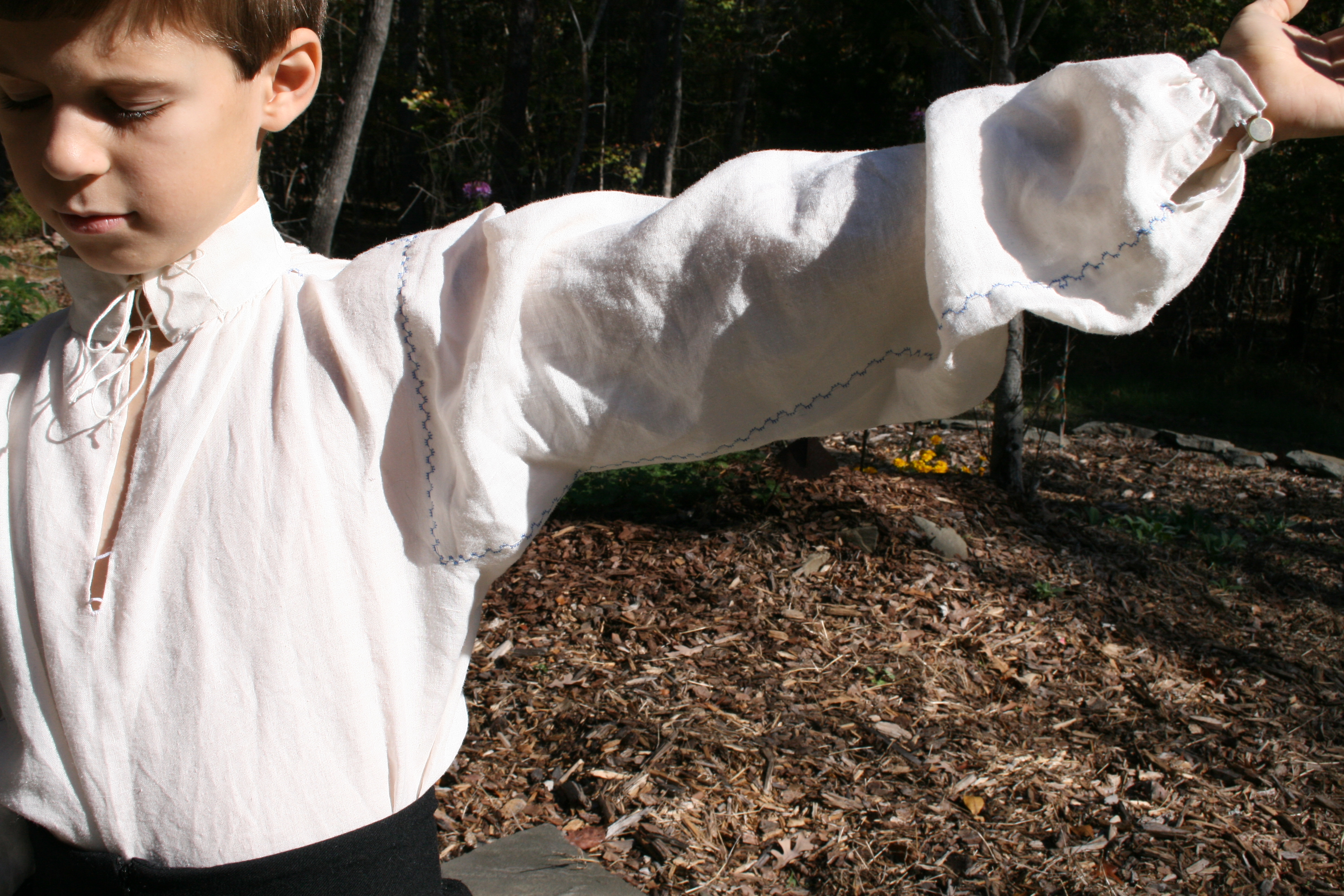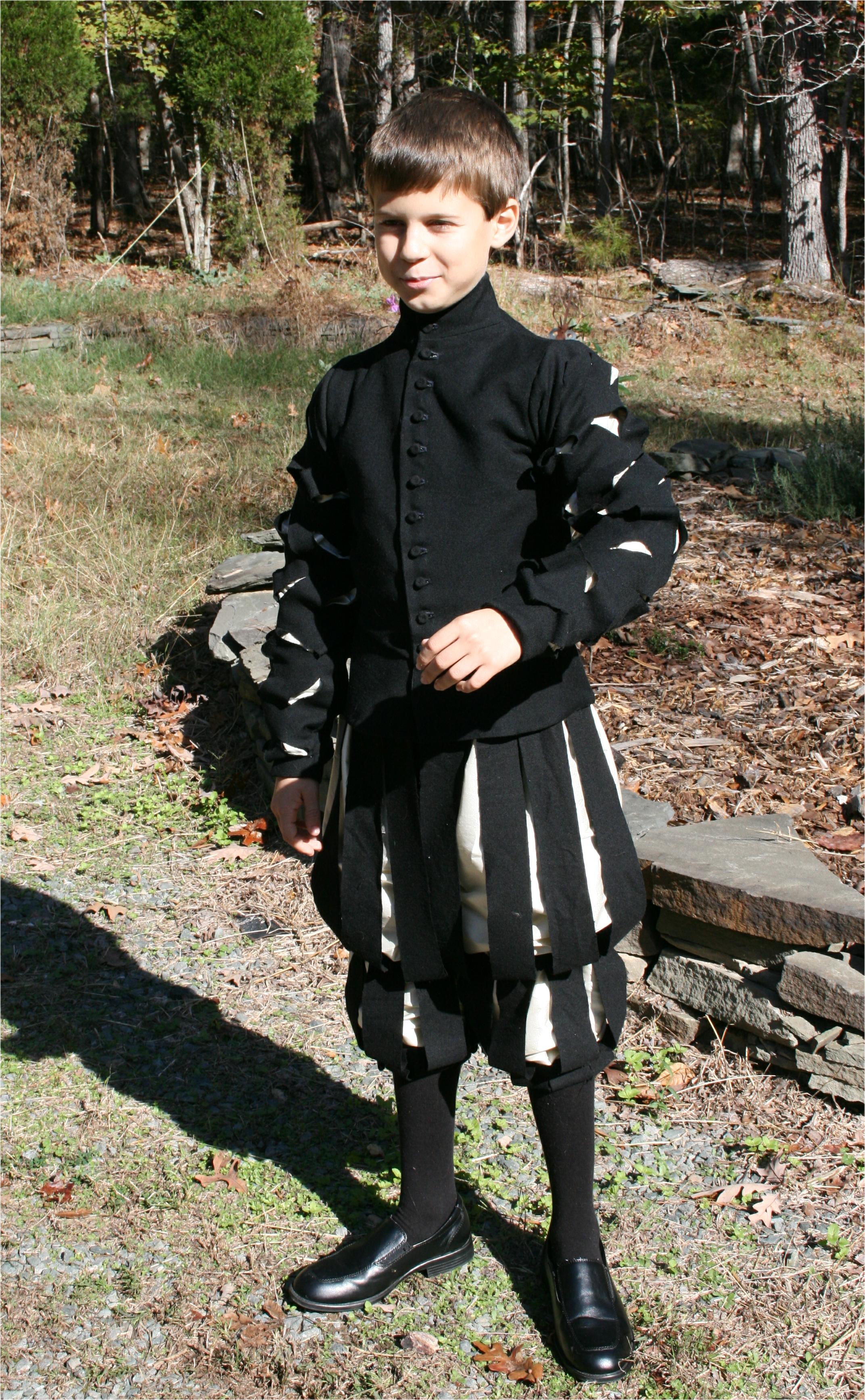 The clothing consists of a shirt, doublet and slops. Socks and shoes are modern. The shirt is based on one in the Victoria and Albert museum in London from 1540-65. It is featured in Janet Arnold's Patterns of Fashion 4. It is assembled in the same way as the original, by finishing the individual pieces and then butting them together and (machine) embroidering over the two pieces to hold them together. The main pieces are held together by the embroidery. This copy omits the frill at neck and wrists. The doublet is fulled wool lined throughout with linen. The white on the sleeves is a layer of silk between the linen sleeve lining and the slashed wool outer sleeve. All three layers are stitched together and treated as one. The wrist openings are bound with a narrow facing. The buttons are based on some found in the Mary Rose. They are formed by covering some 7mm beads with wool which are attached by stitching through the center which gives that little dimple in the center of the button. The diagonal slashing on the sleeves frays very little. The slops are fulled wool lined with linen. The white is a layer of silk between the lining and the wool strips (panes). A rotary cutter is an excellent tool for cutting panes. They were worked flat, mounting the silk onto the linen lining and then laying the panes over that. Then they were assembled into pants. The leg opening is finished with a narrow facing and the waist has a wide waistband. The fly opening is modified in deference to the wearer by adding an invisible zipper (instead of points) and reducing the codpiece to a nearly flat flap (instead of something aggressively masculine).