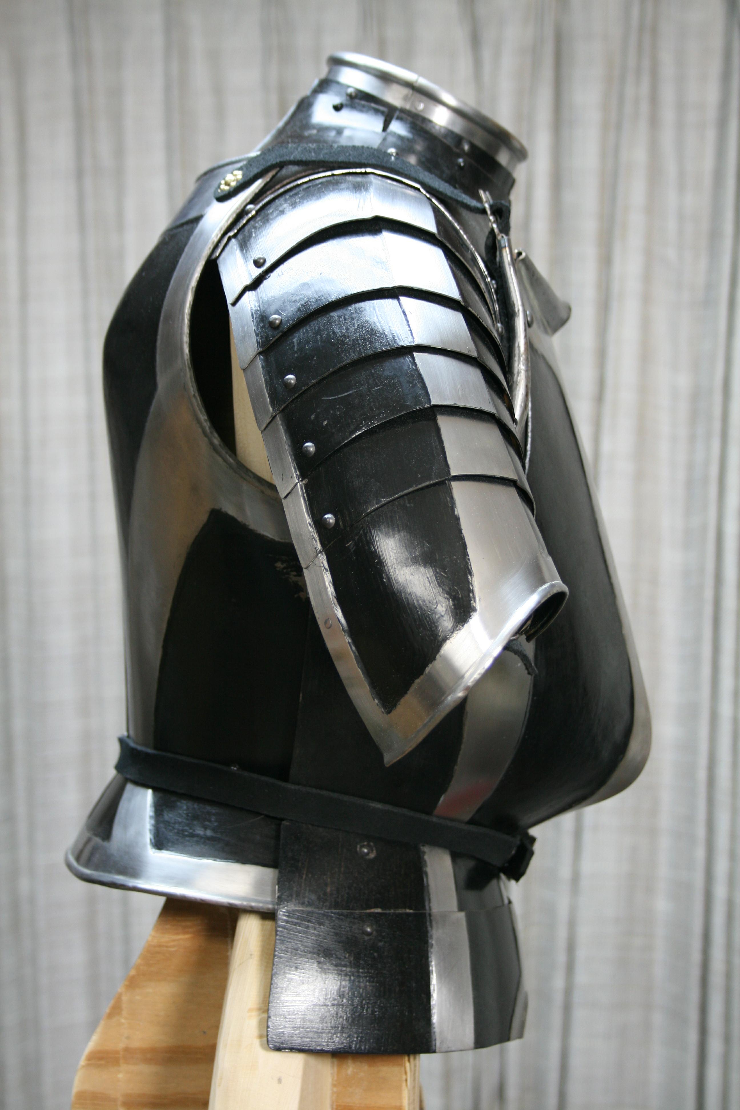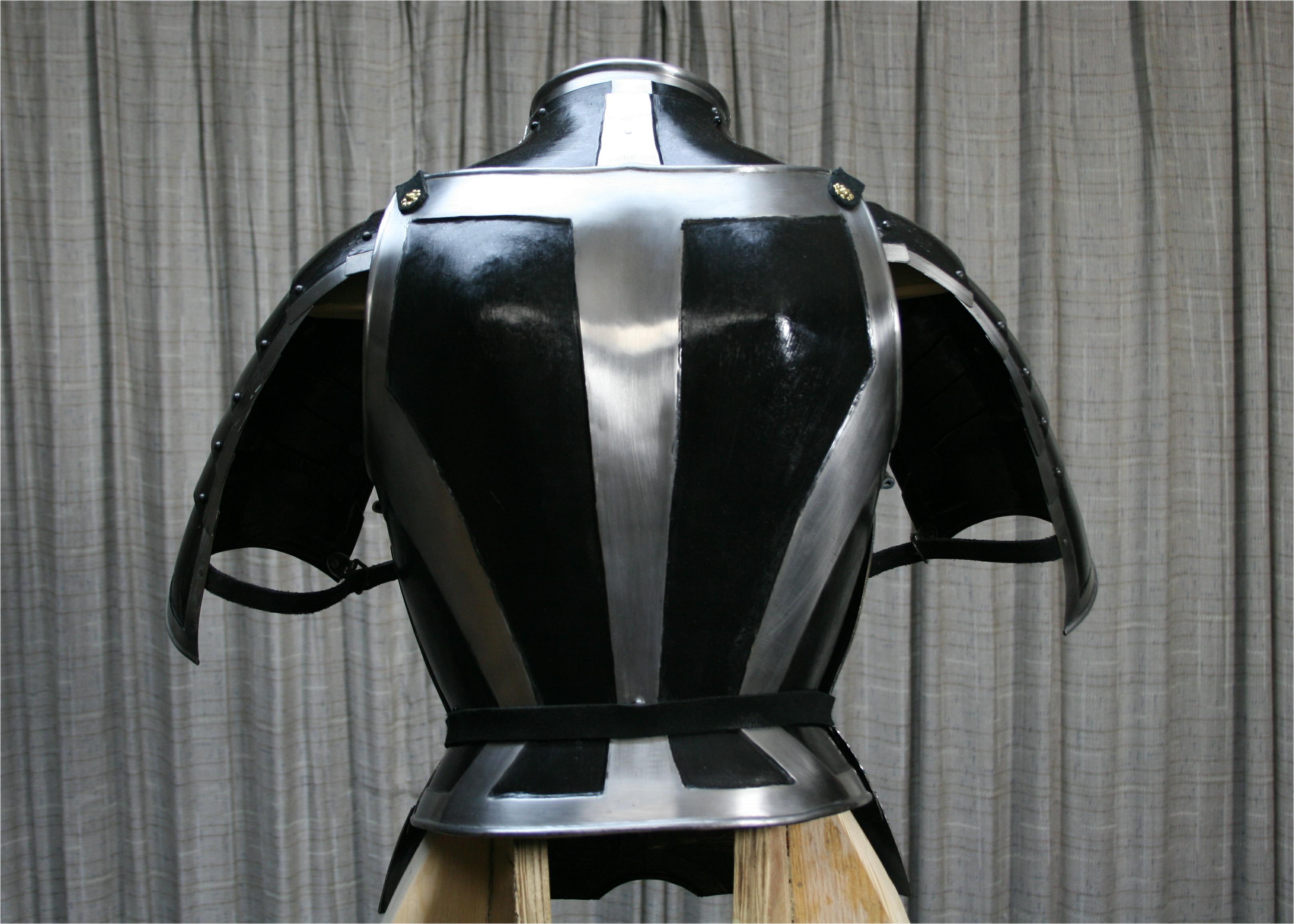 Reproduction of a black and white half armour. Composed of breast, back, and gorget with munions over a doublet and slops.