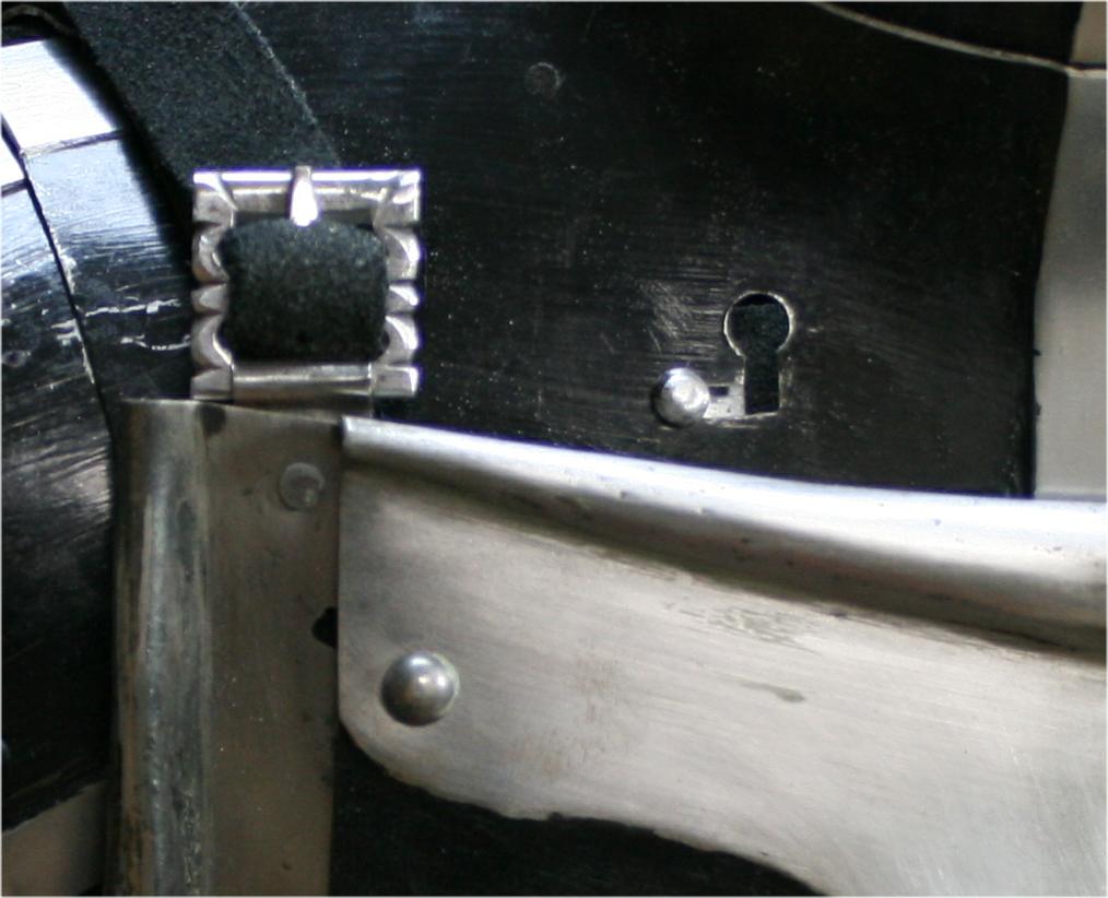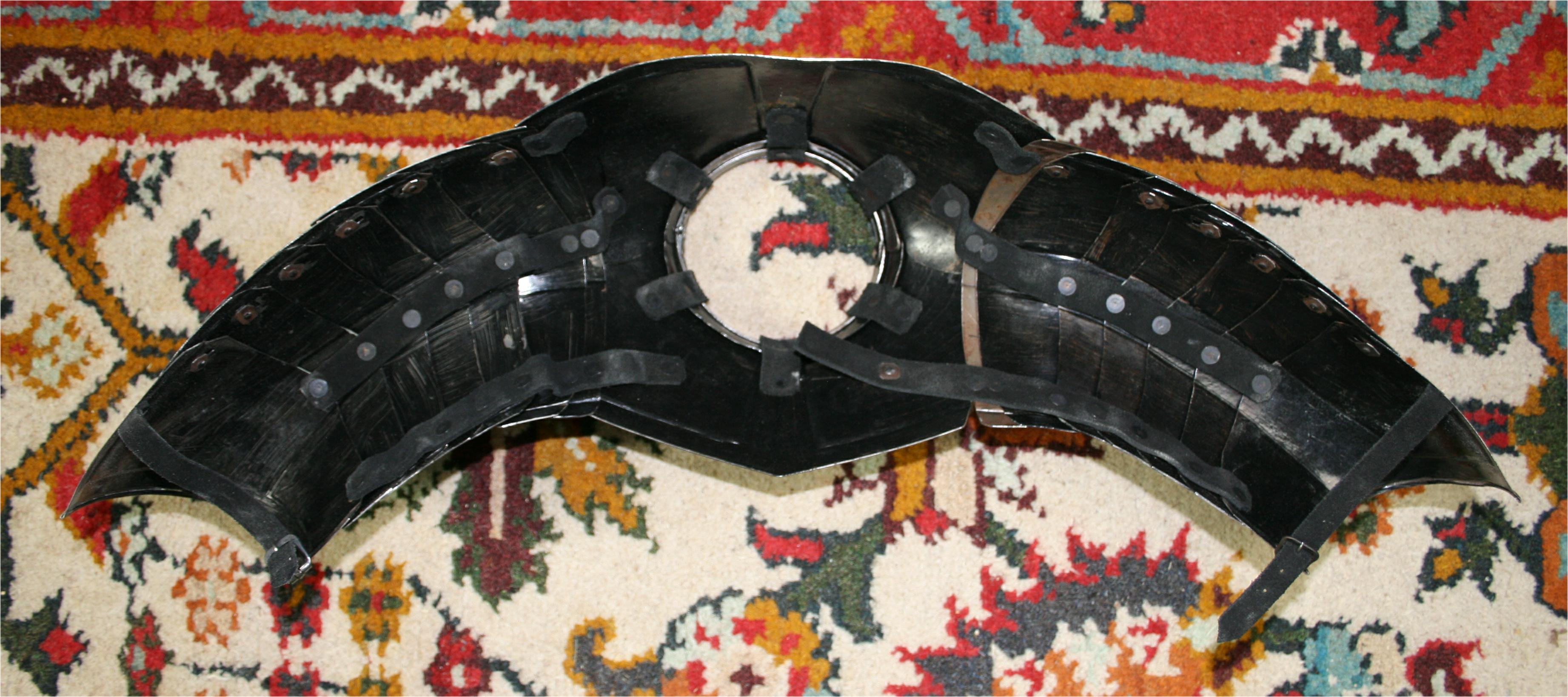 The breastplate has a central crease which is drawn out to a rounded point somewhat below the center. The upper edge is rolled inward. The roll tapers from the center. The arm holes have sliding gussets. The gussets have large, hollow, inward-turned rolls. The breastplate was raised from the flat. A weld at the bottom would have been a lot easier, but I didn't do it that way. The gussets are made from straight strips and flaired to create the roll and to fit into the breastplate. The breastplate has a simple fauld of 2 lames. The lower lame has a small rolled arch at the center. The back plate is fomed of one piece with a separate waist lame forming a degenerate culet. The back is shaped agressively to the shoulder blades almost forming a point over each. The gorget is formed of 2 neck plates front and back, a large main plate front and back and shoulders of 7 lames. The neck lames are secured by 3 leather strips front and back. The shoulder plates are secured by sliding rivets at the back and interior leathers at the center and front. The smaller rolls on the top plate of the gorget, backplate and at the center of the lower fauld lame are turned over wire. The rolls on the bottom edge of the munions are just turned without wire. All of the rolls go 'in' (as appropriate for 16th c. armour). The plates are rough from the hammer with a painted black finish with raised bands of polished steel. Worn with morion A-152.