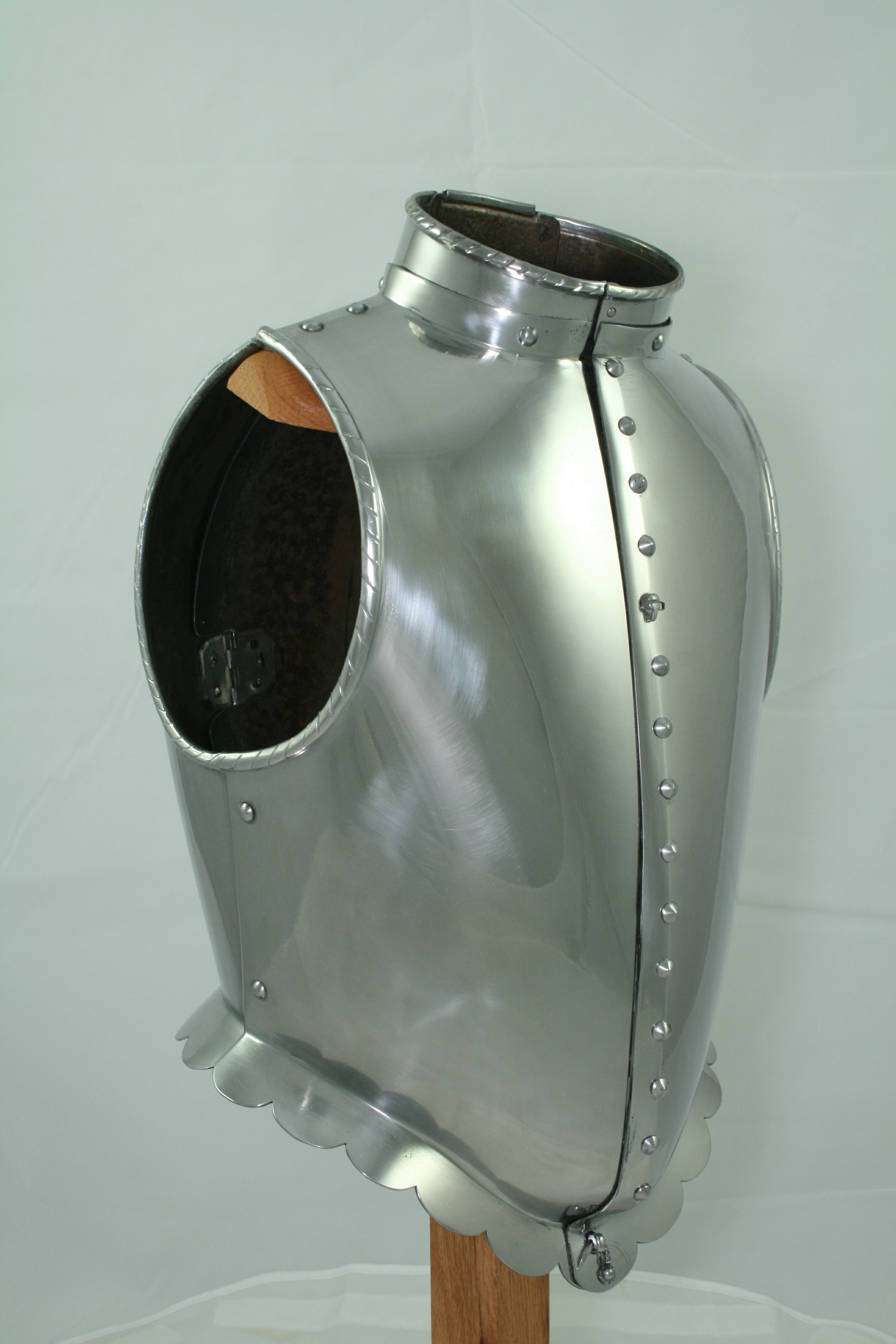 Italian. Formed to mimic the peascod style of civilian clothing popular at the time with a waist that droops at the center of the waist. Arms and neck bordered by inward-turned roped rolls. Waist flaired and cut to form picadills. Formed of five main pieces. The main front and back plates solidly at the side and shoulder. These units are then secured to the central back plate by two hinges and an alignment pin on each side. The front is decorated with a line of pointed buttons and secured by a hook through a hole in a peg at the base, a turning hook in the center and a pin in the gorget plates. The neck is extended to form an integral gorget. The gorget, like the cuirass, is formed of 3 separate pieces. One that extends the central back plate, the others that cover the sides and join at the front. The Italianate details include the form of the peascod (more rounded) the overlap at the center (many German ones just overlap to the center), the buttons down the center, and the relatively straight form of the gorget plates. All of the turns have wire inside.