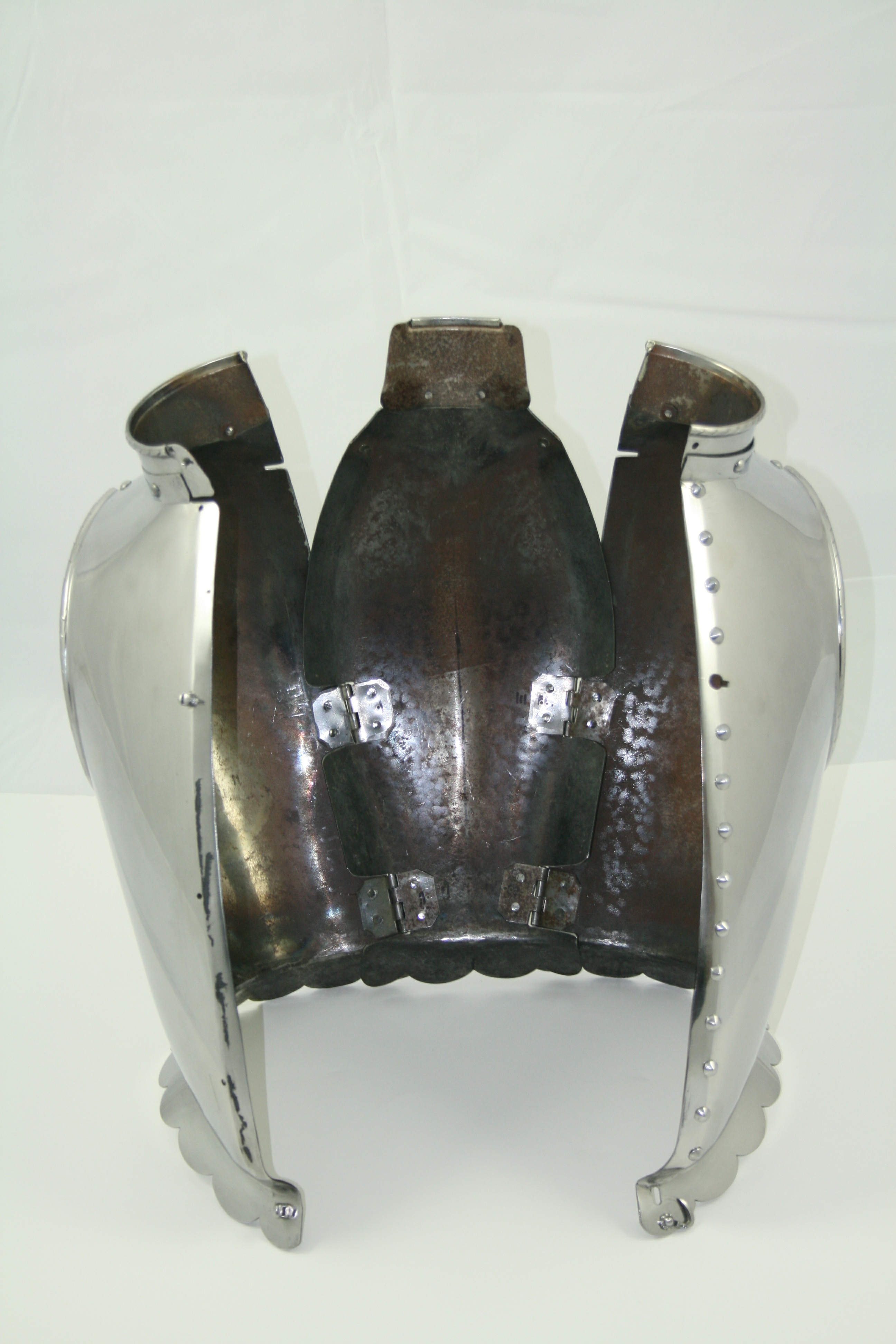 Formed from 14g for the breast plates, 16g for the back plates and 20g for the neck plates. Full-wrap hinges formed of 20g. All of 1050.