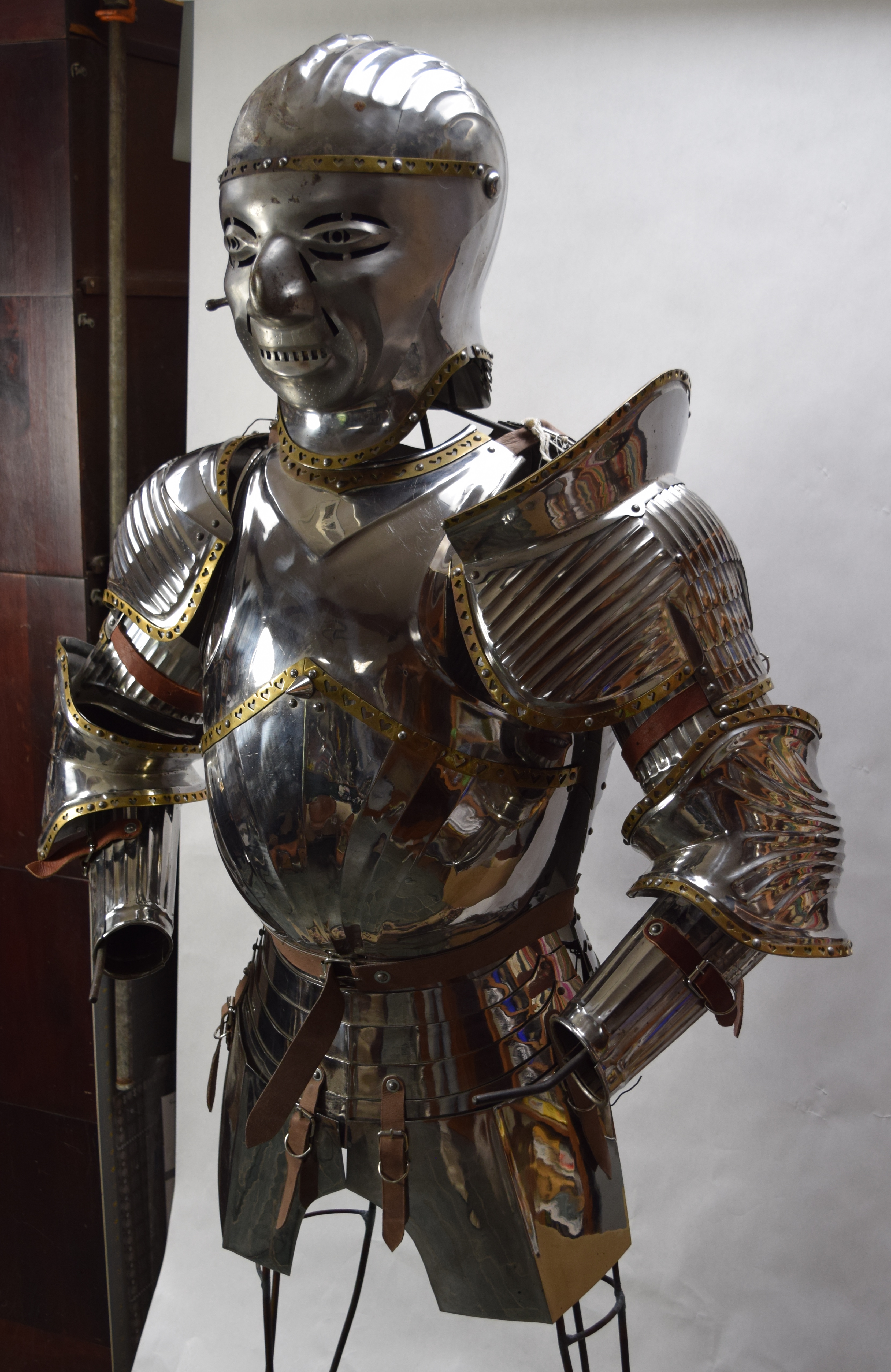 Part armour consisting of a close helmet with grotesque face, cuirass of gothic form complete with fauld, cullet and front tassets, arms and pauldrons with narrow parallel flutes in the Maximillian form.