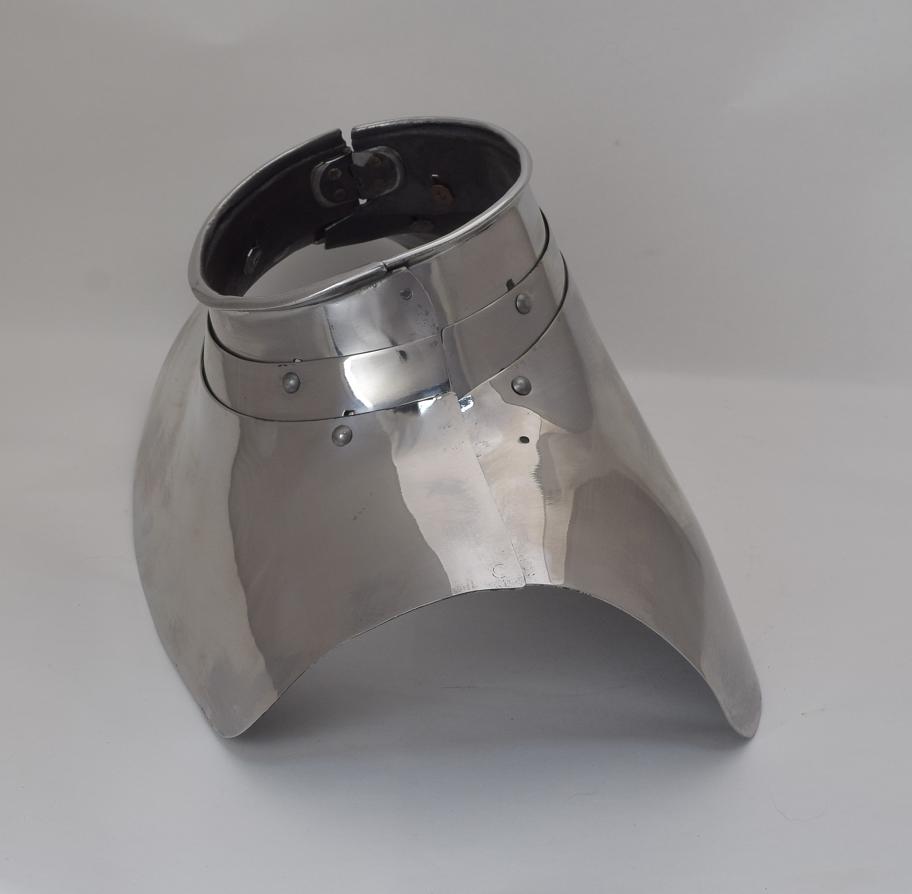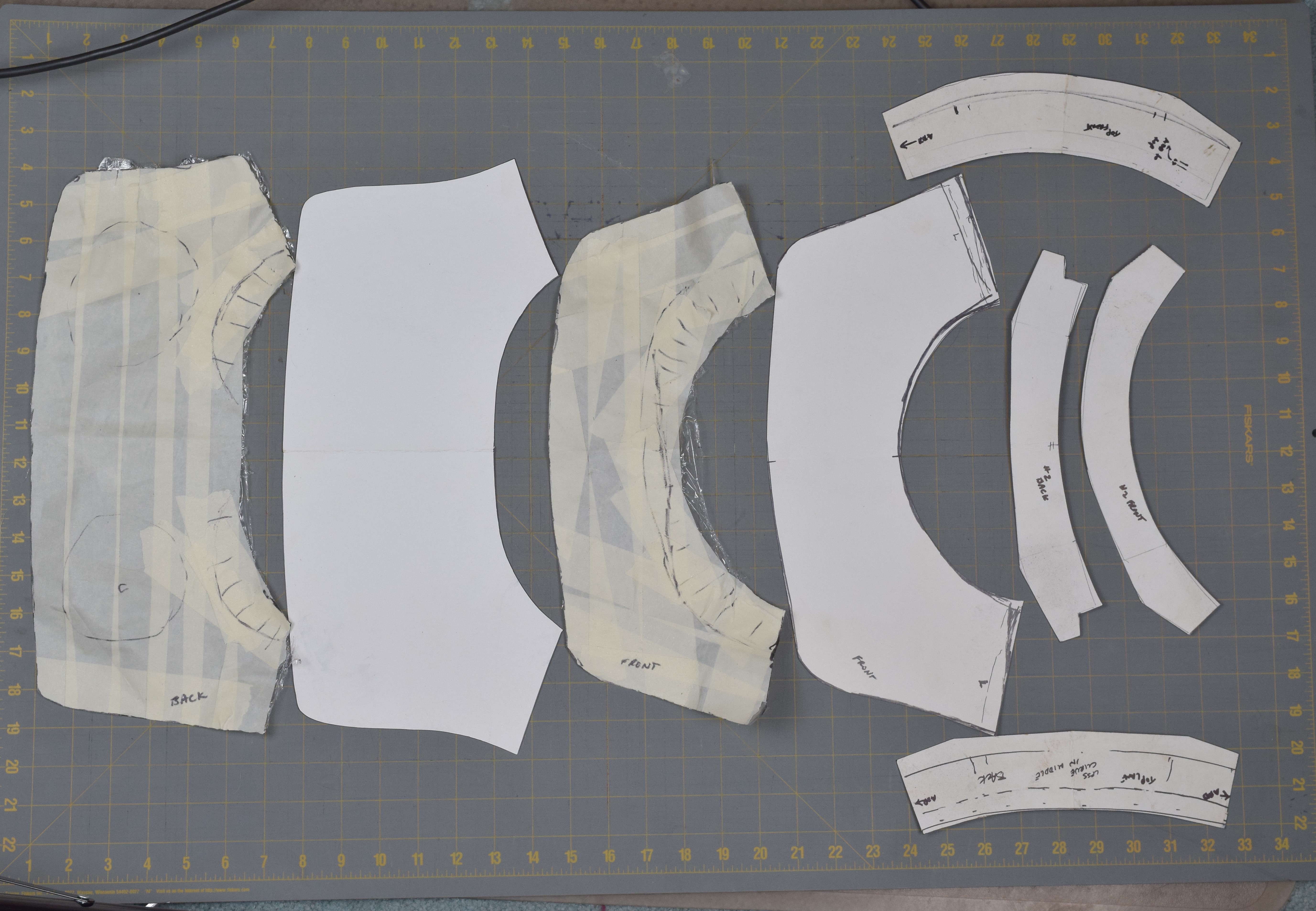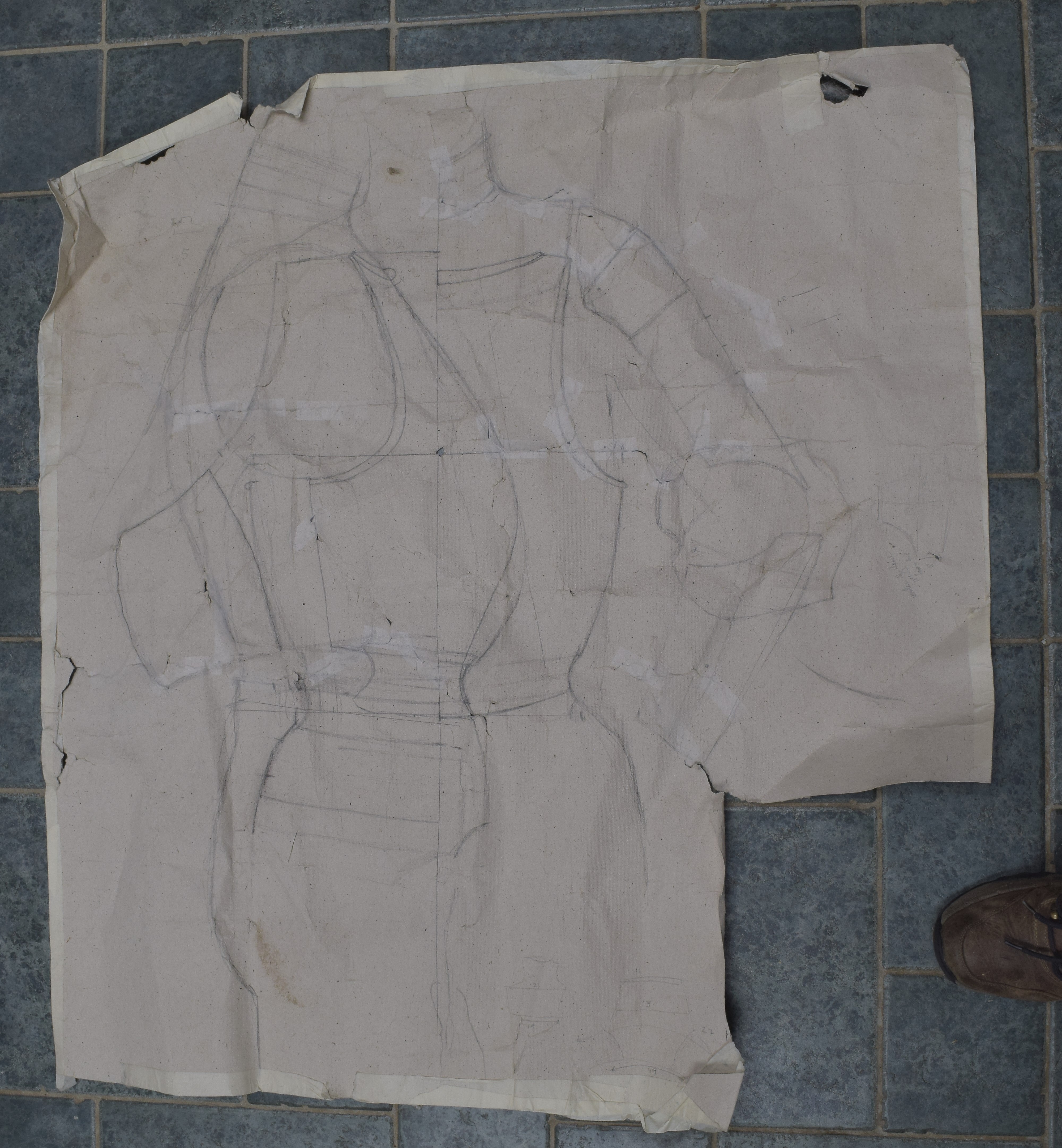 Gorget based on item number A-226. Patterns show the tape over plastic wrap that was used to pull the patterns directly from the original piece and the actual templates used to make the reproduction. They are on an inch scale. This piece, like the original, is designed to be assembled in a very atypical way. The neck lames are attached to the main plates with sliding rivets instead of leathers and the hinge is on the right instead of the left. Continuing the oddities, the main plates are not attached to each other except by the neck lames. I found the initial life-sized sketch I did for the project. This is a great way to work out details of the size and form without wasting a lot of steel. It would have been a lot better if I hadn't overlapped the front/back and side views. This makes the details hard to work out. The right side shows a front view of the planned gorget, breast and arms. The left includes a view of the planned backplate but also has the side view laid on top of it. If you look carefully you can see what was going on. I made the gorget, breast, back and arms. In the drawing you can see two different possible profiles for the breastplate. I guess I never really decided which one I liked, so the breast sort of went off the rails. As of 2023 it is still rough and unfinished. I moved on to a different breastplate designed to be used without a gorget instead. The profile view of rough armor on the fiberglass cast body double shows the "failed" breastplate.