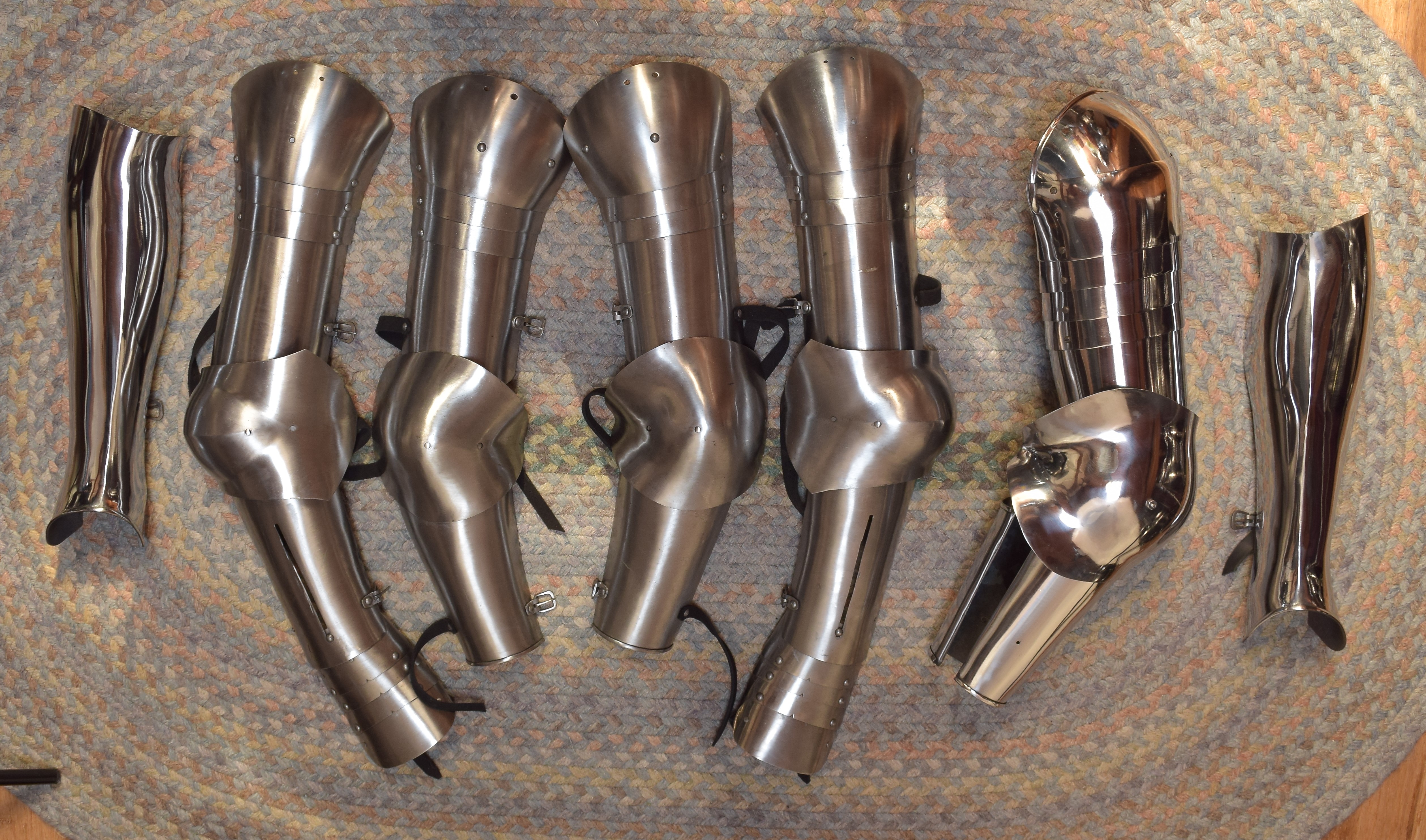 Consisting of spaulders, floating elbows and closed vambraces. Spaulder shaped to the shoulder formed of a large main plate with an additional plate above, three narrow lames and a large termial plate. Top two plates with a narrow inward turned roll at the top extending onto the front and back of the second plate. Lower plate shaped to the elbow. Large plain shell formed elbow cops extending app. 2/3 of the way around the elbow. Vambraces shaped to the elbow, formed of an inner and outer plate hinged by a pair of external hinges at the back and a strap and buckle at the front. Narrow outward turned rolls at the wrist and inside of the elbow.