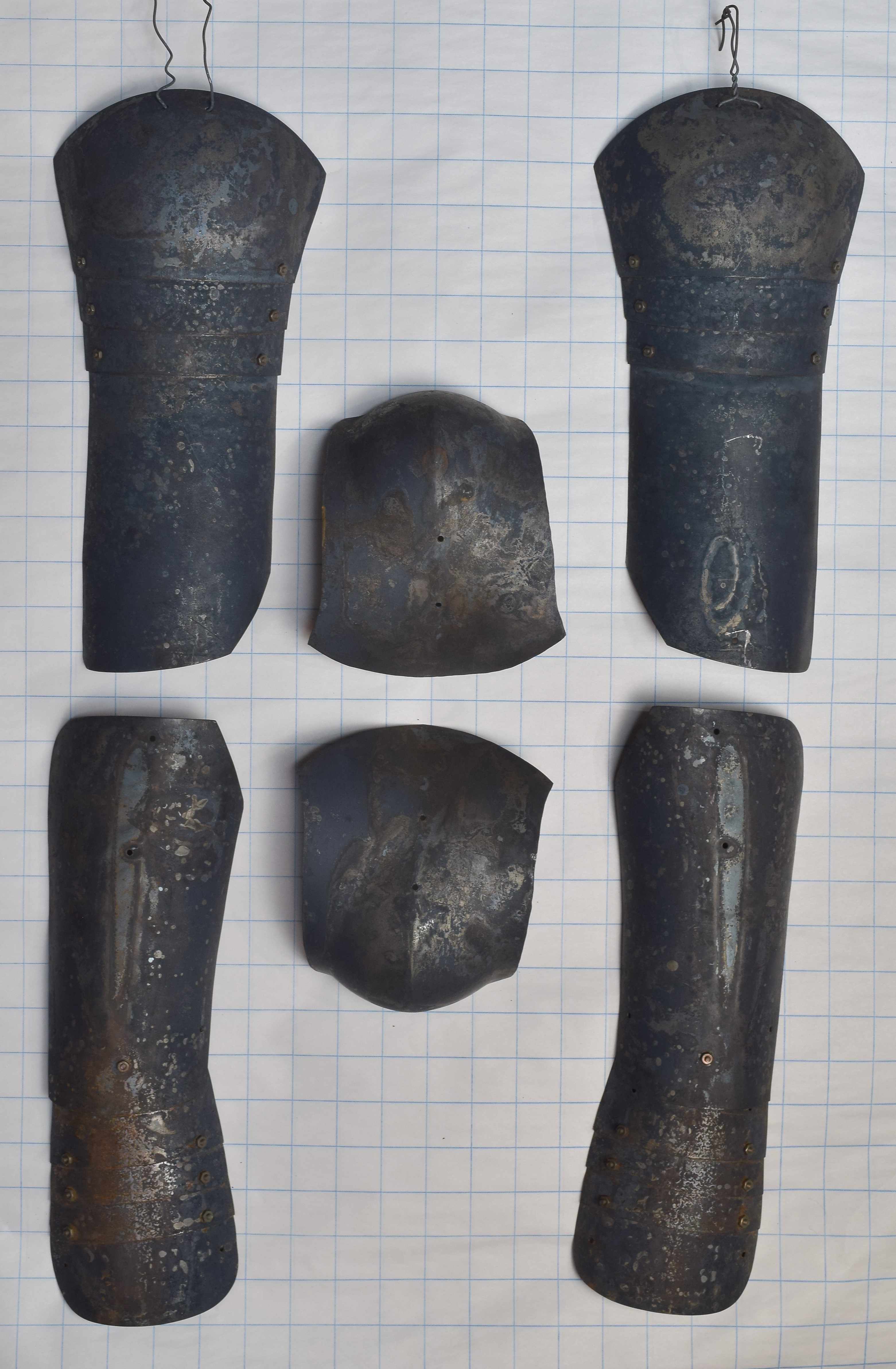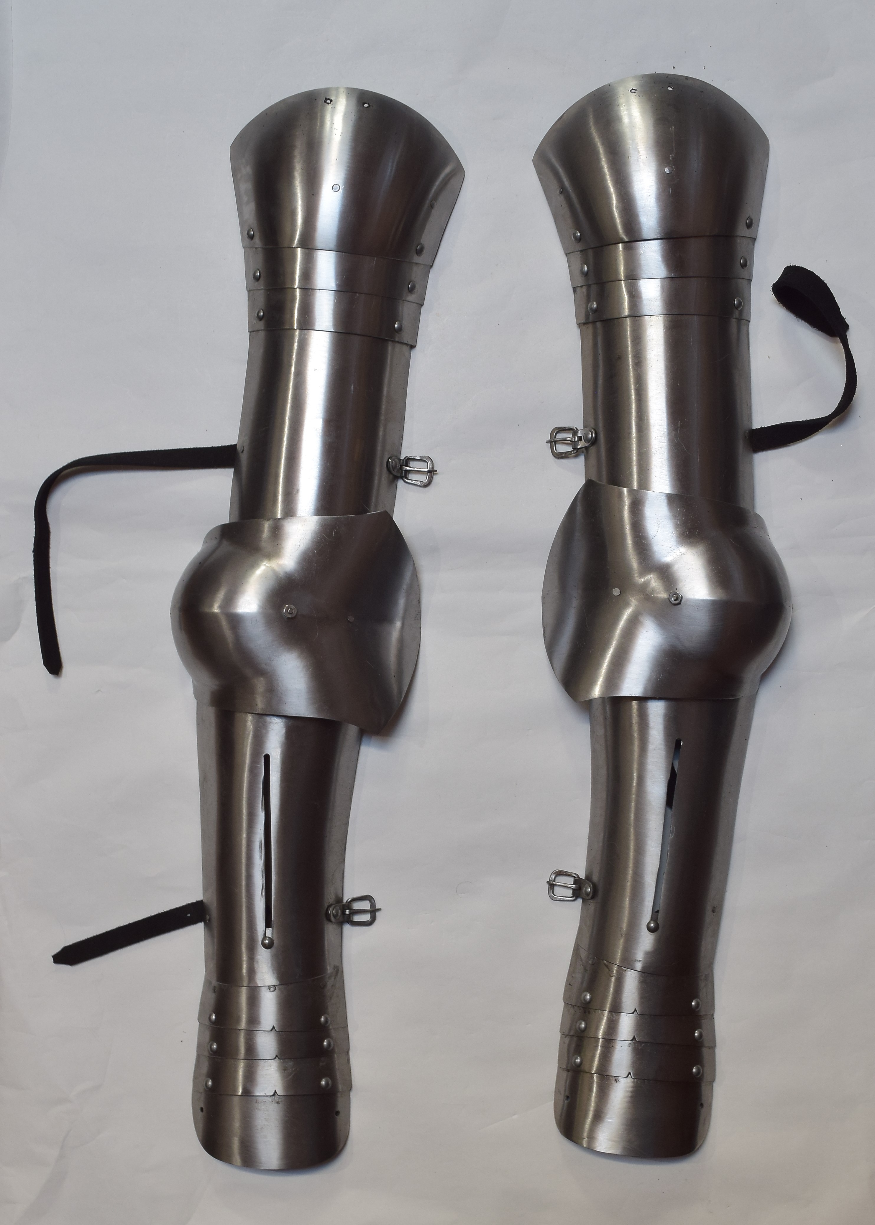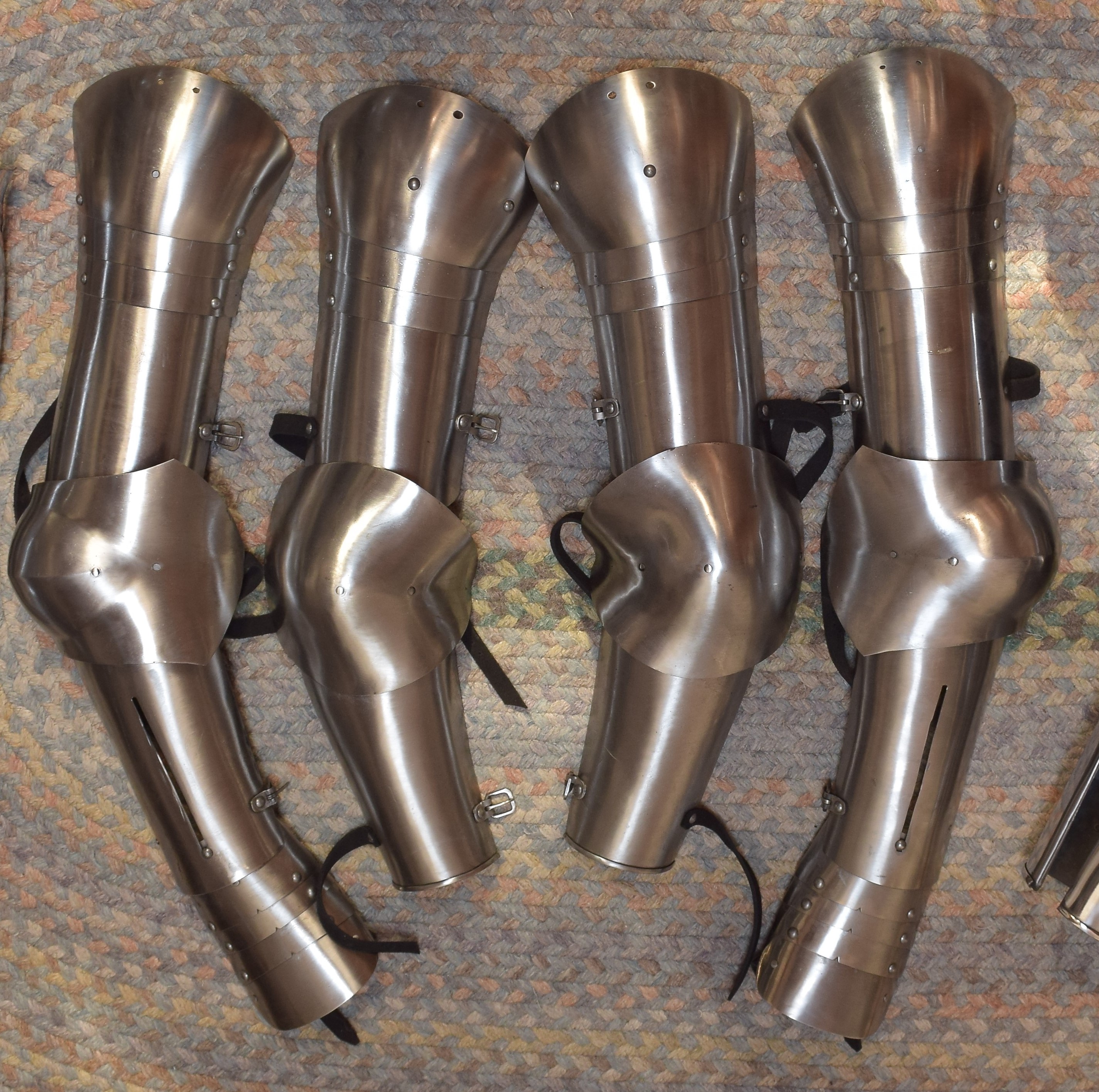 Simple form covering the outside of the arms. Consisting of a simple spaulder, floating elbow and one piece vambrace. Vambrace with integral protection for the back of hand secured to the vambraces with a rivet through a long slot. Made by Wade Allen in 2022-2023. Heat treated 1050.