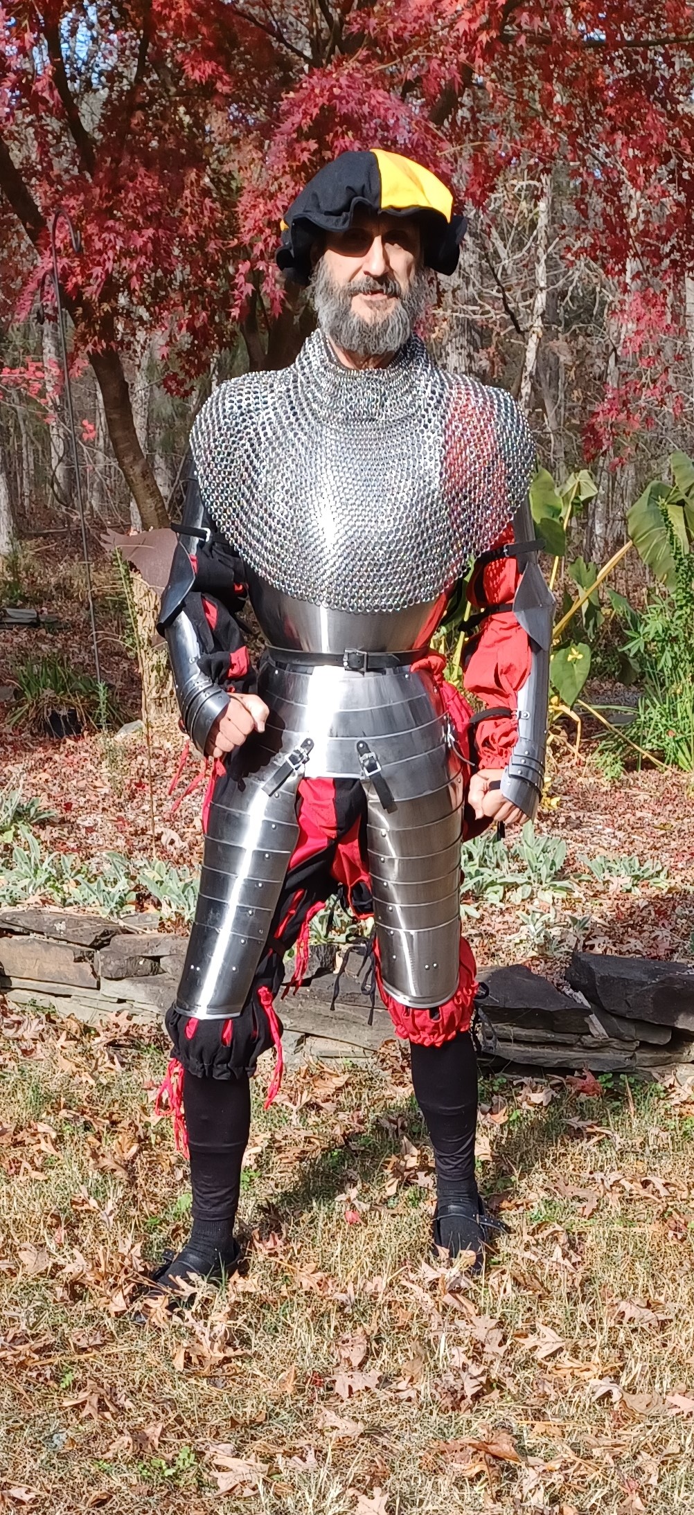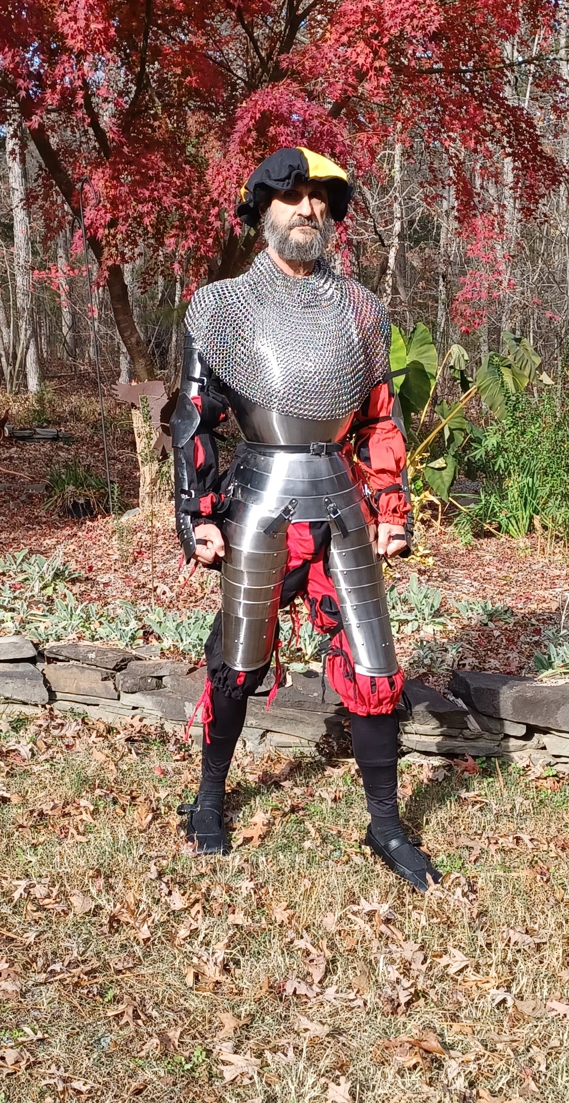 Breast of plain rounded form with large angled inward-turned roll at the neck and small inward-turned rolls at the arm holes. Fauld of 3 lames, the terminal lame with a narrow inward turned roll at the lower center. Back plate of three pieces, one large central plate with small plates extending under the arms. Tassets. Armour by Wade Allen 2023 (back plate designed and formed for use with a different breastplate in 2018) in 2023. Heat treated 1050. Buckles by Clang Armory. Worn with a cheap costume from Medieval Collectibles. Mail is an old aventail used to simulate a bishop's mantle. It's not right at all, but it fills in some gaps nicely. The pictures show me wearing the breast, back and tassets along with item number R-51.