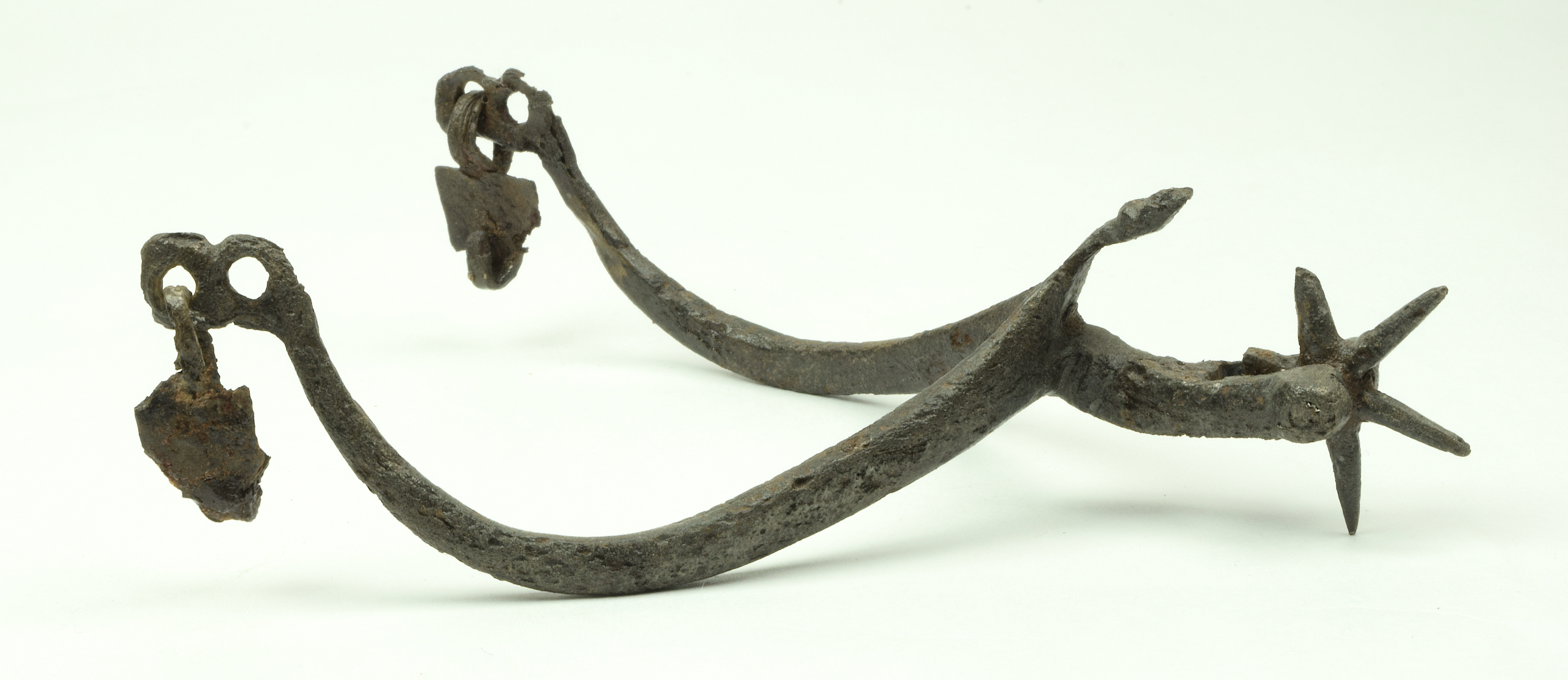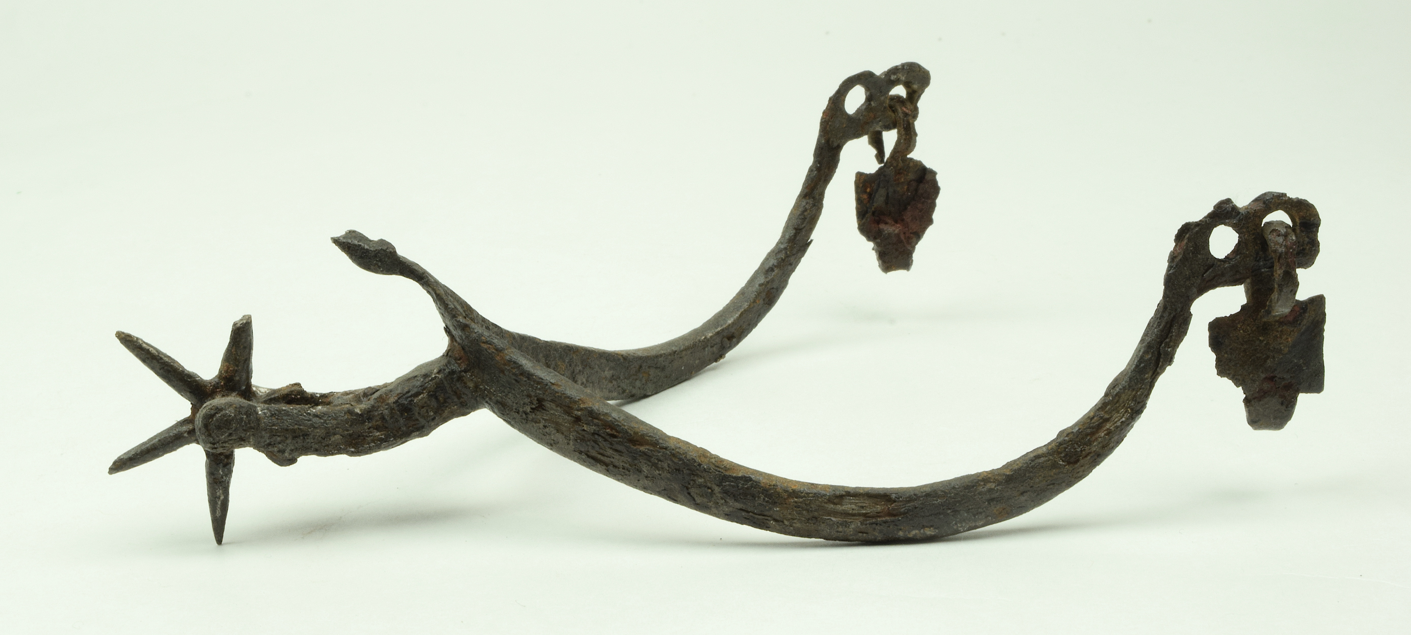 Iron. flattened half-round profile arms tapering toward the terminals. down turned at the center, each of curved form. Terminals of figure 8 form retaining the lower strap mounts on each terminal. Short up-curved stalk for the rowel. Rowel is a delicate 6 pointed form. Extension to the body at the center is drawn up into a decorative terminal of a simple acorn form.